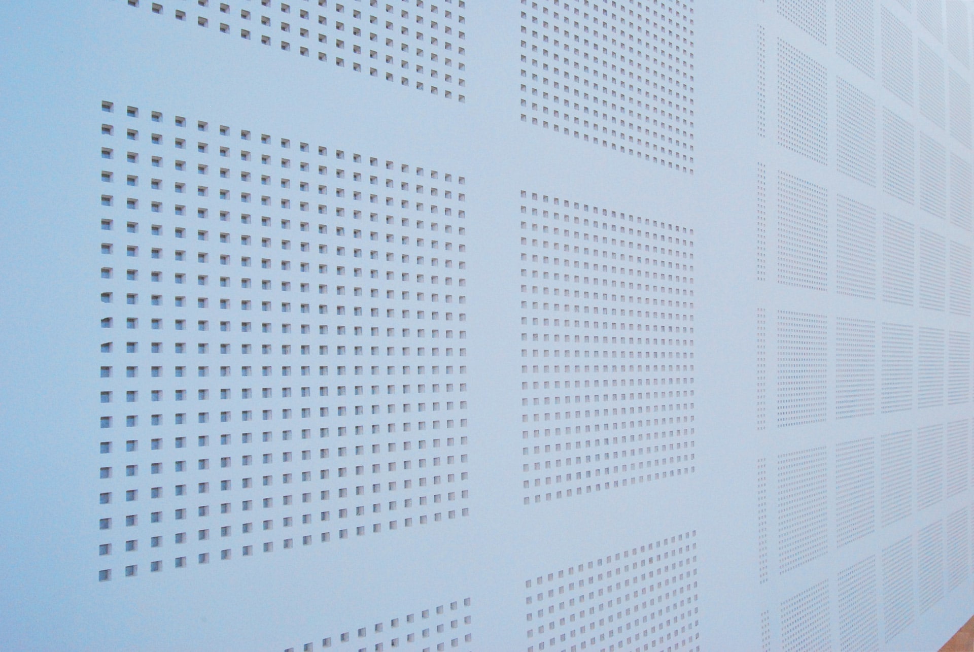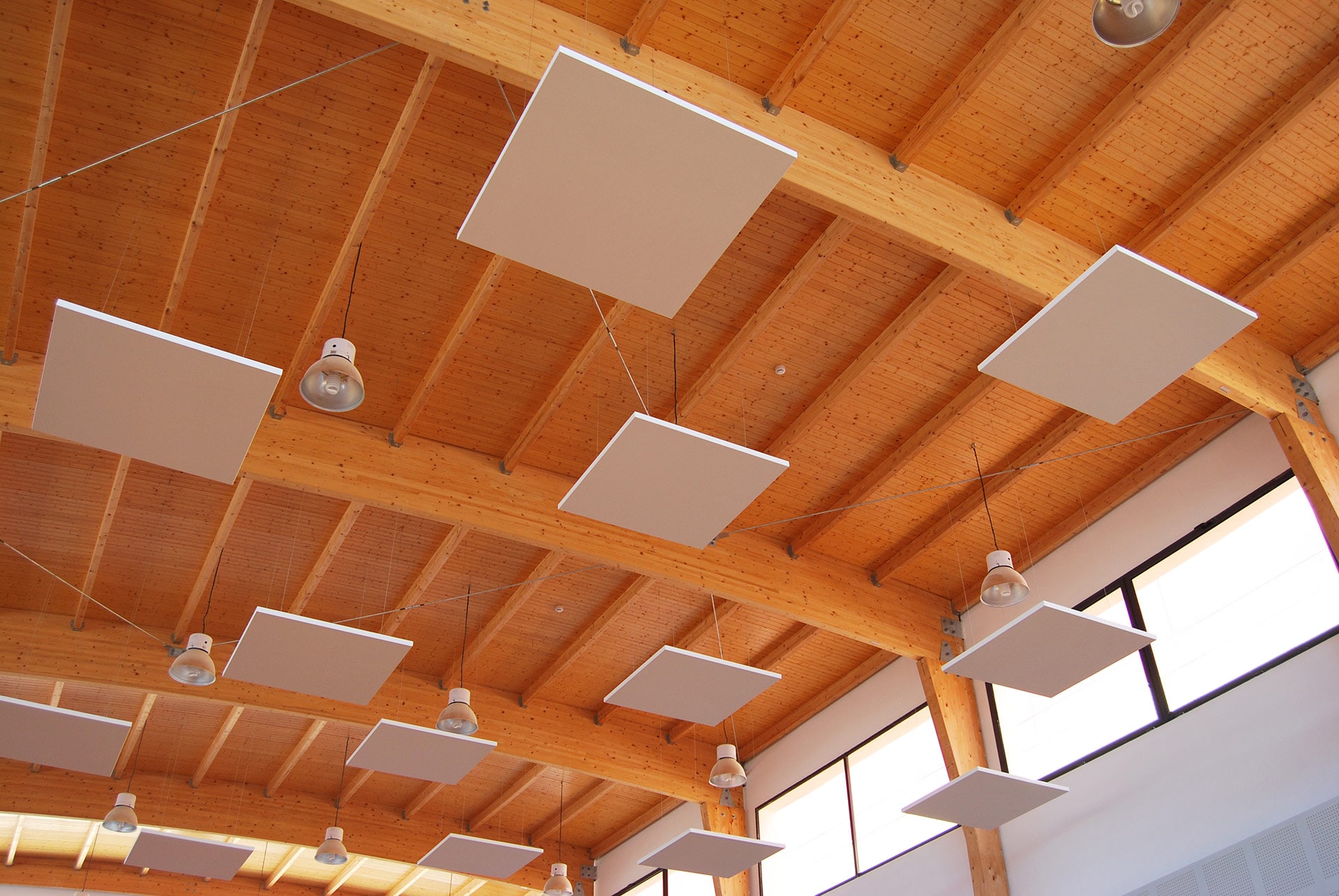 Por una parte colocamos un trasdosado de cartón-yeso perforado con lana de roca en el fondo de la sala, en los laterales y por detrás del escenario. Por otra parte, desde la cubierta descolgamos 40 islas acústicas, que nos acotan la altura, pero nos dejan ver la cálida cubierta de madera.