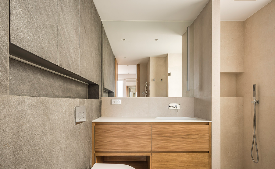 Segmentos de pared de ladrillo visto otorgan un toque y visión contemporánea al conjunto. Los baños mantienen el carácter sobrio de la vivienda pero con toques únicos.