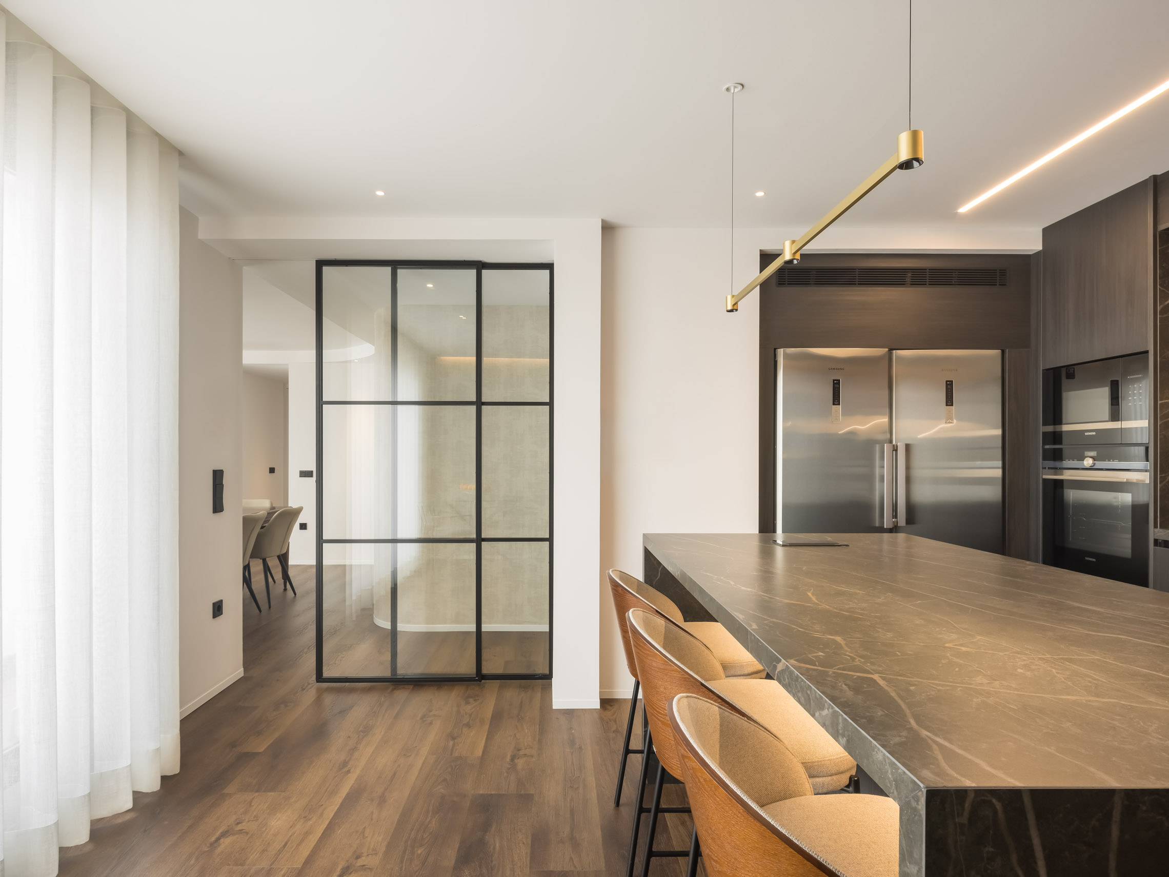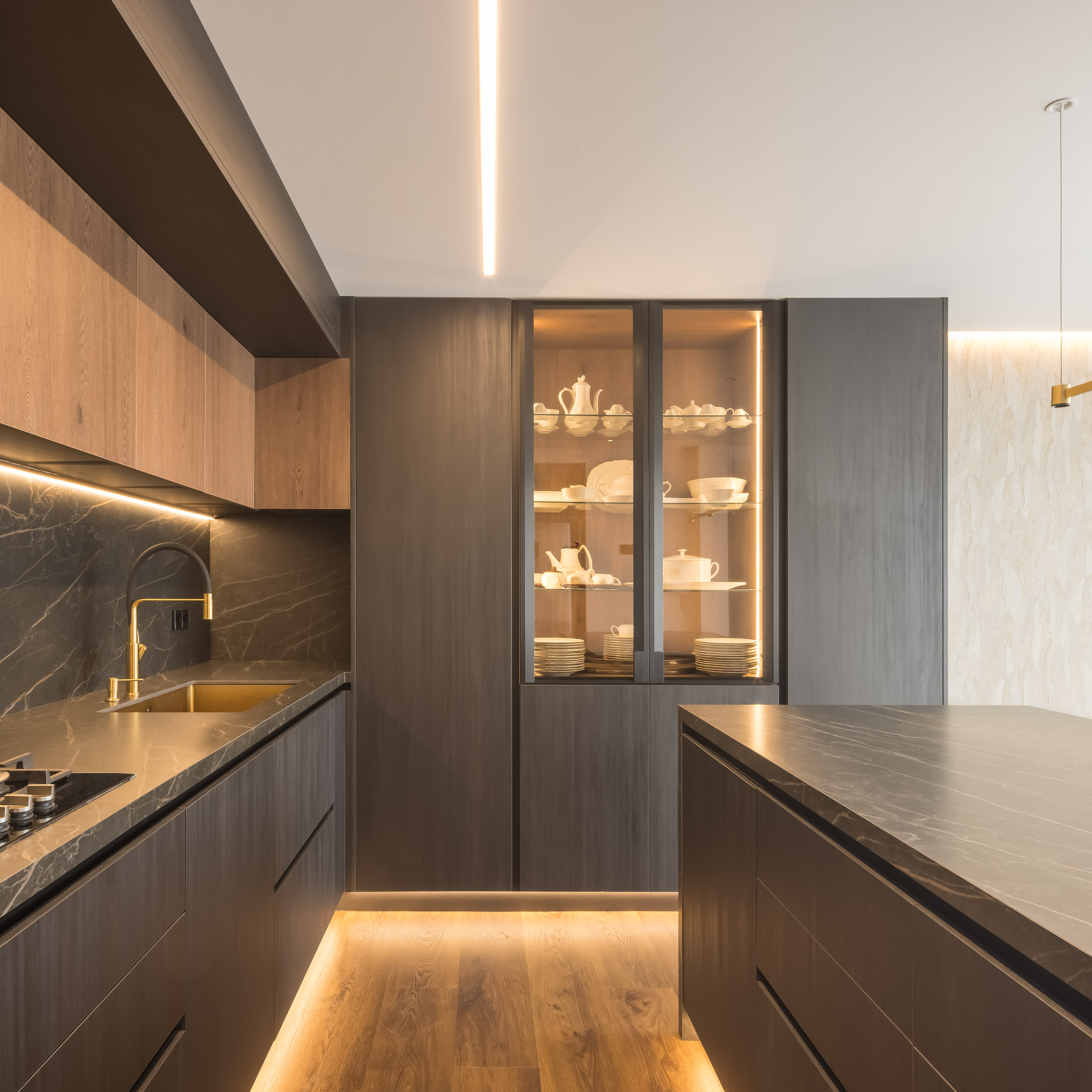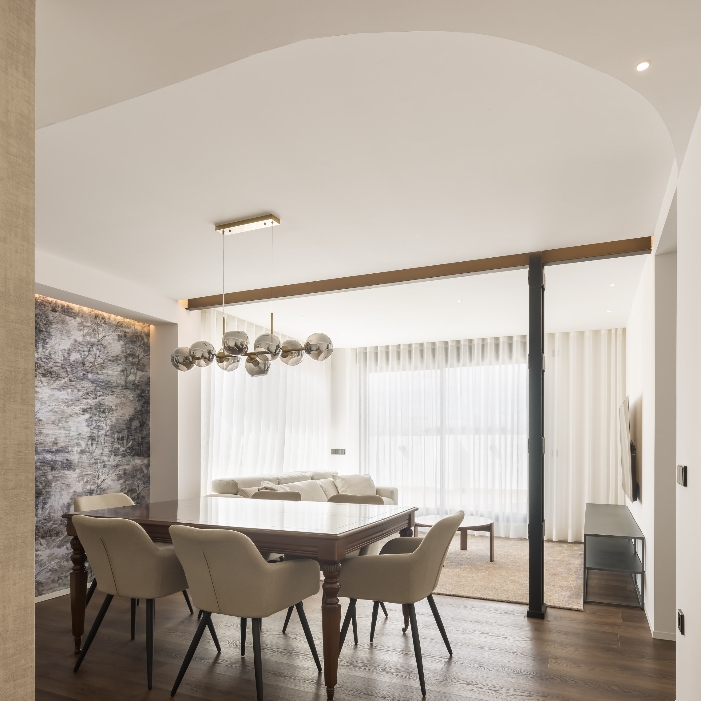 En el salón podemos apreciar el techo en forma de curva, uno de los elementos más diferenciales de Vimarvi, con el que conseguimos un dinamismo muy especial. De forma contínua a este espacio, nos trasladamos a la cocina. Esta se encuentra separada del salón mediante una puerta corredera de tonos oscuros, dejándonos ver un contraste muy interesante. La encimera de Neolith y la luz Art de Arkoslight crean un ambiente cálido que combina perfectamente con el color roble oscuro del suelo y la vitrina iluminada.