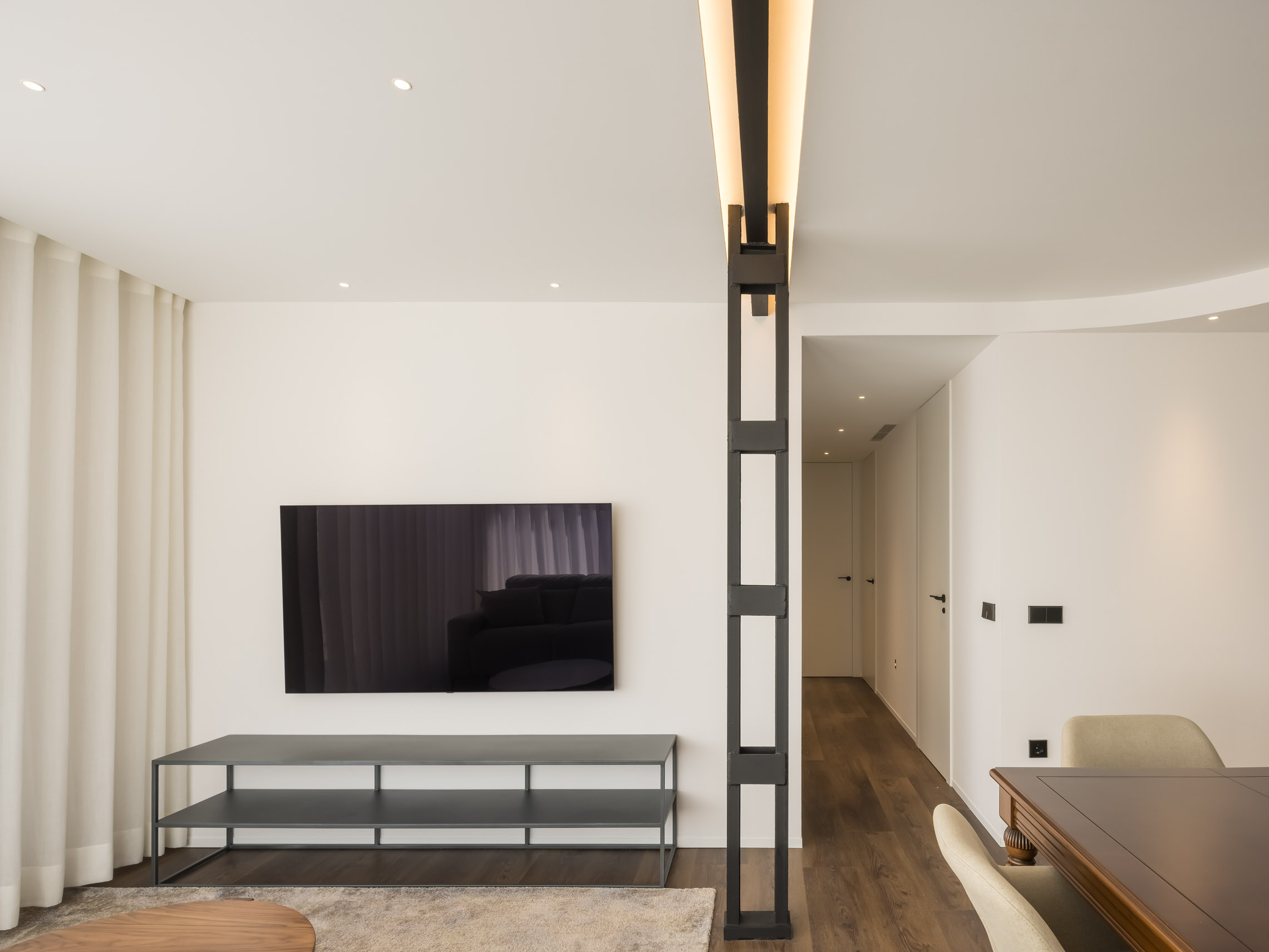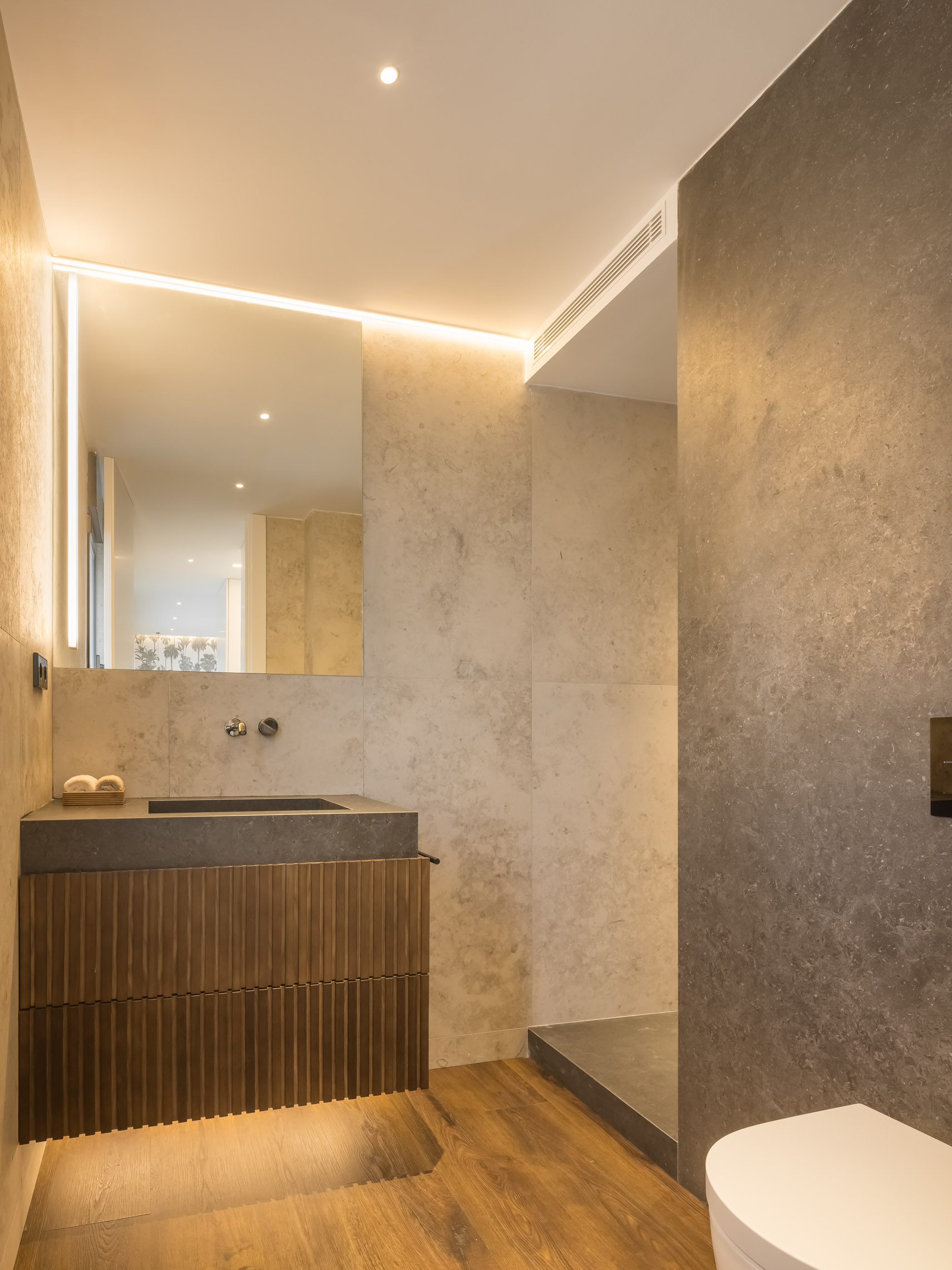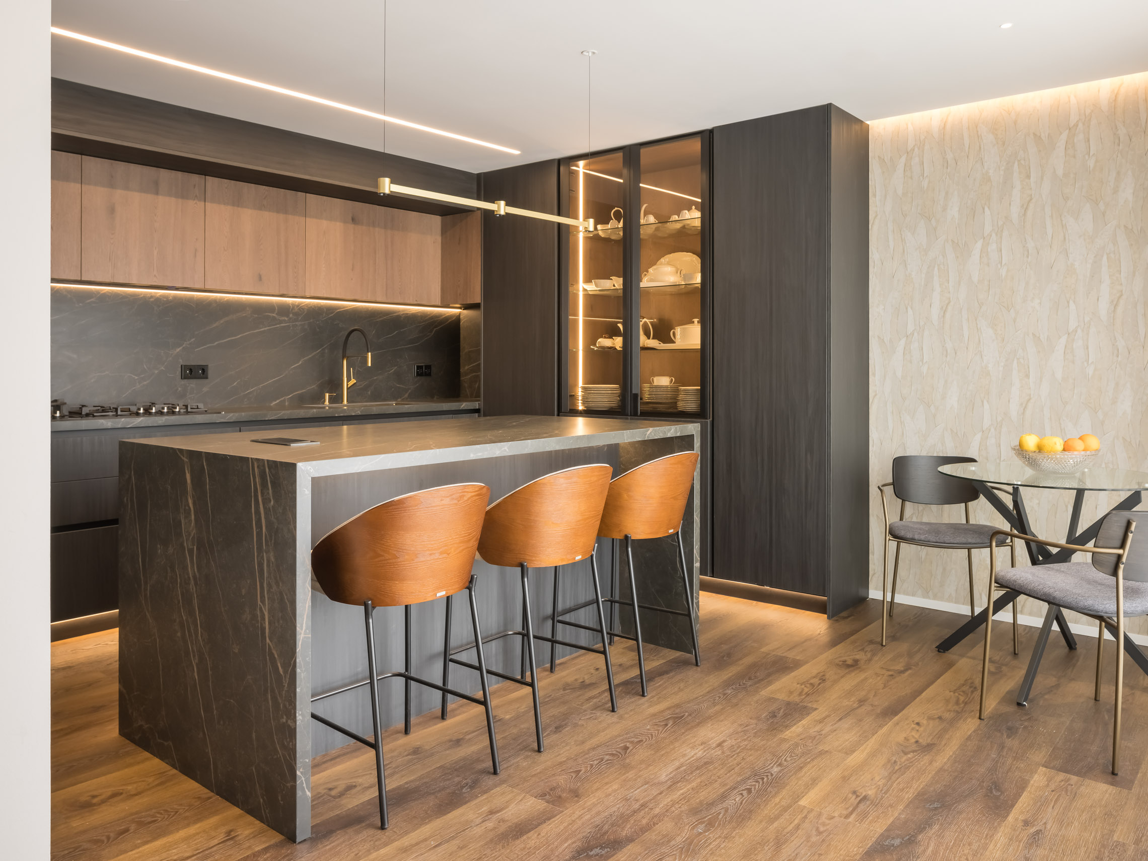 En el salón podemos apreciar el techo en forma de curva, uno de los elementos más diferenciales de Vimarvi, con el que conseguimos un dinamismo muy especial. De forma contínua a este espacio, nos trasladamos a la cocina. Esta se encuentra separada del salón mediante una puerta corredera de tonos oscuros, dejándonos ver un contraste muy interesante. La encimera de Neolith y la luz Art de Arkoslight crean un ambiente cálido que combina perfectamente con el color roble oscuro del suelo y la vitrina iluminada.