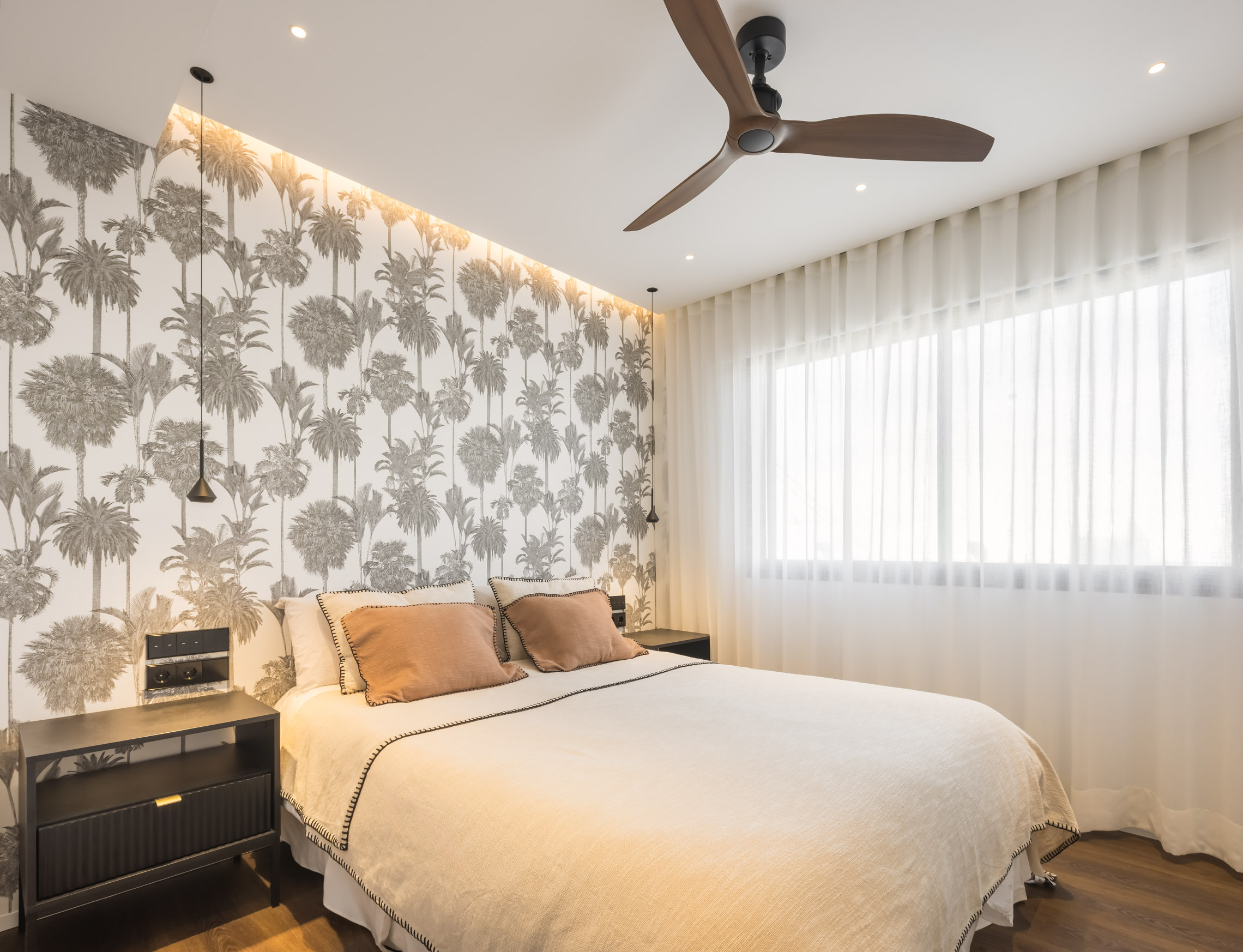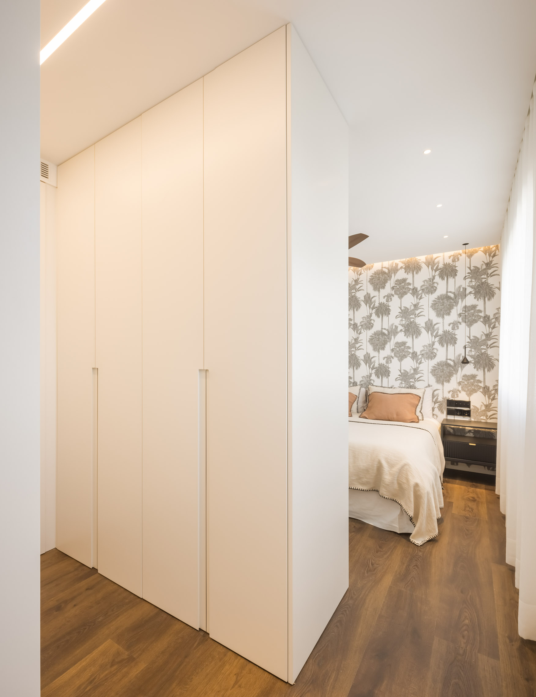 Si continuamos nuestro paseo por la casa, llegamos hasta el dormitorio principal. Un espacio íntimo y acogedor en tonos claros que cuenta con un papel en la pared con estampado natural, que transmite calma. Con el objetivo de hacer más íntima esta estancia del resto de la casa, se optó por delimitarla al pasillo con un armario. Justo en esta zona se abre un espacioso baño, elegante y lleno de detalles.