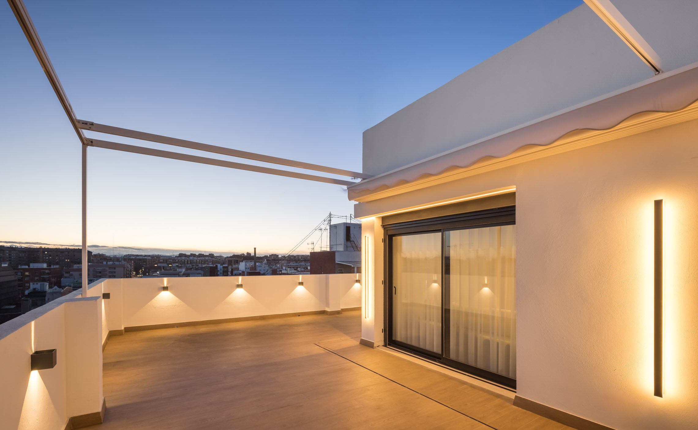 El broche final a este recorrido lo pone la terraza con vistas a la ciudad. Un sitio muy especial y tranquilo que por la noche queda iluminado de forma sutil por las barras de luz en las paredes.