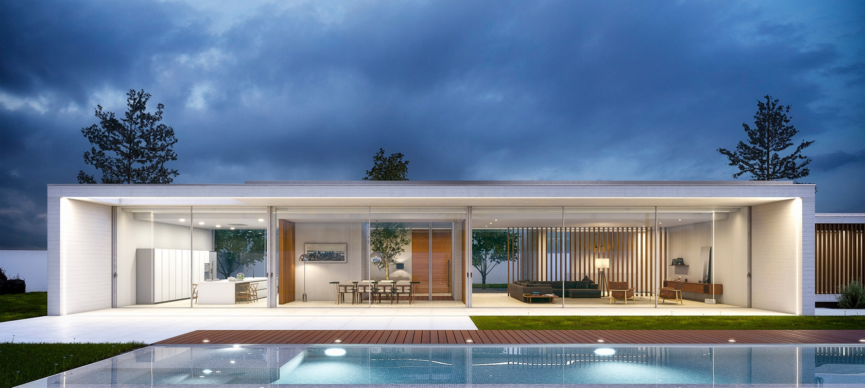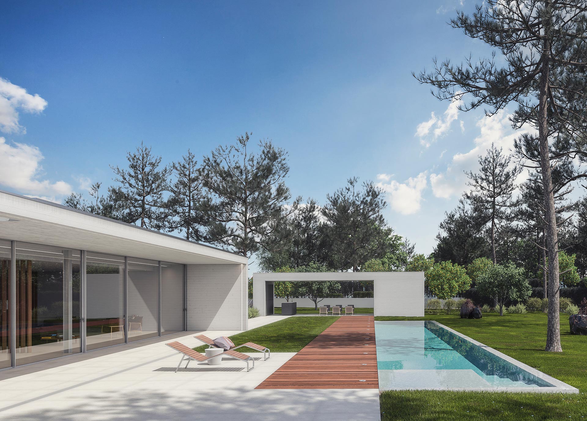El primer volumen contiene la zona de día. En él se incluye el salón, el comedor y la cocina, limitados a través de celosía y el patio conectados visualmente debido a su transparencia. Con ello aportamos amplitud, profundidad y visuales hacia el exterior. Por otra parte, en el otro volumen contiene la zona de noche. Este mismo aloja el dormitorio principal y dos dormitorios y un estudio en planta sótano que se abre a una gran plaza exterior enterrada.