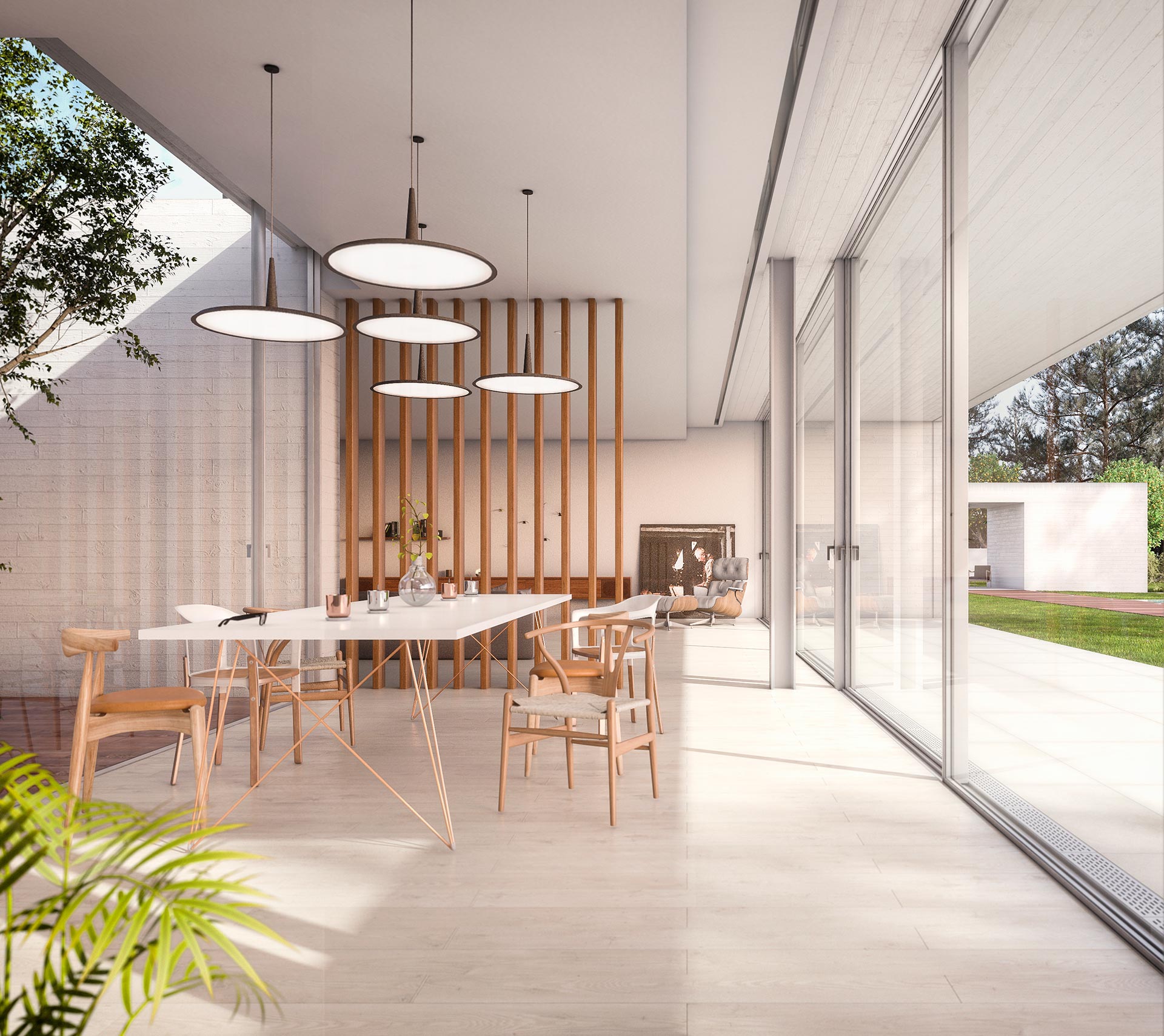 La materialidad es imprescindible en el proyecto. Celosías de madera limitan los diferentes espacios de día junto el patio que inunda de luz el espacio de circulación. Gracias a ello en este proyecto de construcción e interiorismo se crea un ambiente que marca el trayecto a las diferentes áreas.