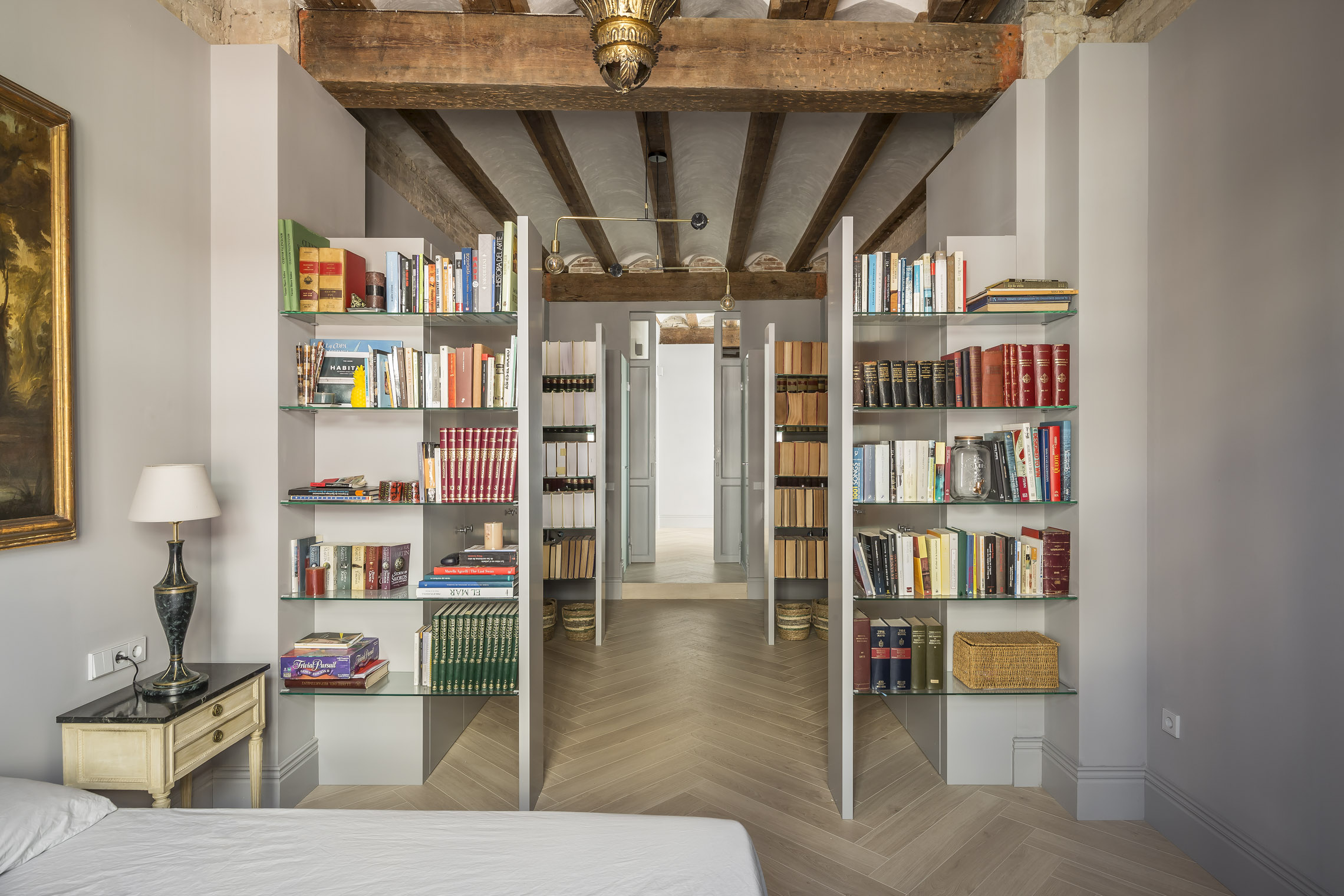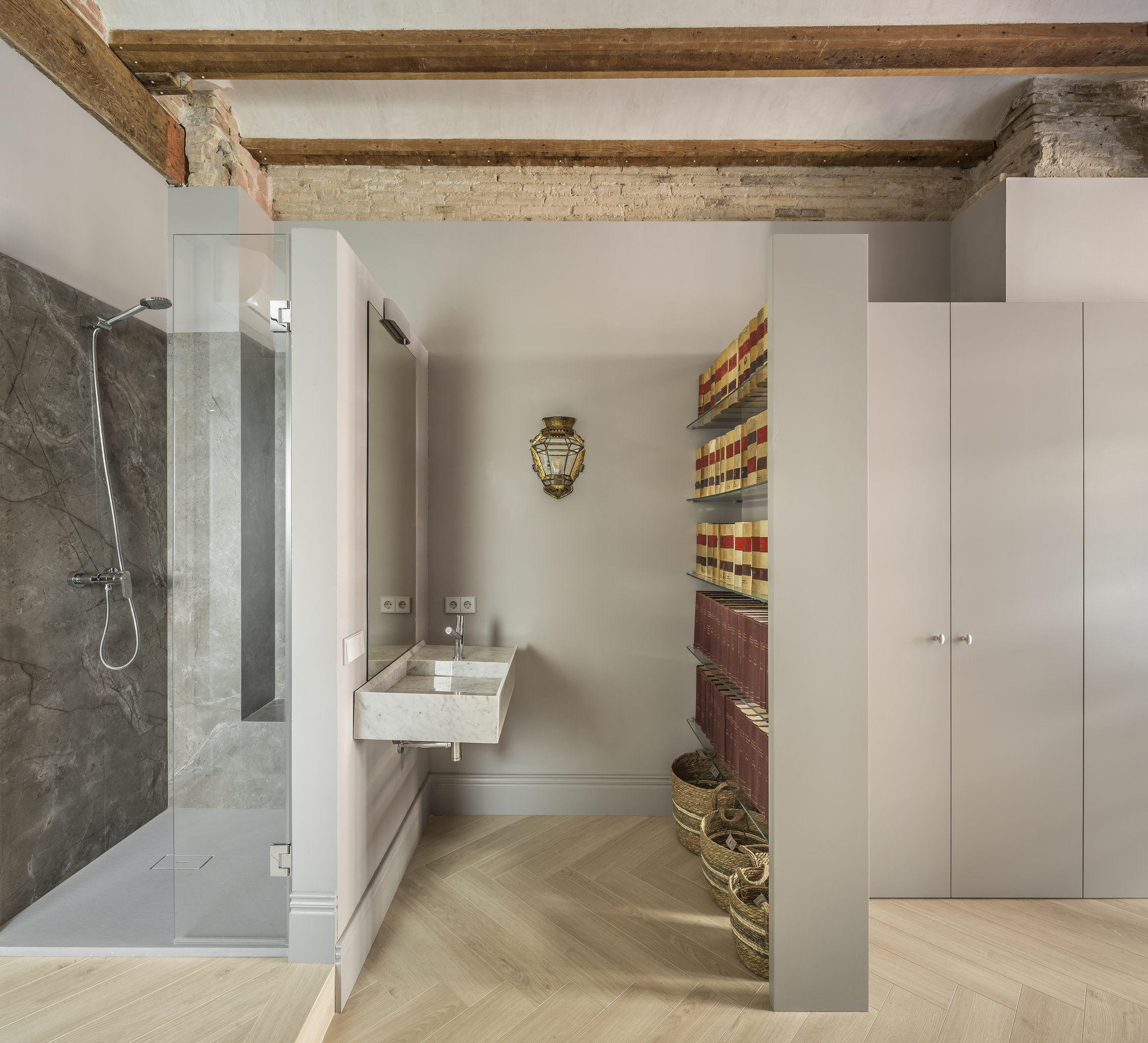 En cuanto al diseño de interiores, ARQUITECTOS VIMARVI abarca la disciplina creando un espacio interior basado en un espacio personalizado para el cliente. El diseño interior pertenece a un estilo neoclásico a través de un mobiliario que sintetiza la arquitectura tradicional, unificado a través de diferentes tipos de gris y suelo en espiga. La puerta corredera que une la cocina y el dormitorio principal se restauró, siendo un elemento original de la vivienda y dotando al espacio de una mayor autenticidad. Los lavabos son piezas pétreas de mármol diseñadas y realizadas exclusivamente para el cliente.