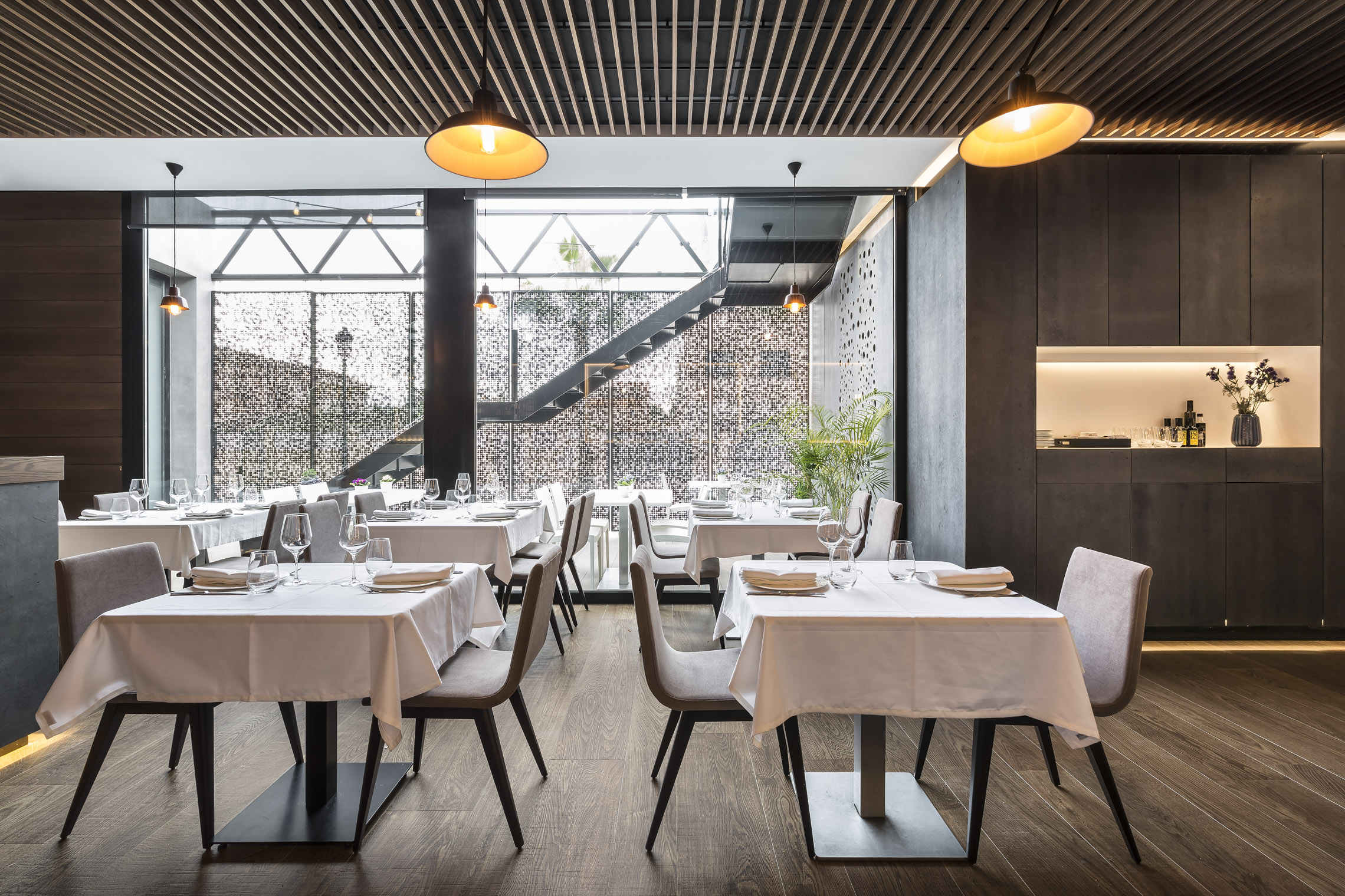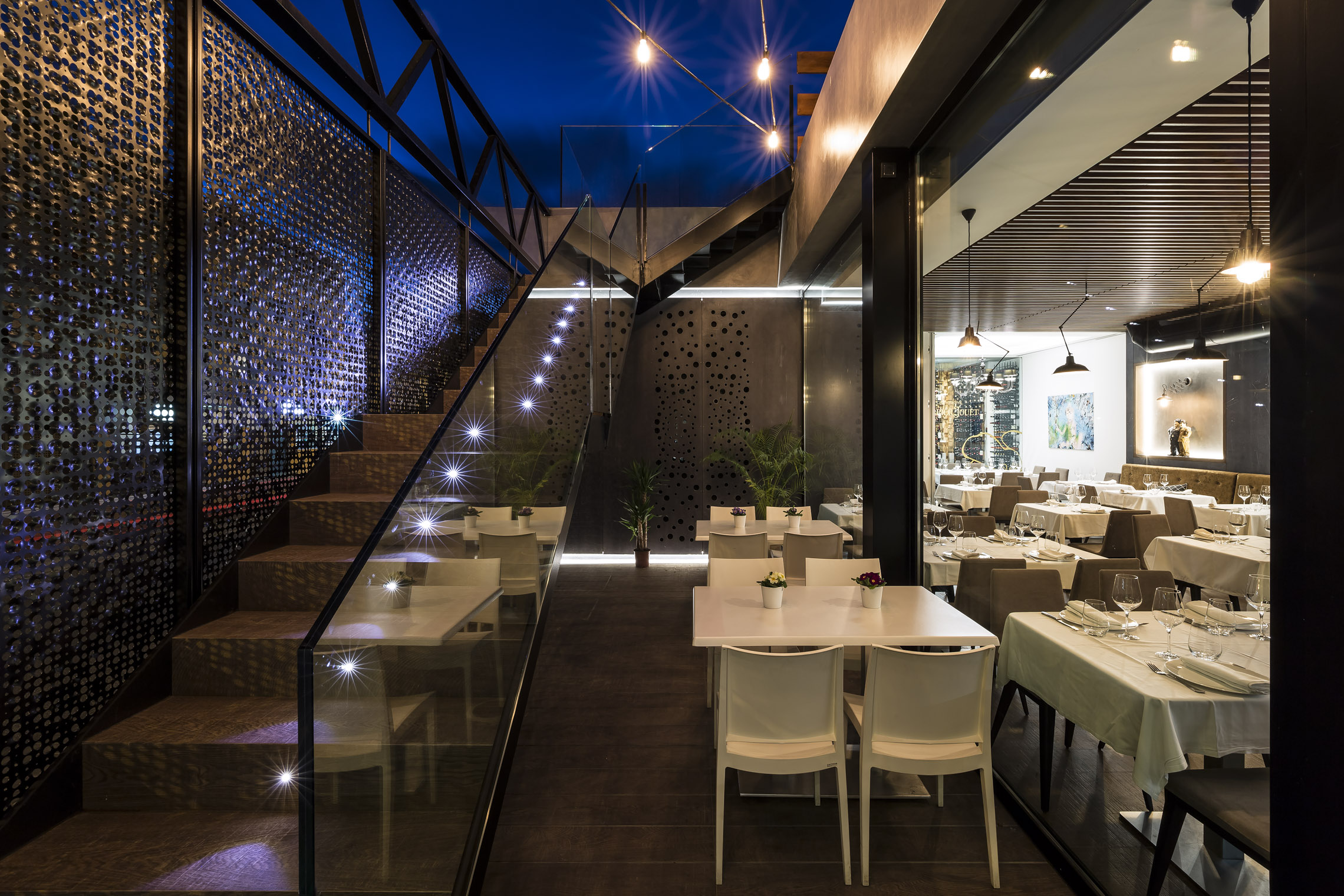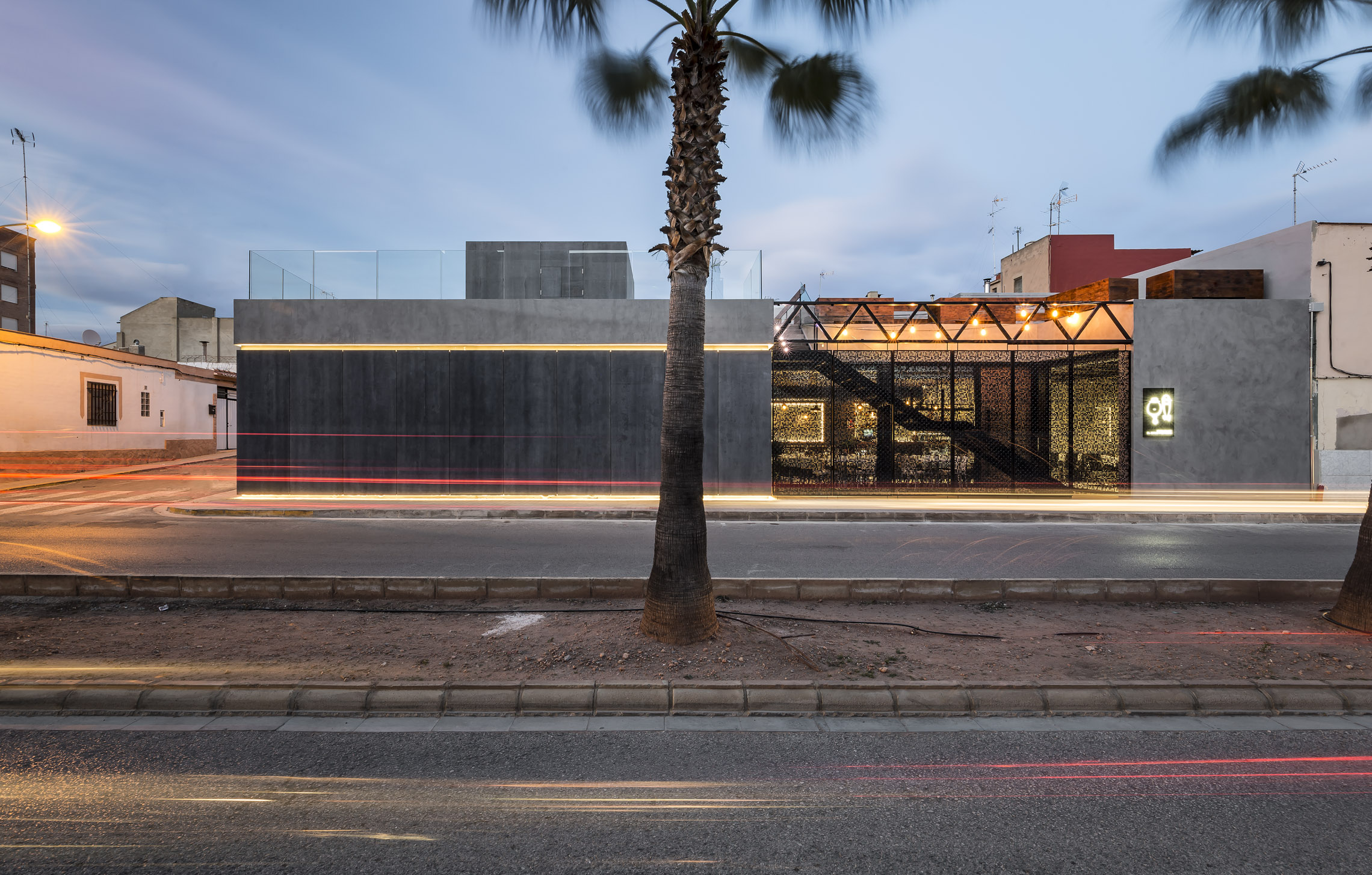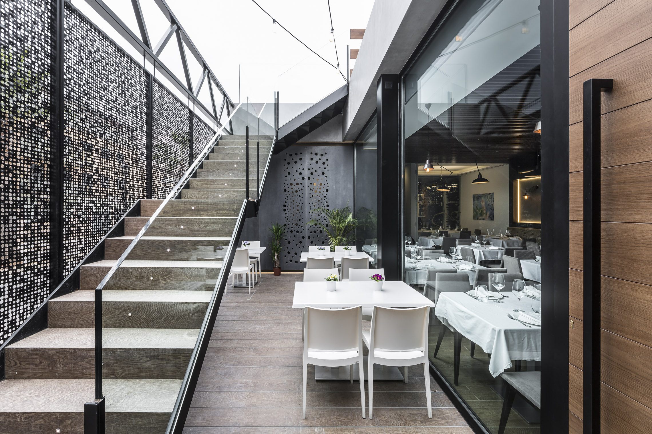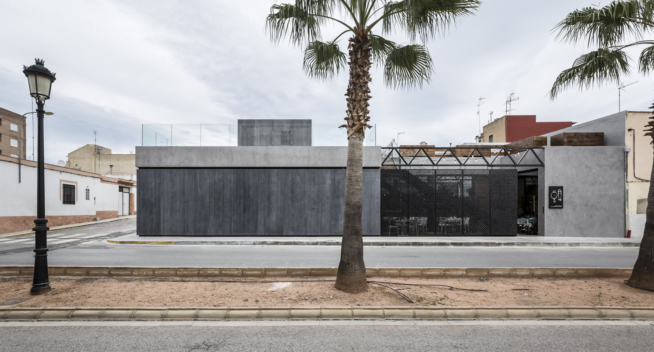 Para ello, se demuele la vivienda antigua que ocupaba la parcela y se construye un nuevo edificio. Esta nueva oportunidad hace que pueda aparecer un patio de entrada que posibilite tener un filtro con la vía pública, algo muy difícil en negocios situados en planta baja, y poder abrir grandes ventanales que iluminen el salón principal. En en este patio donde se ubica la escalera de subida a la terraza superior, donde se ubica una barra cerrada comunicada con la cocina.