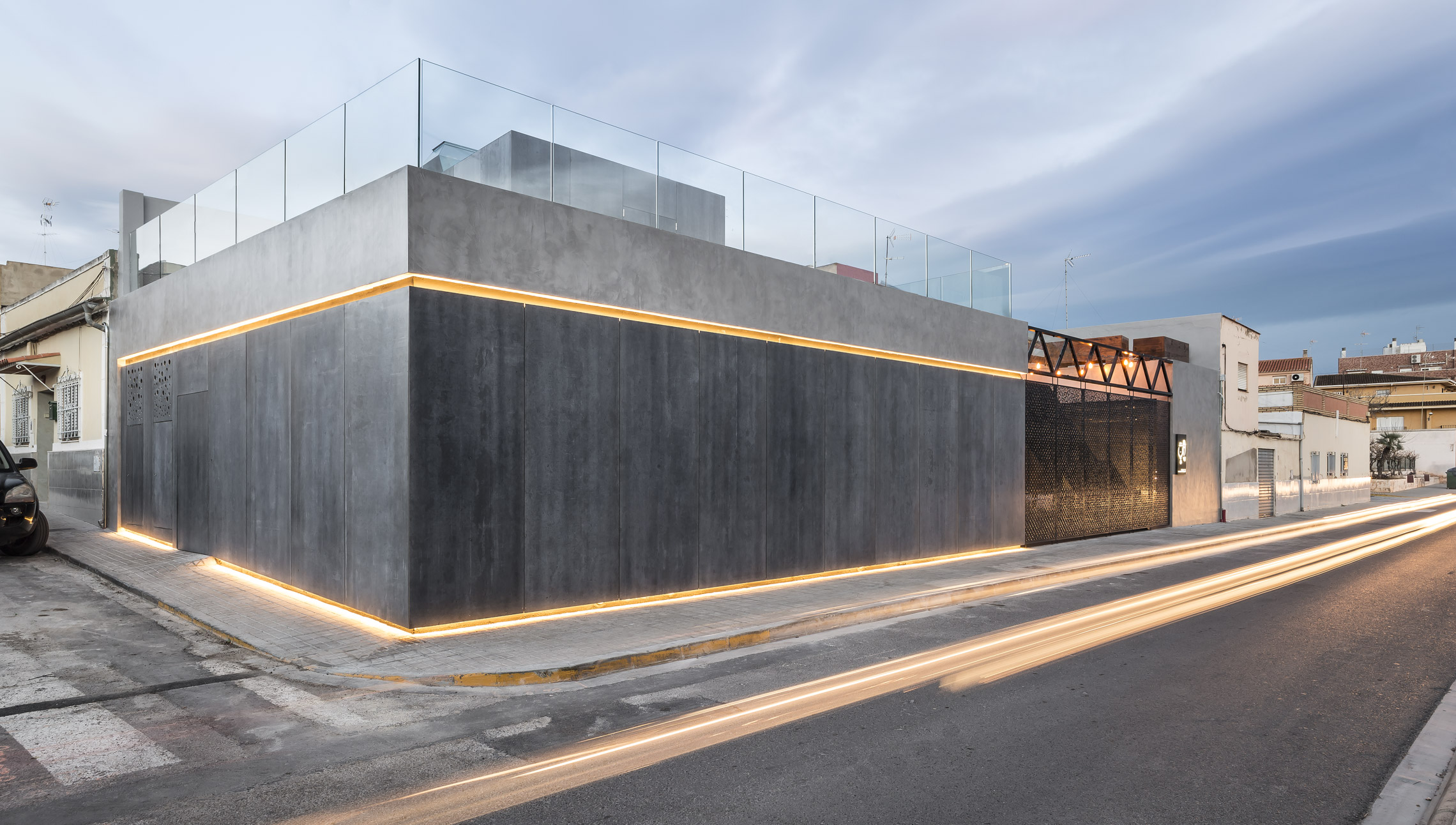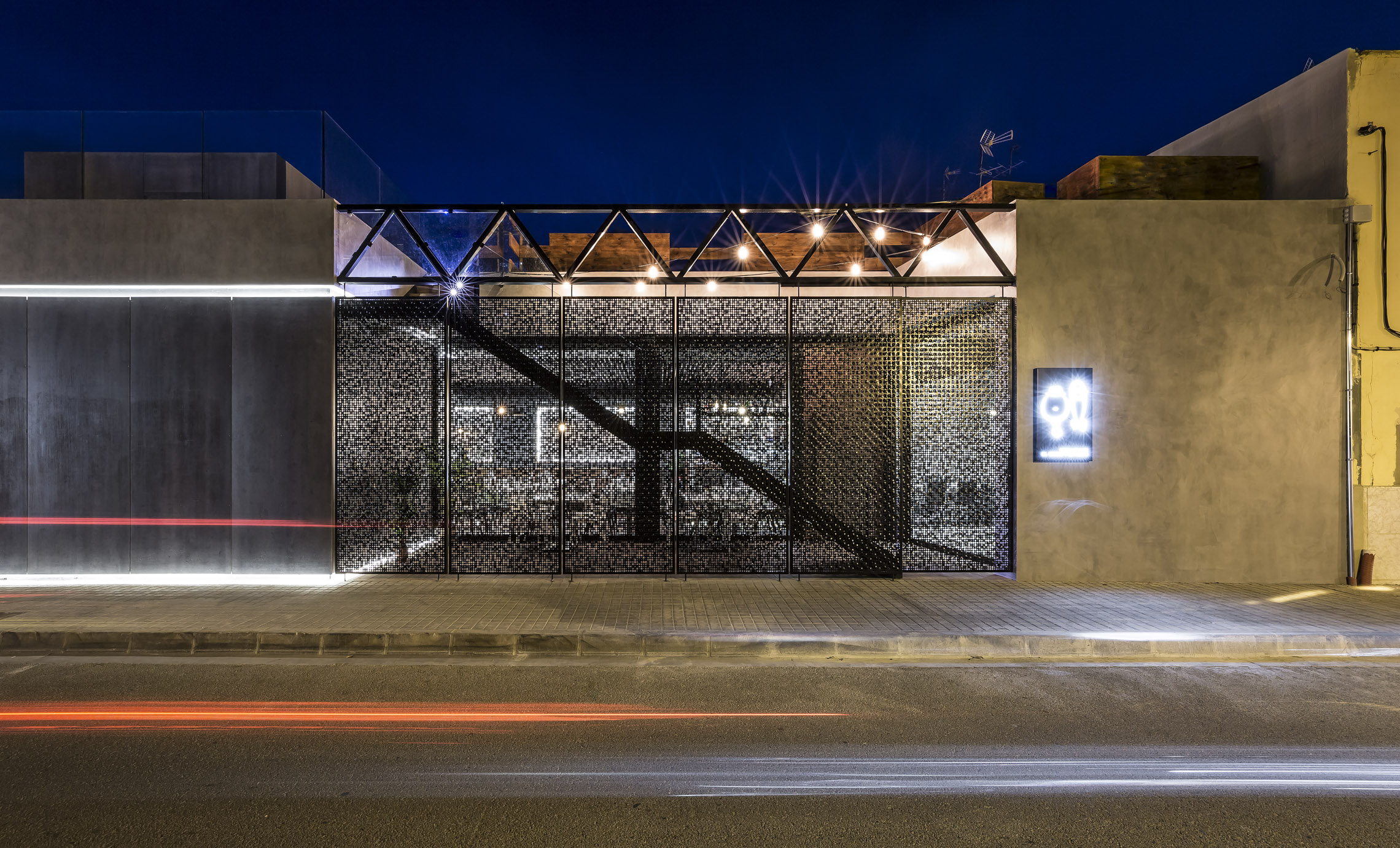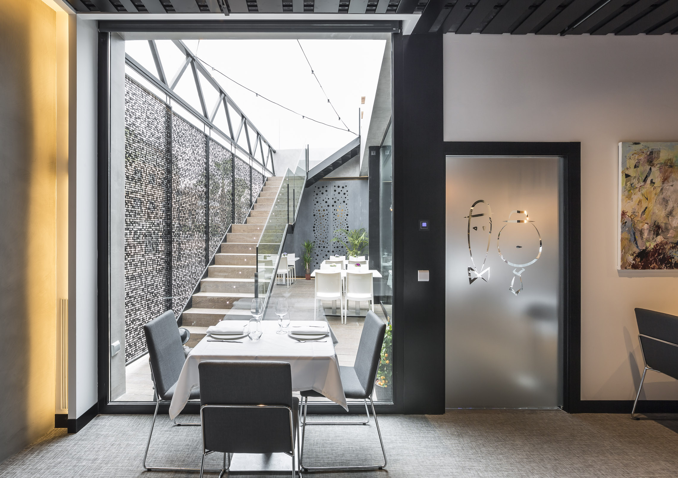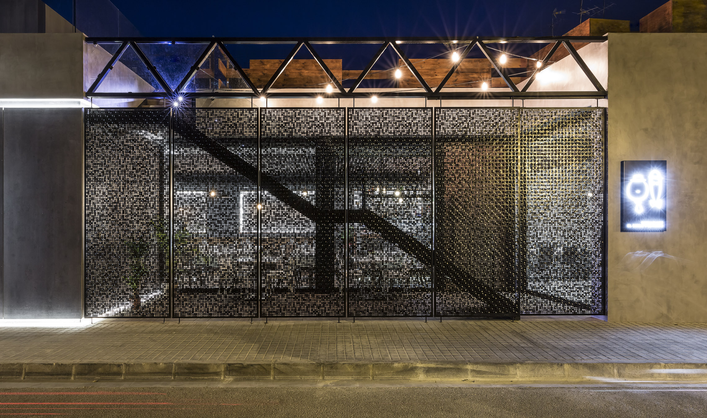 Para ello, se demuele la vivienda antigua que ocupaba la parcela y se construye un nuevo edificio. Esta nueva oportunidad hace que pueda aparecer un patio de entrada que posibilite tener un filtro con la vía pública, algo muy difícil en negocios situados en planta baja, y poder abrir grandes ventanales que iluminen el salón principal. En en este patio donde se ubica la escalera de subida a la terraza superior, donde se ubica una barra cerrada comunicada con la cocina.