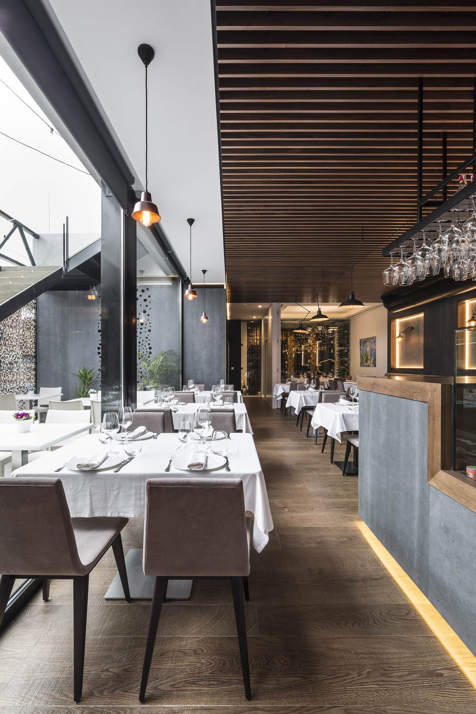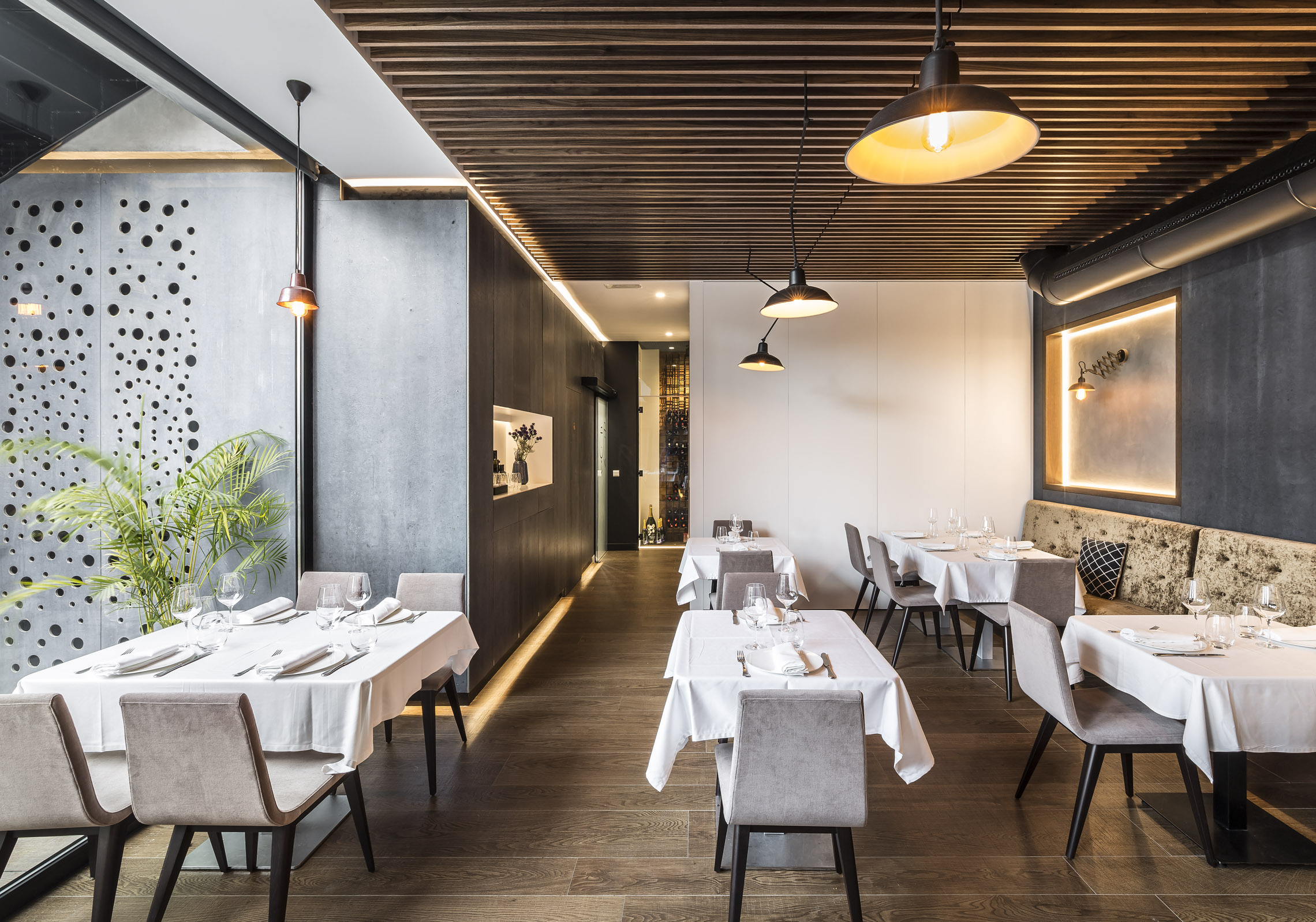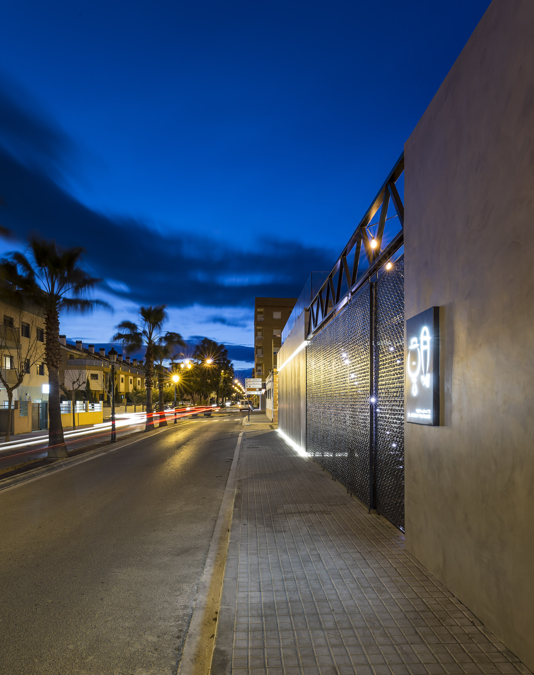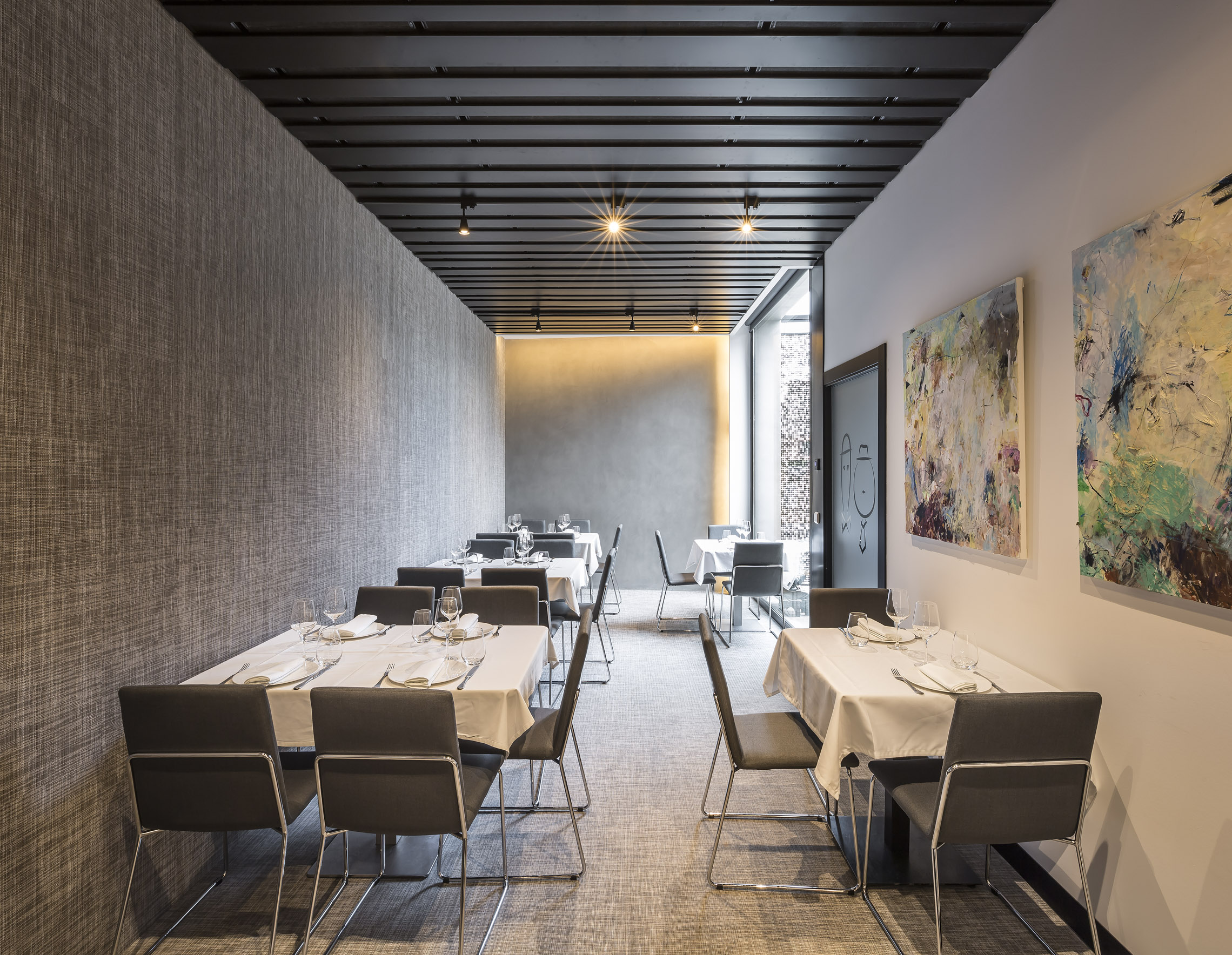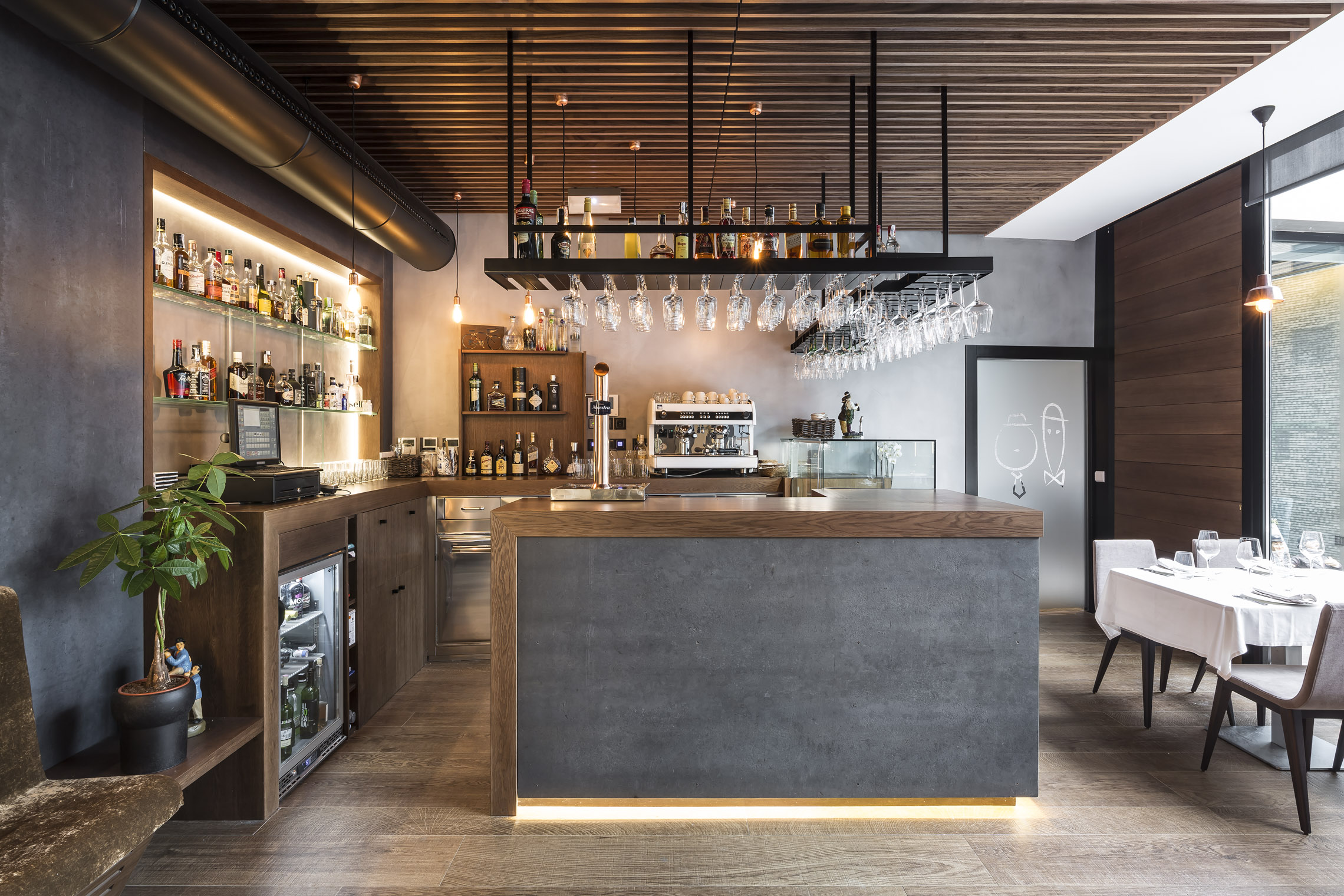 Para ello, se demuele la vivienda antigua que ocupaba la parcela y se construye un nuevo edificio. Esta nueva oportunidad hace que pueda aparecer un patio de entrada que posibilite tener un filtro con la vía pública, algo muy difícil en negocios situados en planta baja, y poder abrir grandes ventanales que iluminen el salón principal. En en este patio donde se ubica la escalera de subida a la terraza superior, donde se ubica una barra cerrada comunicada con la cocina.