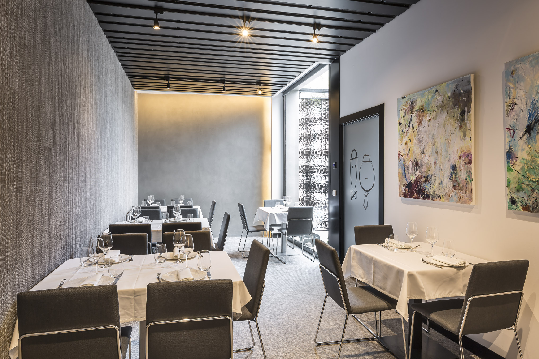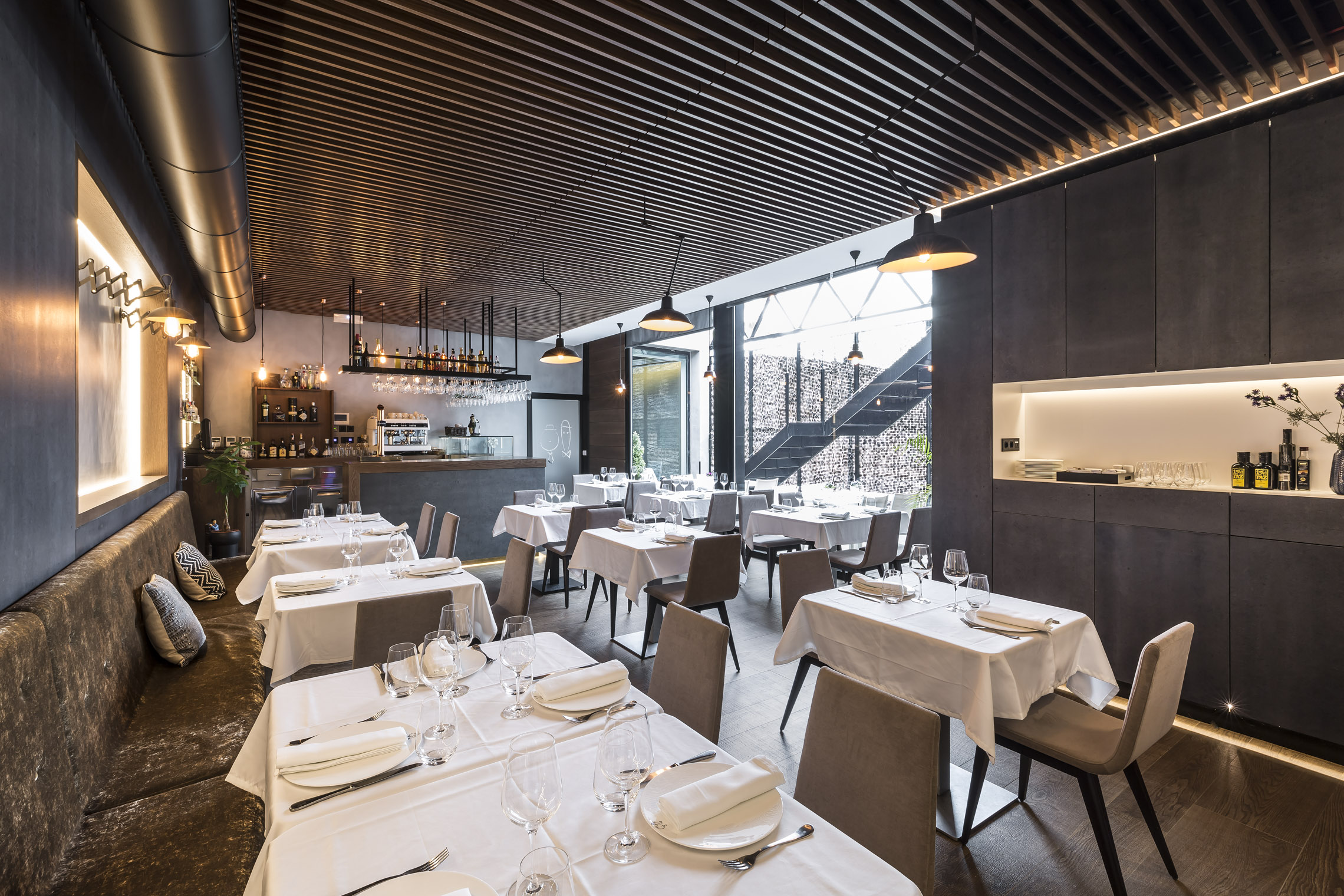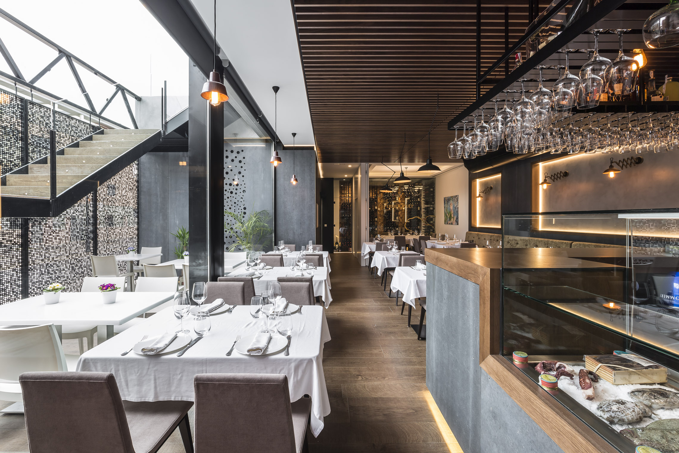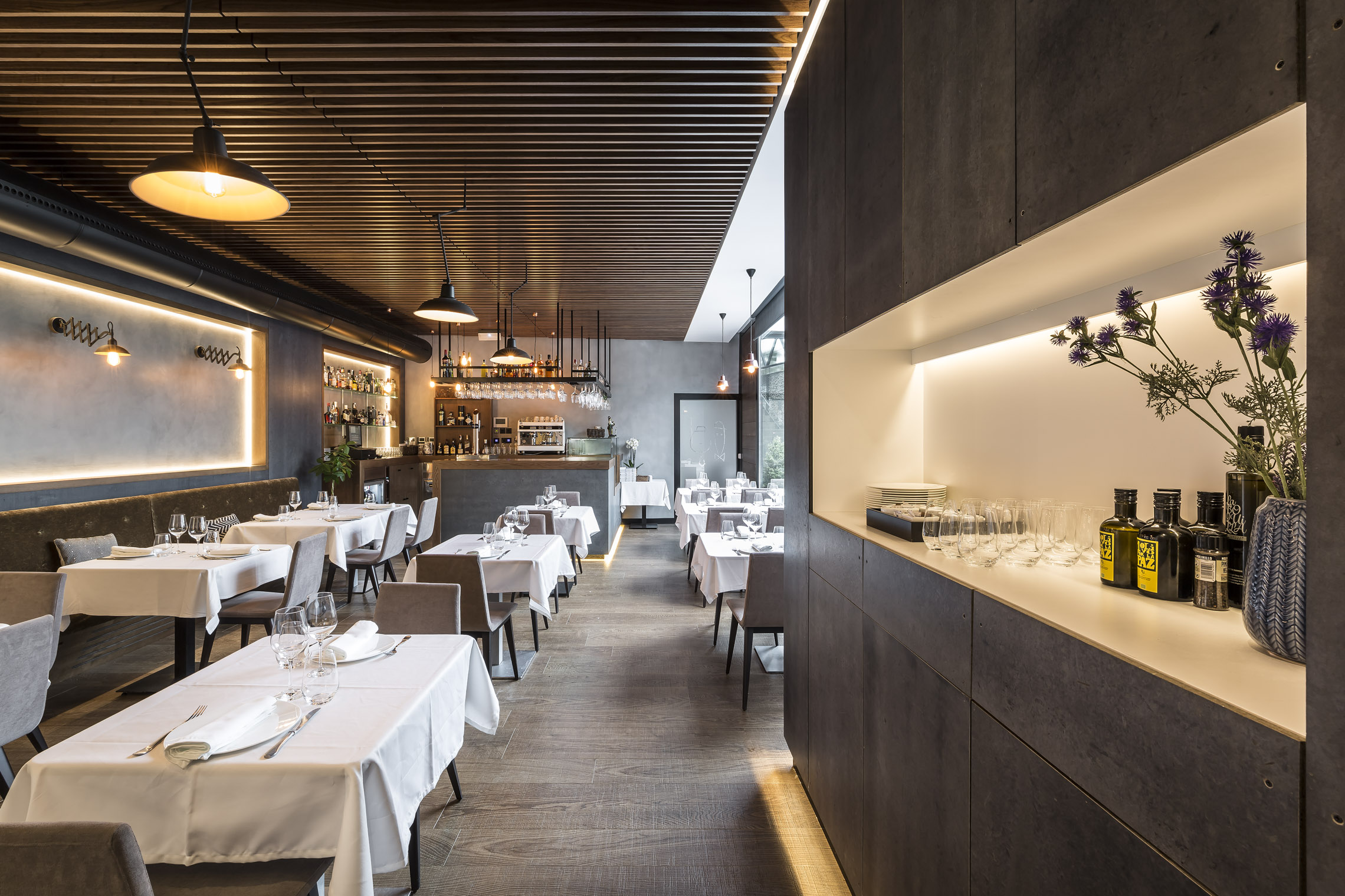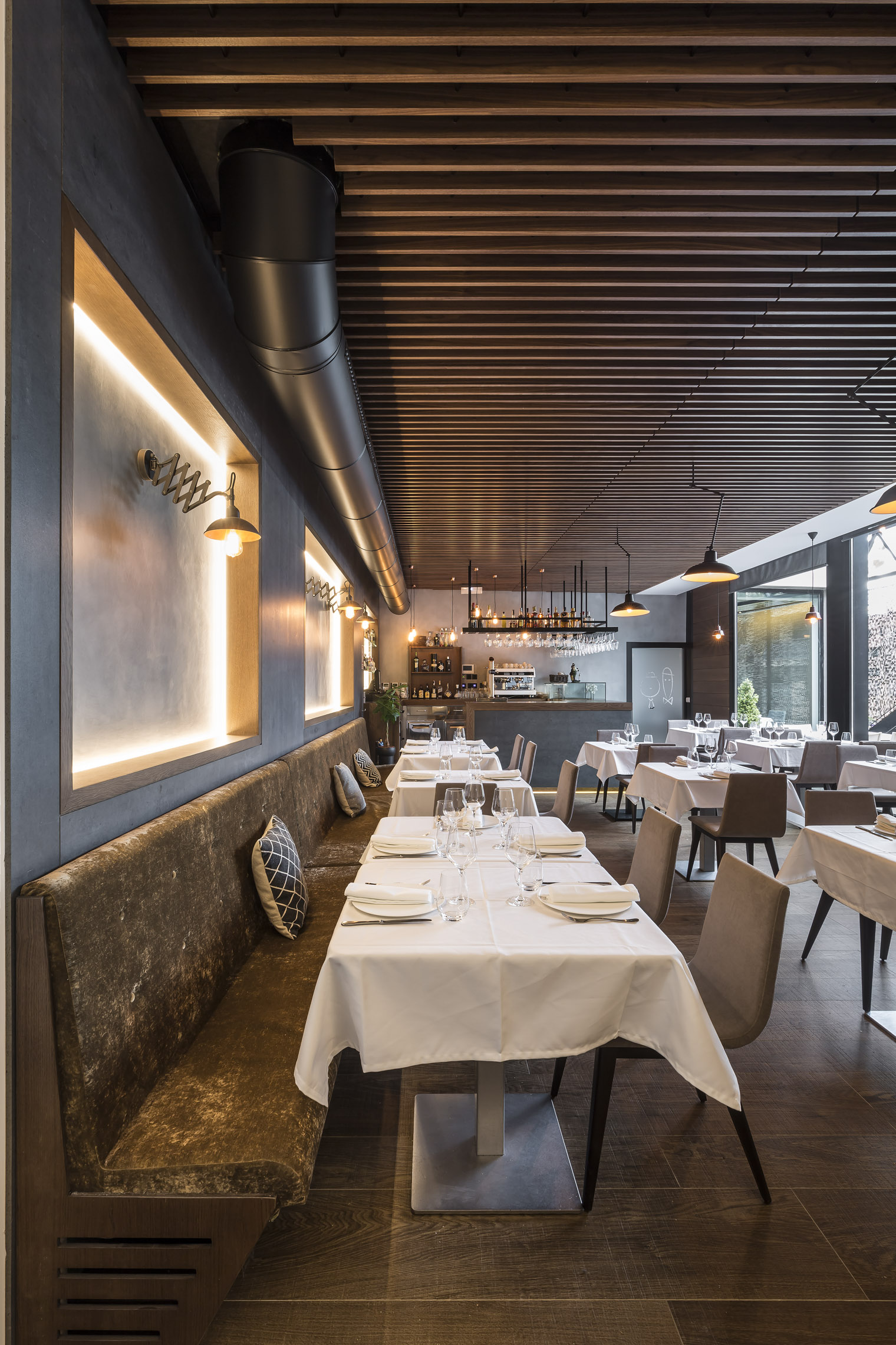 Para ello, se demuele la vivienda antigua que ocupaba la parcela y se construye un nuevo edificio. Esta nueva oportunidad hace que pueda aparecer un patio de entrada que posibilite tener un filtro con la vía pública, algo muy difícil en negocios situados en planta baja, y poder abrir grandes ventanales que iluminen el salón principal. En en este patio donde se ubica la escalera de subida a la terraza superior, donde se ubica una barra cerrada comunicada con la cocina.