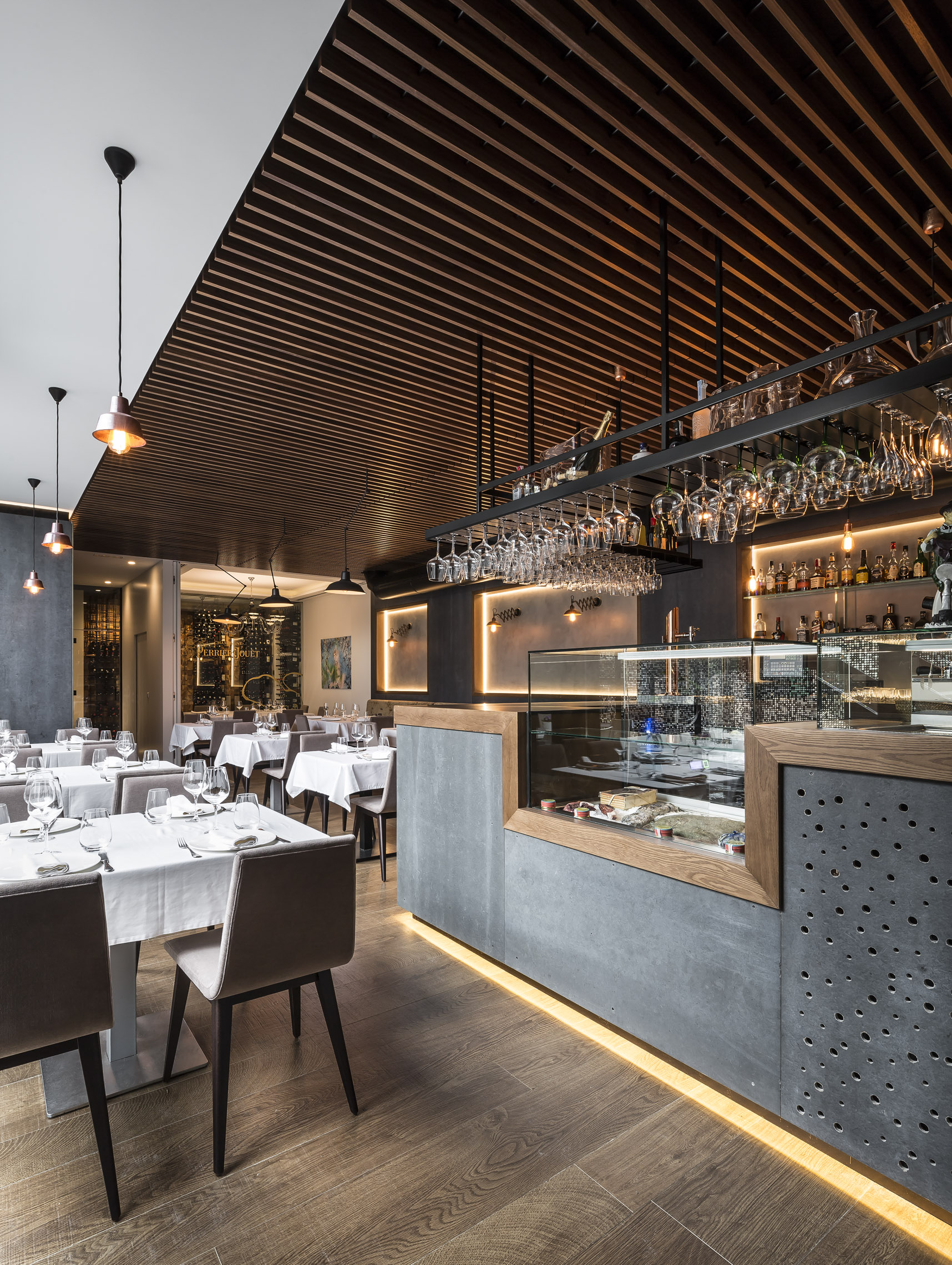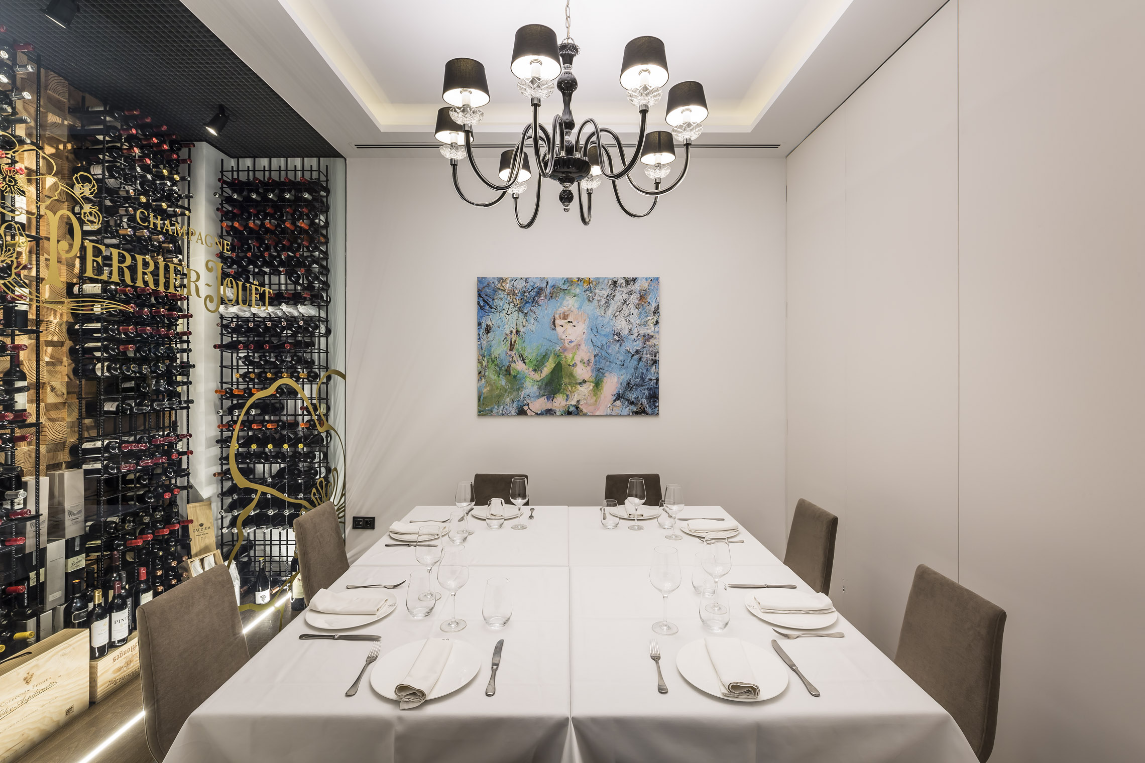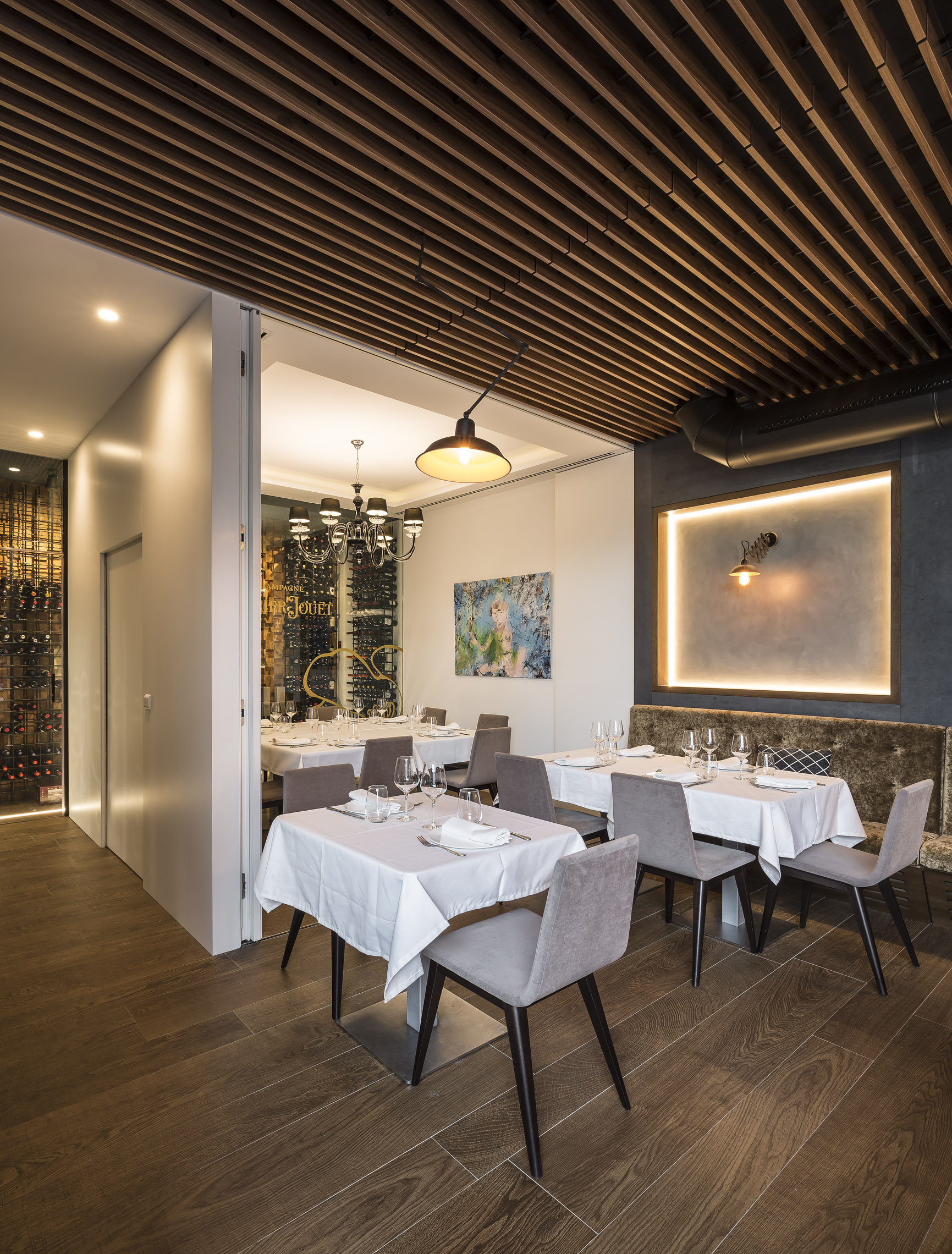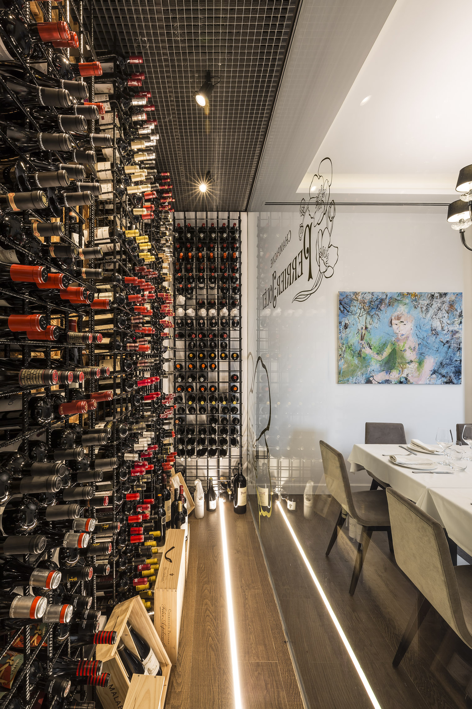 En este proyecto de reforma de locales, en cuanto a la distribución interior de planta baja, se dispone el salón principal con la barra y dos salones privados, uno de ellos con la posibilidad de unirse al salón principal mediante un tabique móvil. También se ubica una bodega climatizada con un gran vidrio que la comunica con el privado pequeño.