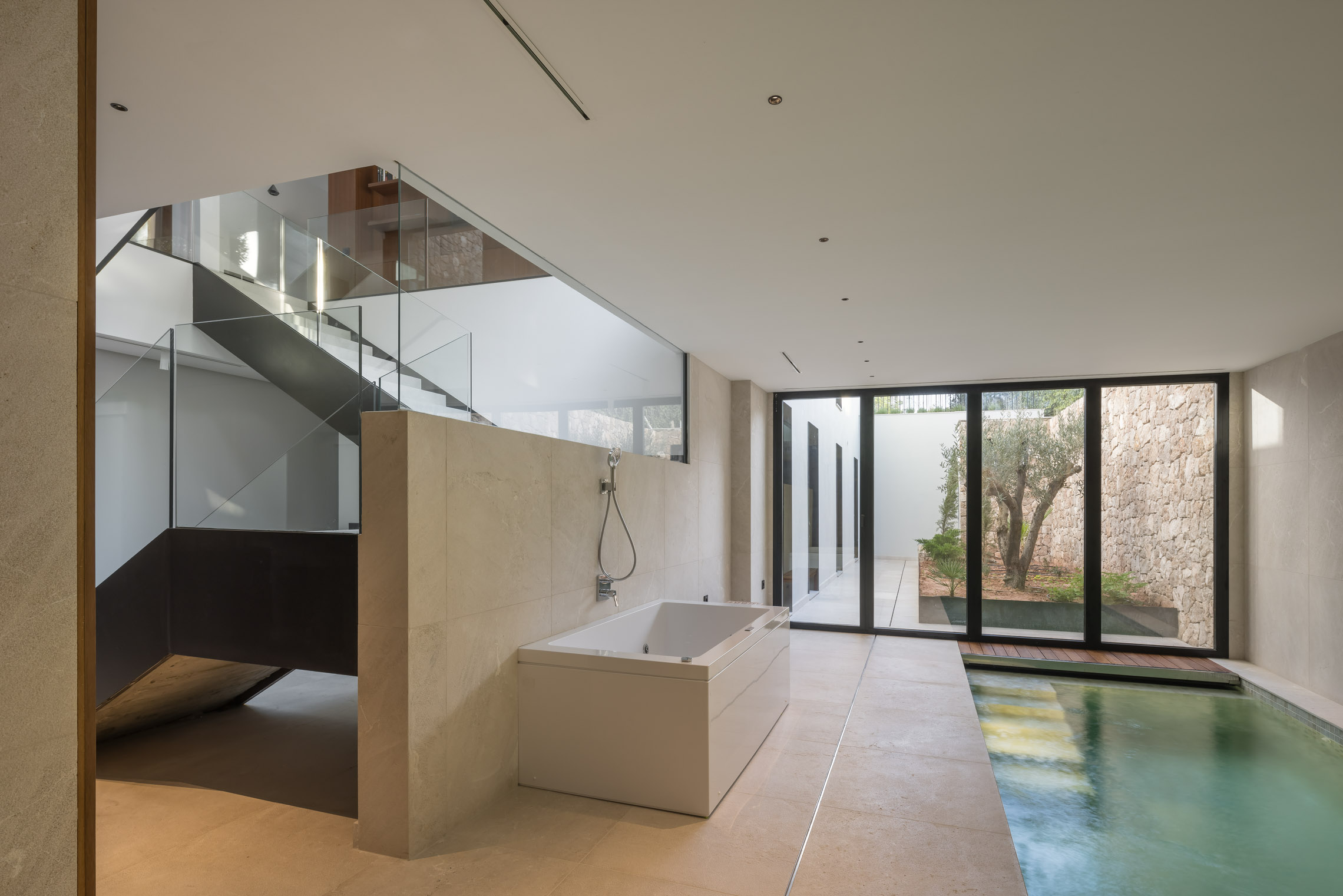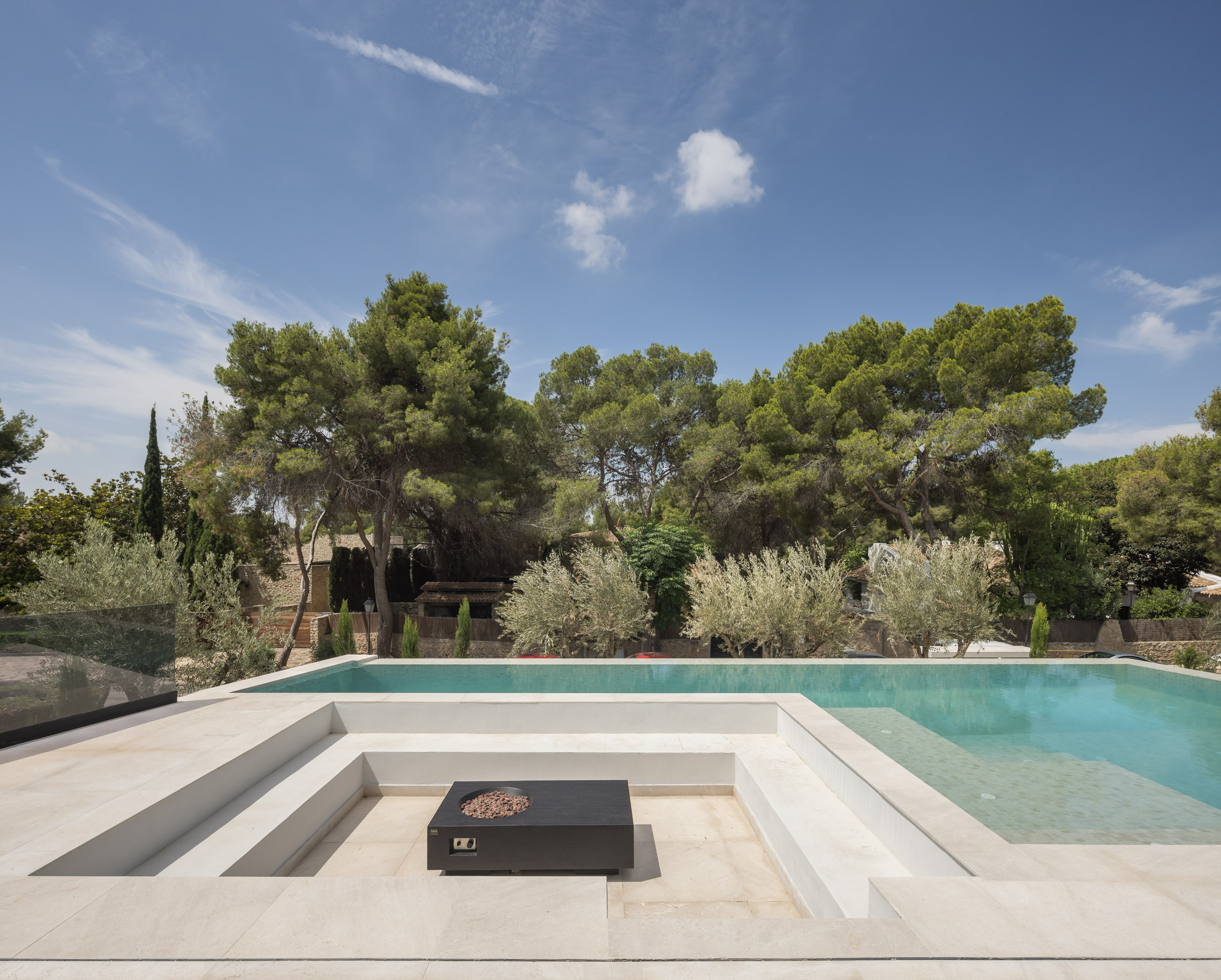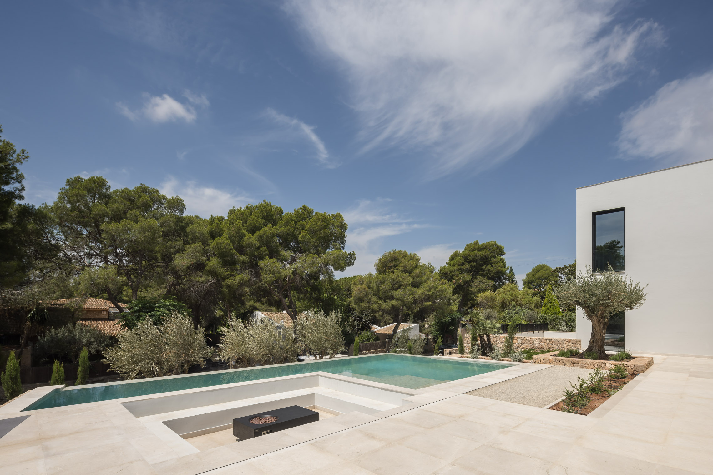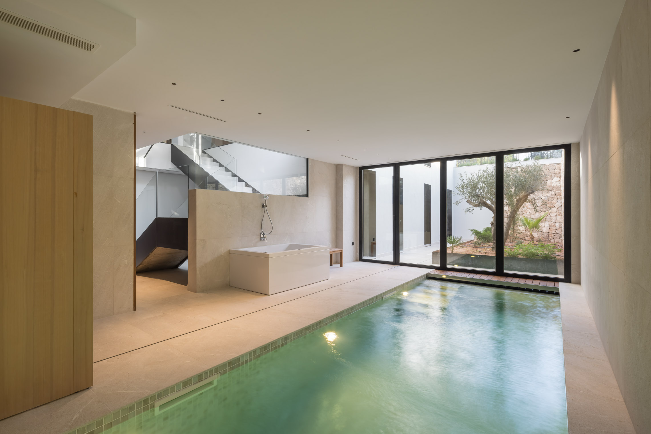 Una de las características más destacadas del proyecto es la incorporación de piscinas tanto en el exterior como en el interior. La piscina exterior se sitúa estratégicamente para aprovechar las vistas y la conexión con el jardín, mientras que la piscina interior proporciona un espacio de relajación y bienestar que puede ser disfrutado en cualquier época del año.
