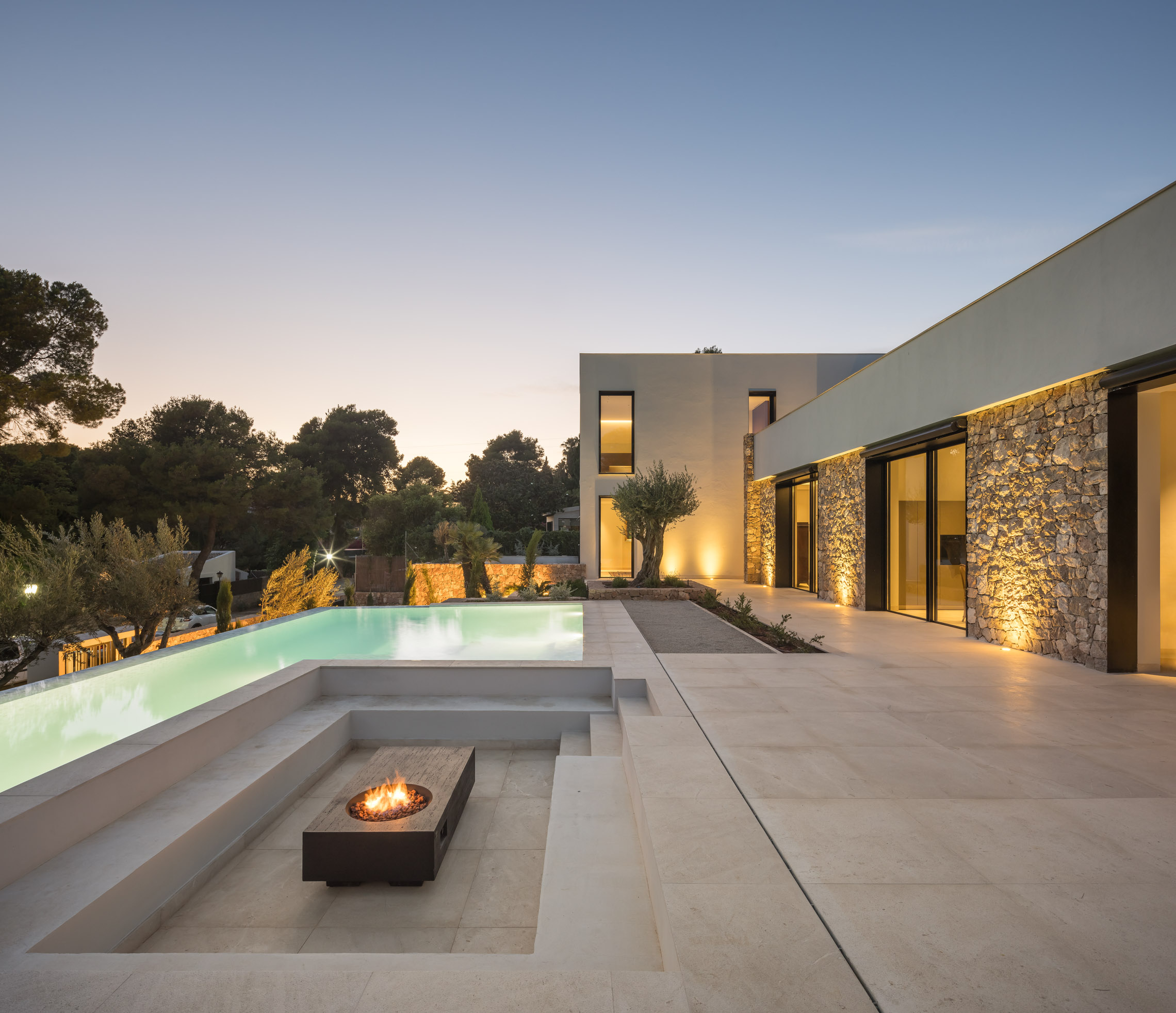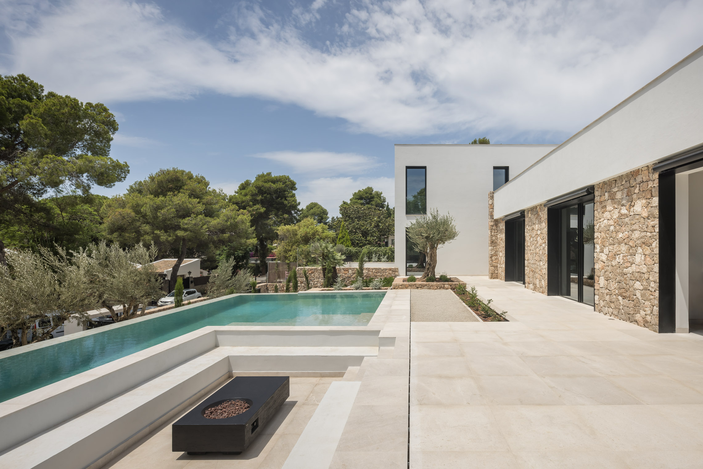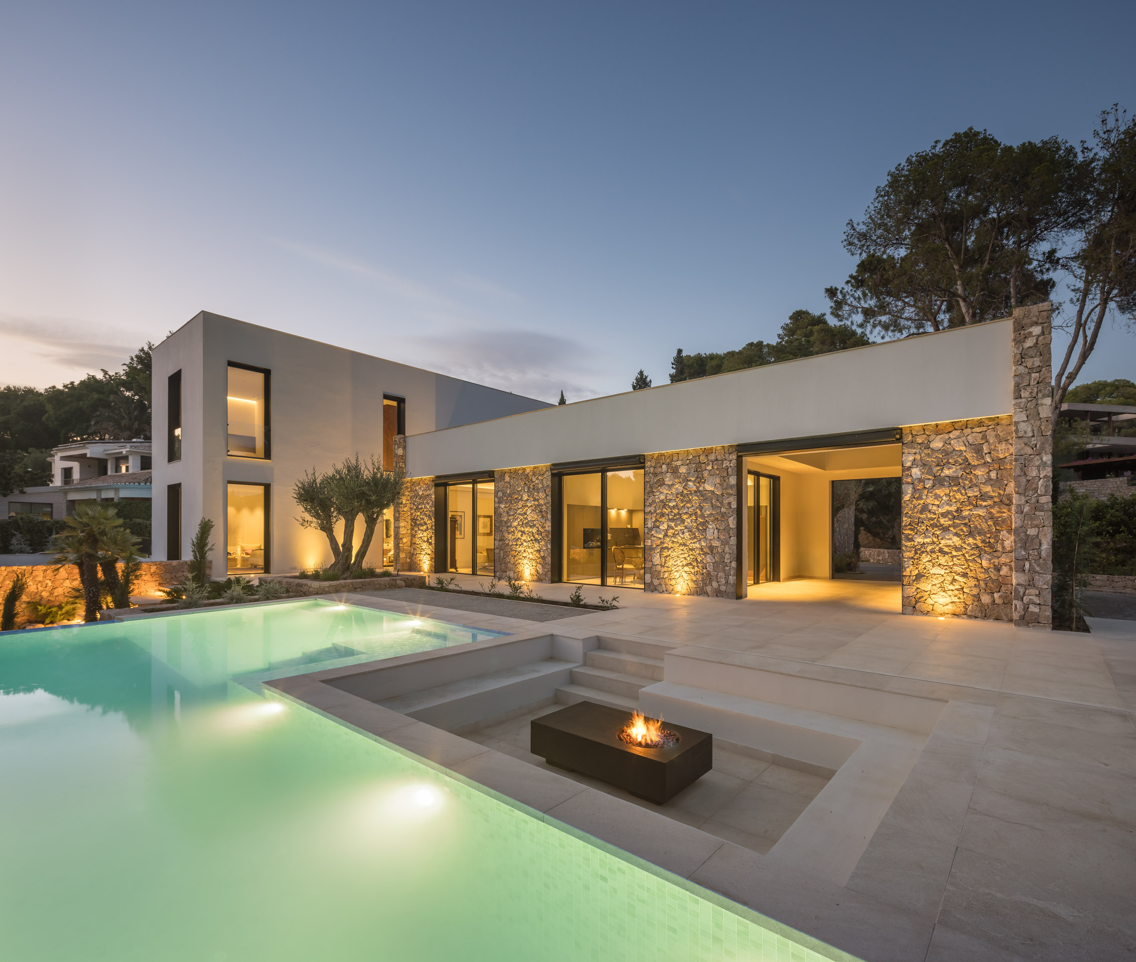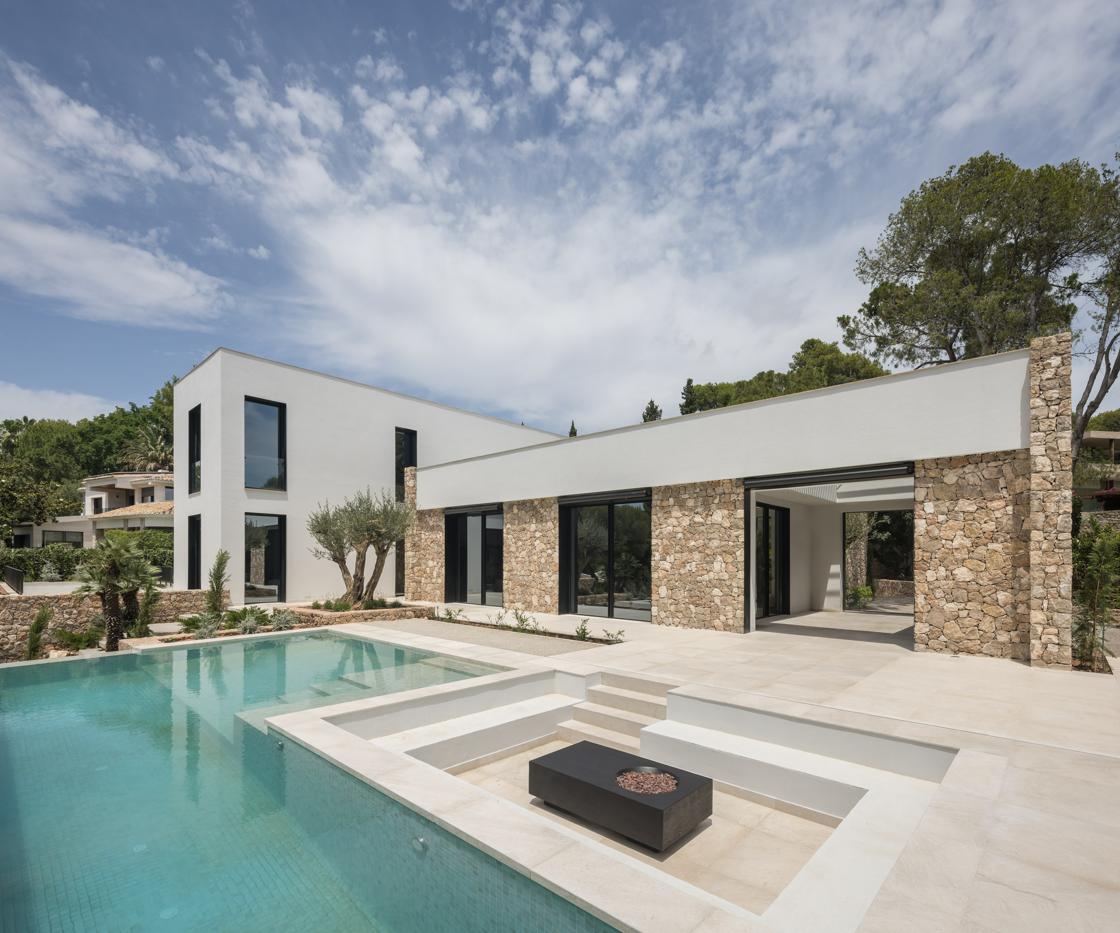 Una de las características más destacadas del proyecto es la incorporación de piscinas tanto en el exterior como en el interior. La piscina exterior se sitúa estratégicamente para aprovechar las vistas y la conexión con el jardín, mientras que la piscina interior proporciona un espacio de relajación y bienestar que puede ser disfrutado en cualquier época del año.