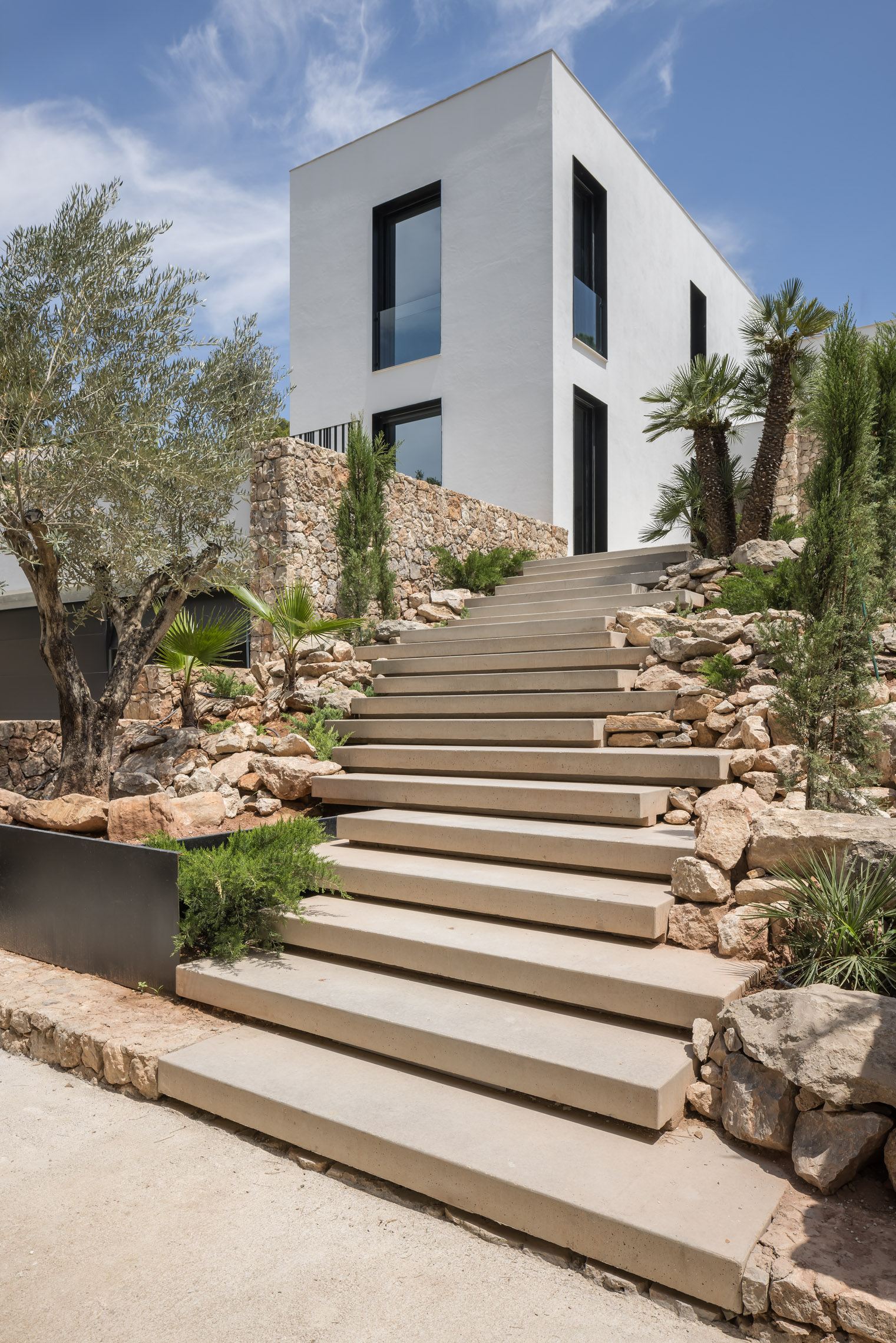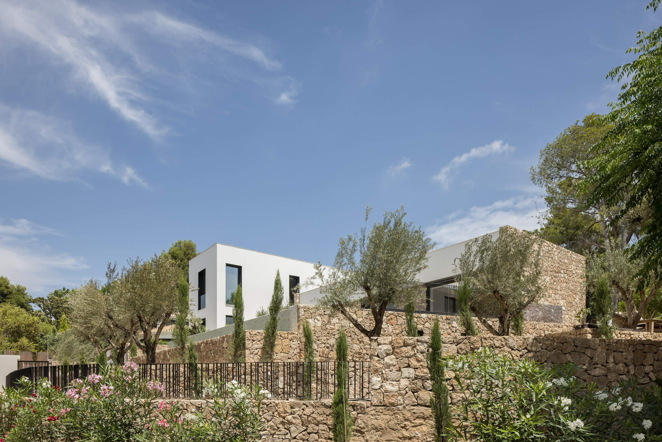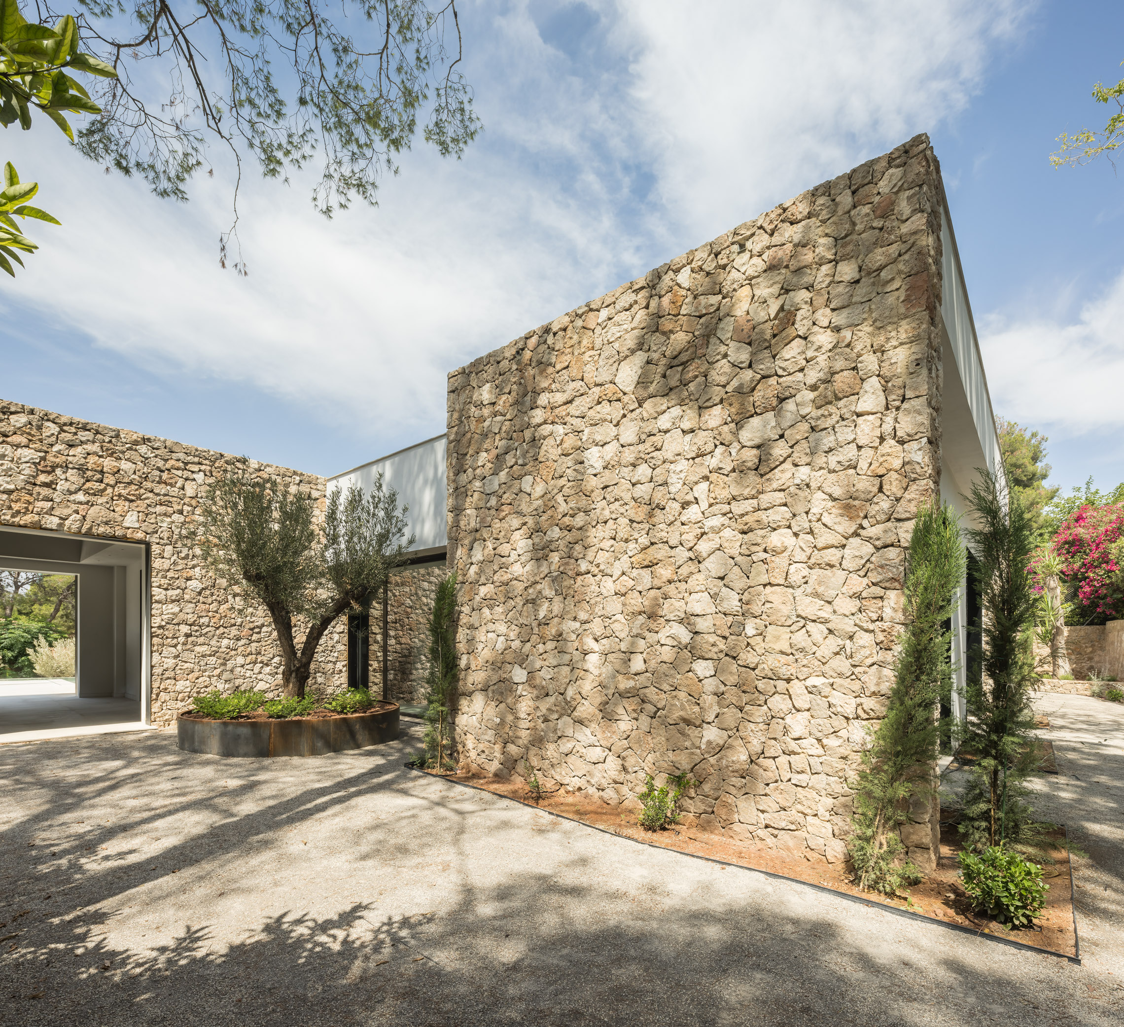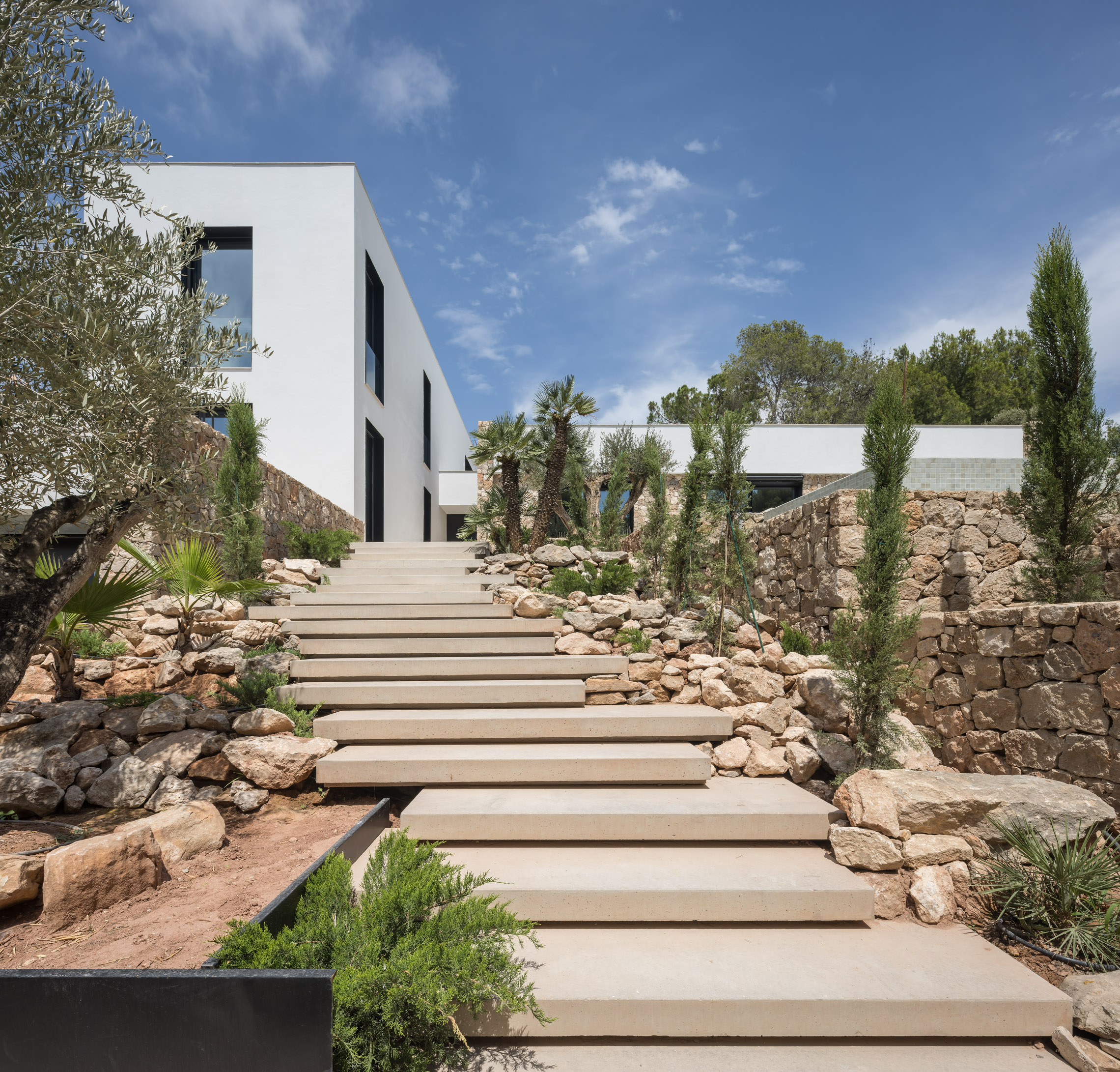 En cuanto a los materiales y acabados, tanto el interior como el exterior de la vivienda están revestidos con mármol gris abujardado. Este material no solo proporciona una estética sofisticada y moderna, sino que también asegura durabilidad y resistencia en todas las condiciones climáticas. Para la fachada se ha utilizado la piedra extraída directamente de la excavación del terreno. Esta elección no solo minimiza el impacto ambiental del proyecto, sino que también garantiza una integración perfecta con el entorno natural, otorgando a la vivienda un carácter orgánico y atemporal.