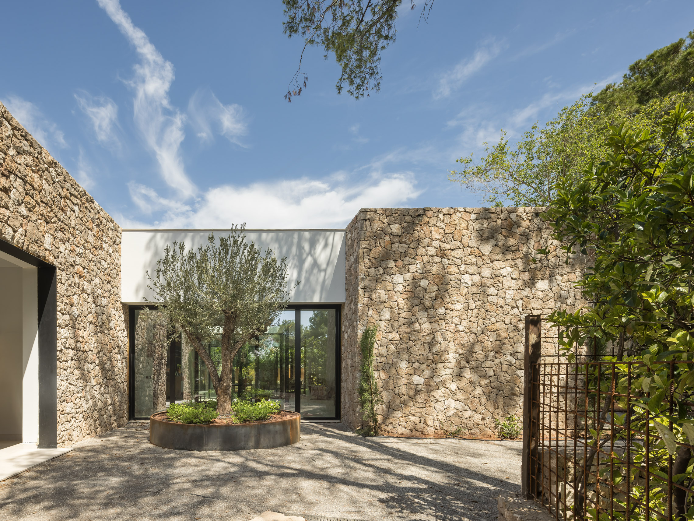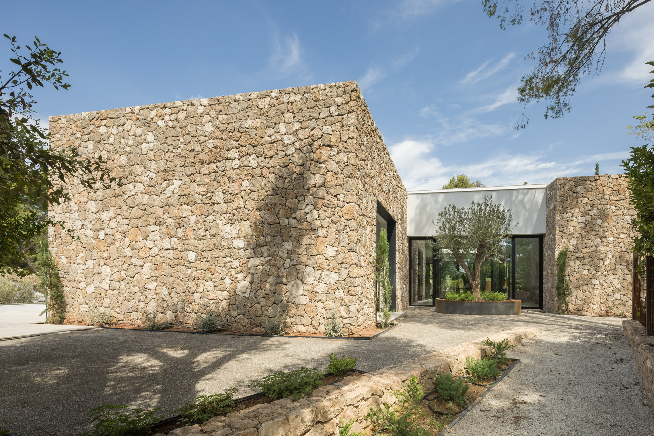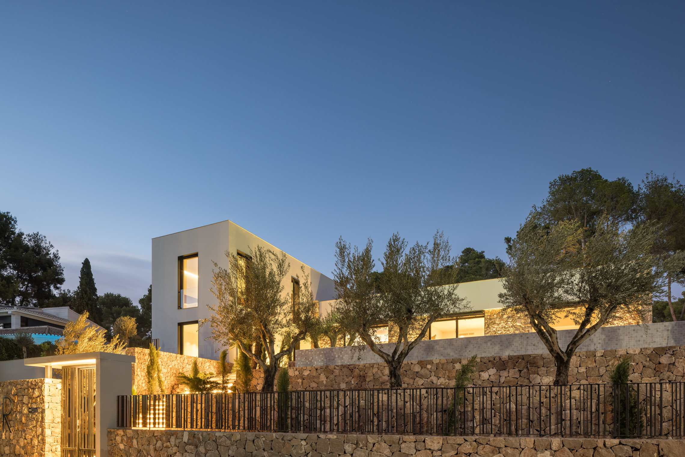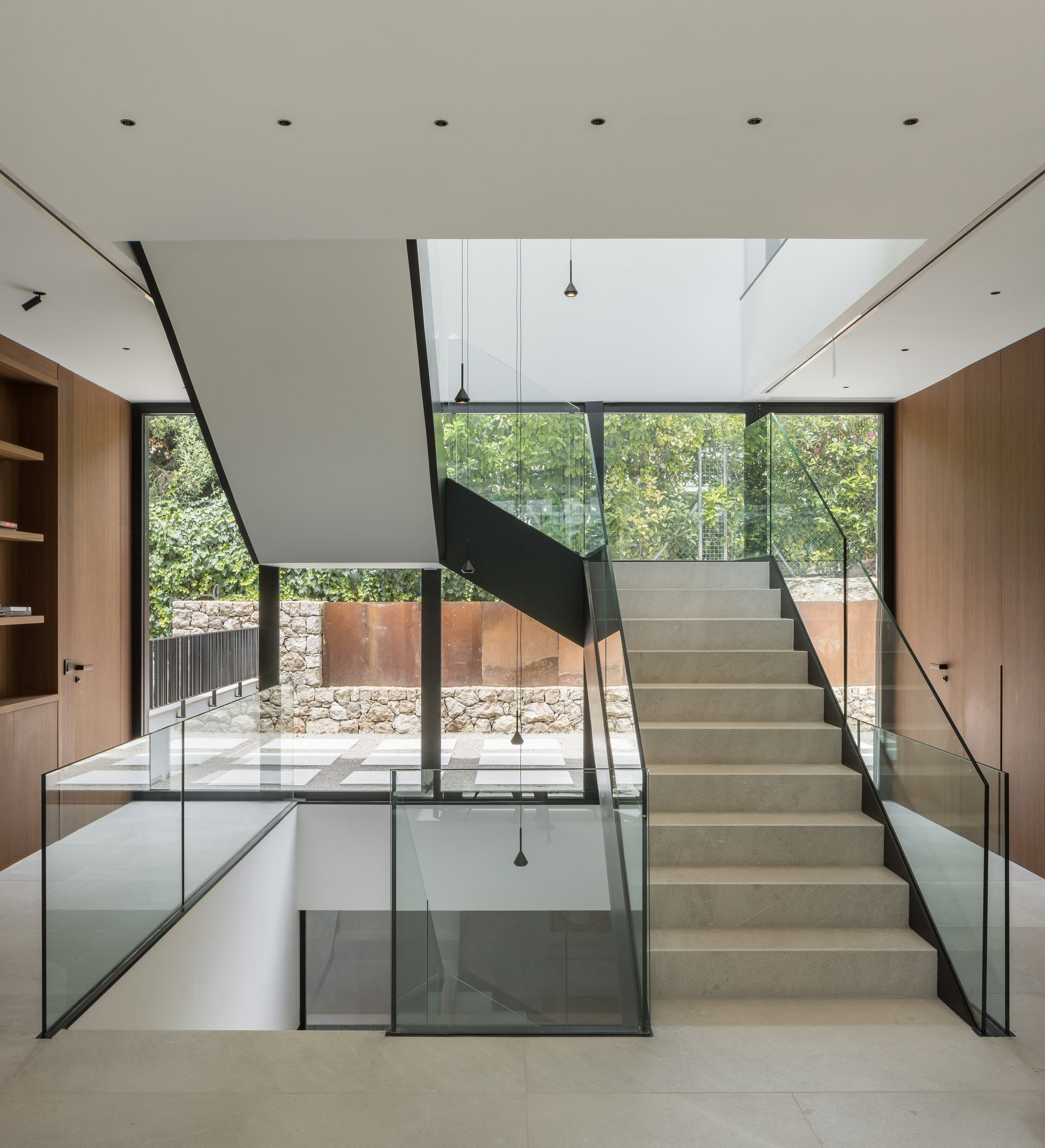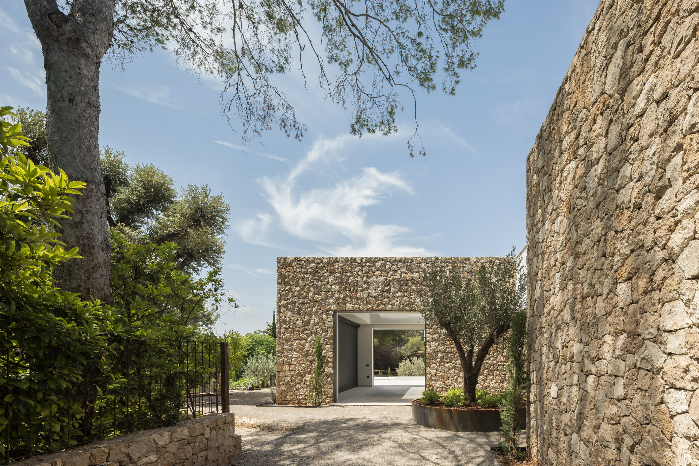 En cuanto a los materiales y acabados, tanto el interior como el exterior de la vivienda están revestidos con mármol gris abujardado. Este material no solo proporciona una estética sofisticada y moderna, sino que también asegura durabilidad y resistencia en todas las condiciones climáticas. Para la fachada se ha utilizado la piedra extraída directamente de la excavación del terreno. Esta elección no solo minimiza el impacto ambiental del proyecto, sino que también garantiza una integración perfecta con el entorno natural, otorgando a la vivienda un carácter orgánico y atemporal.