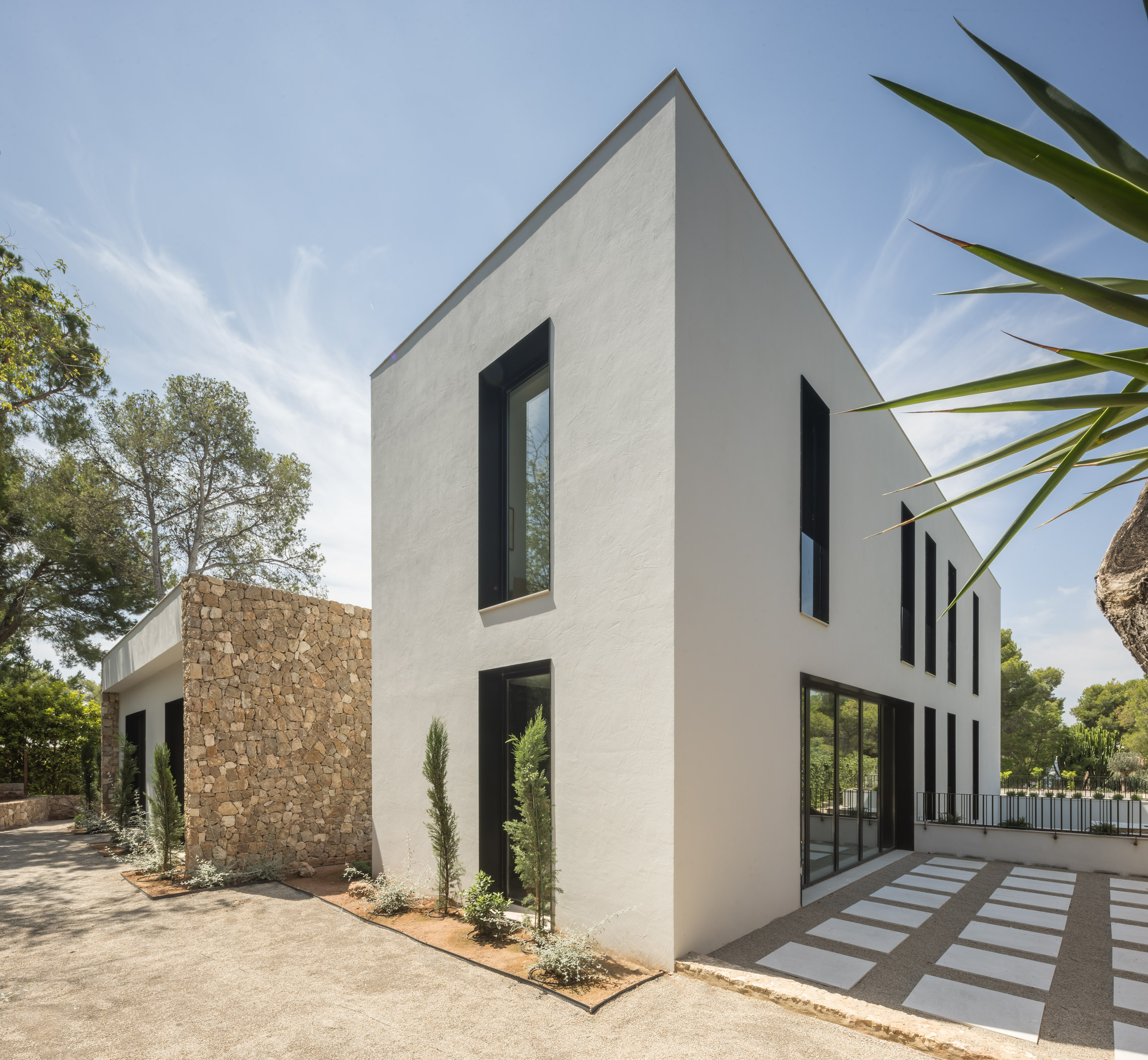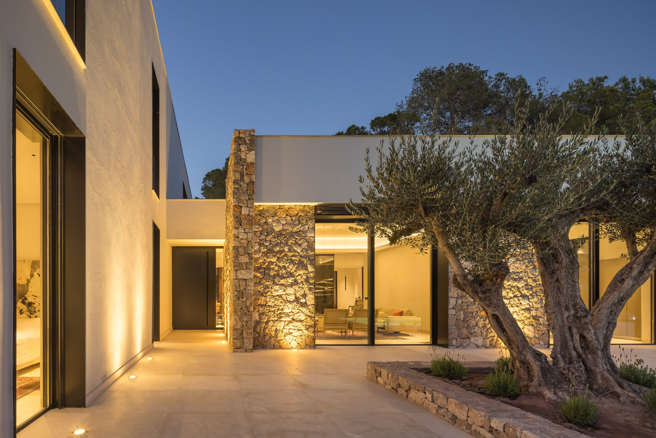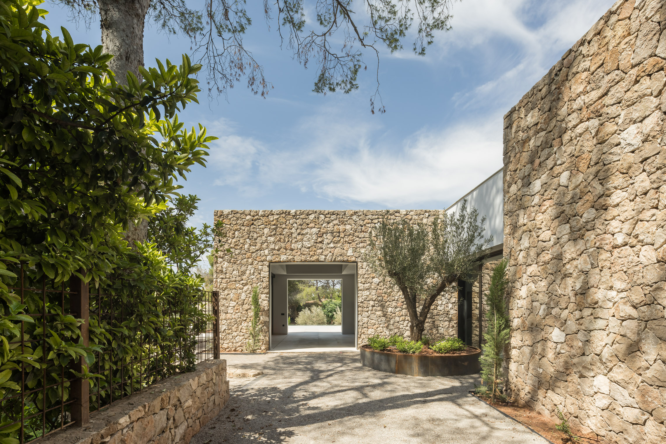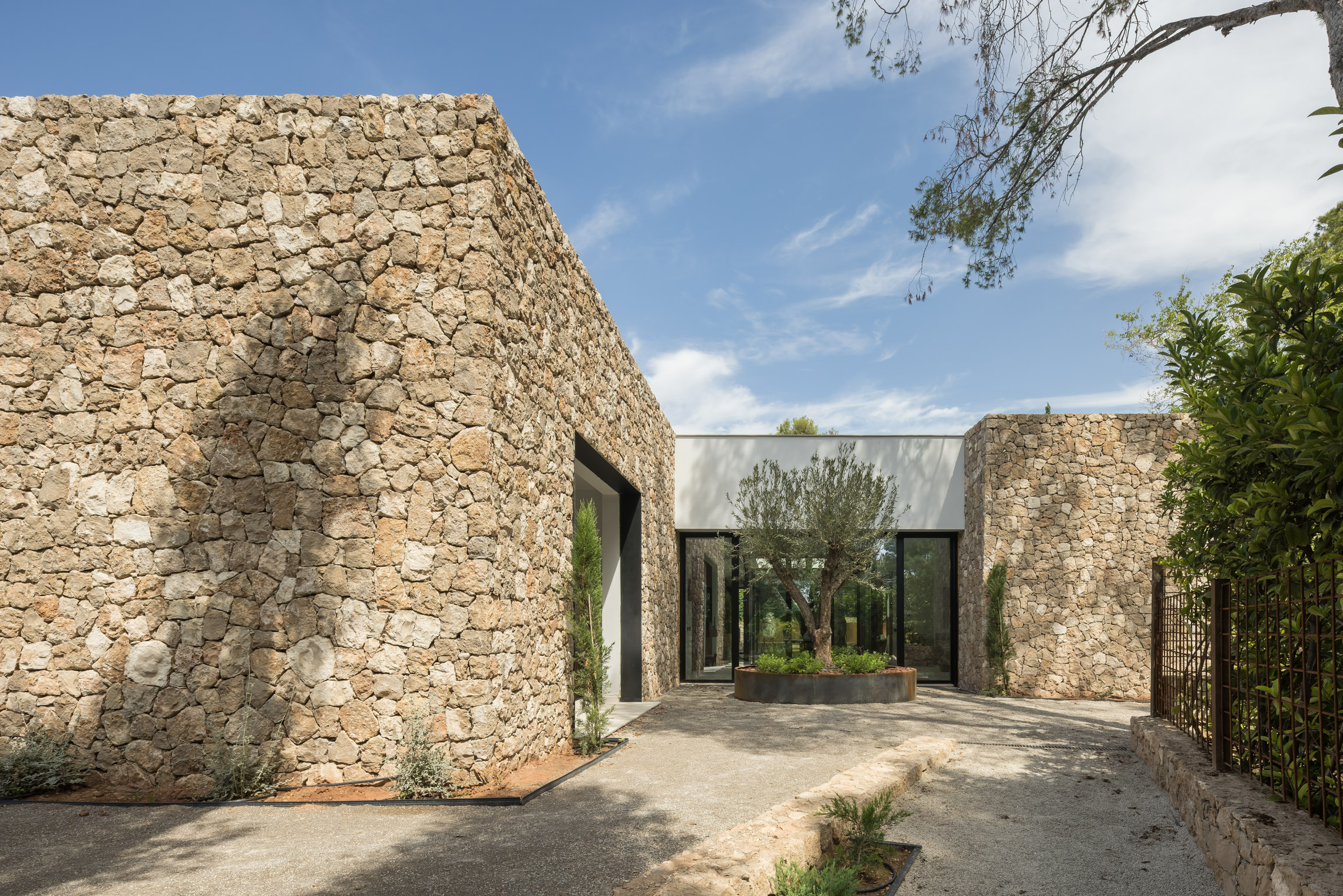 En cuanto a los materiales y acabados, tanto el interior como el exterior de la vivienda están revestidos con mármol gris abujardado. Este material no solo proporciona una estética sofisticada y moderna, sino que también asegura durabilidad y resistencia en todas las condiciones climáticas. Para la fachada se ha utilizado la piedra extraída directamente de la excavación del terreno. Esta elección no solo minimiza el impacto ambiental del proyecto, sino que también garantiza una integración perfecta con el entorno natural, otorgando a la vivienda un carácter orgánico y atemporal.