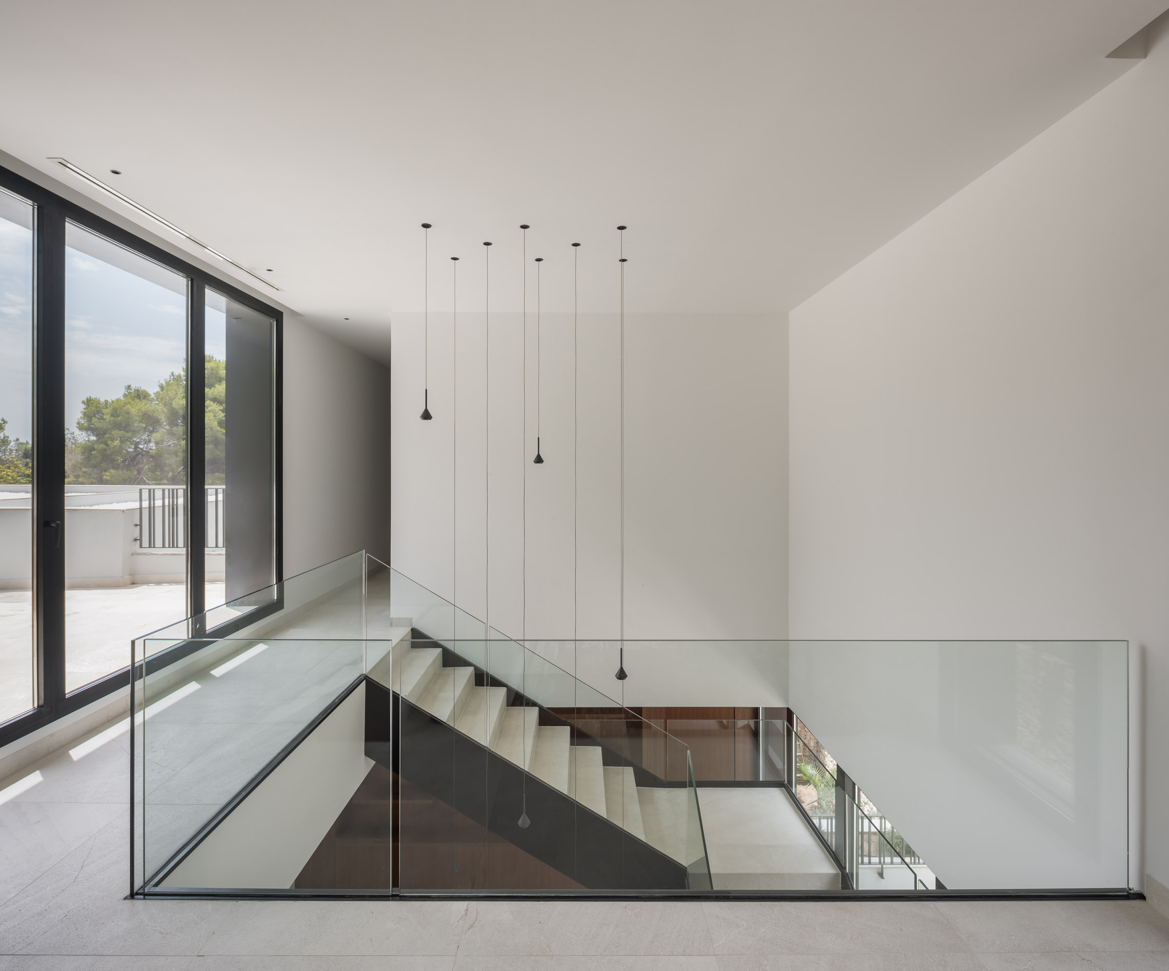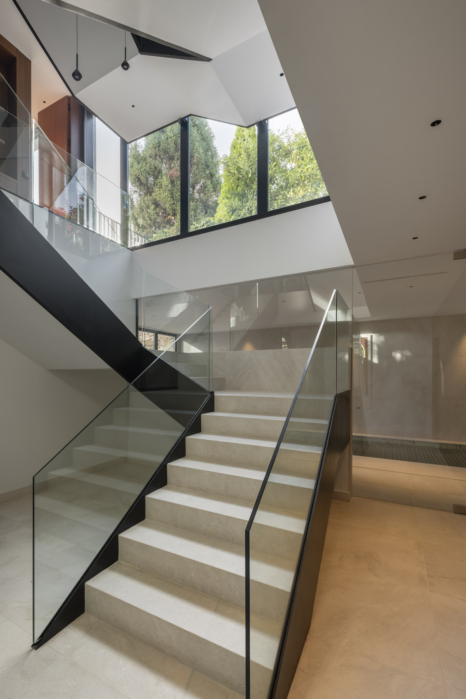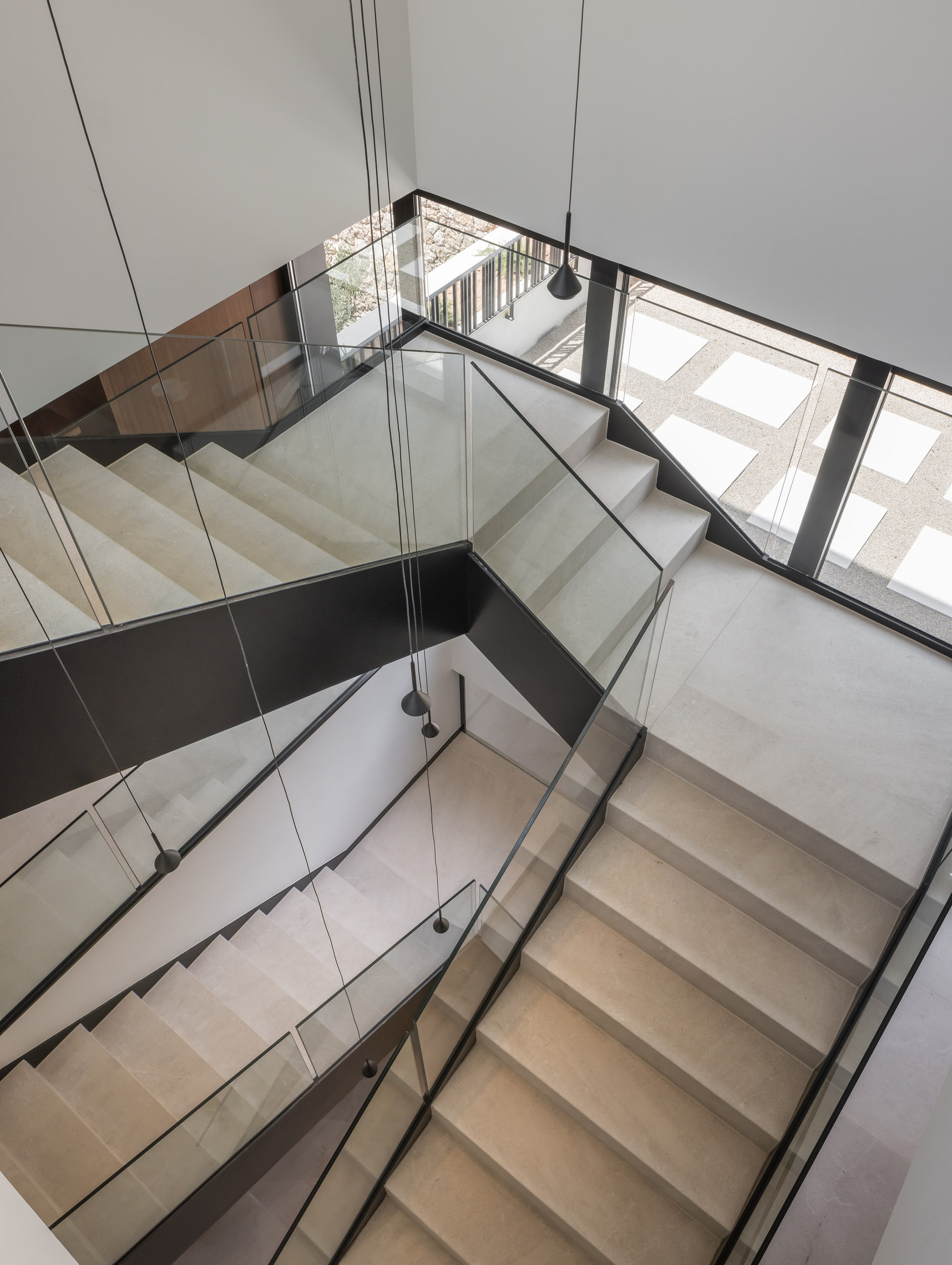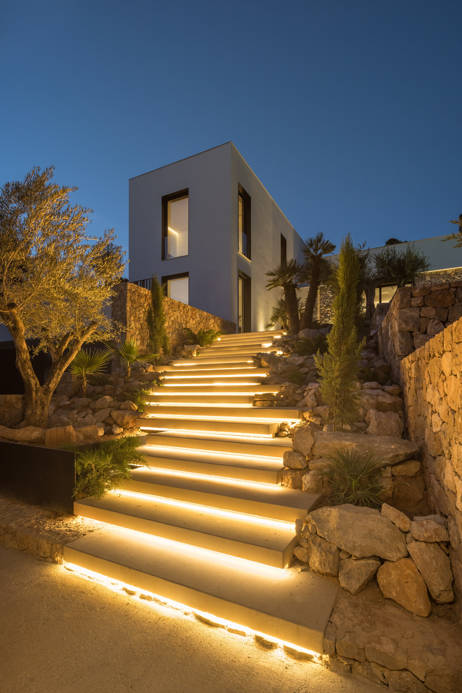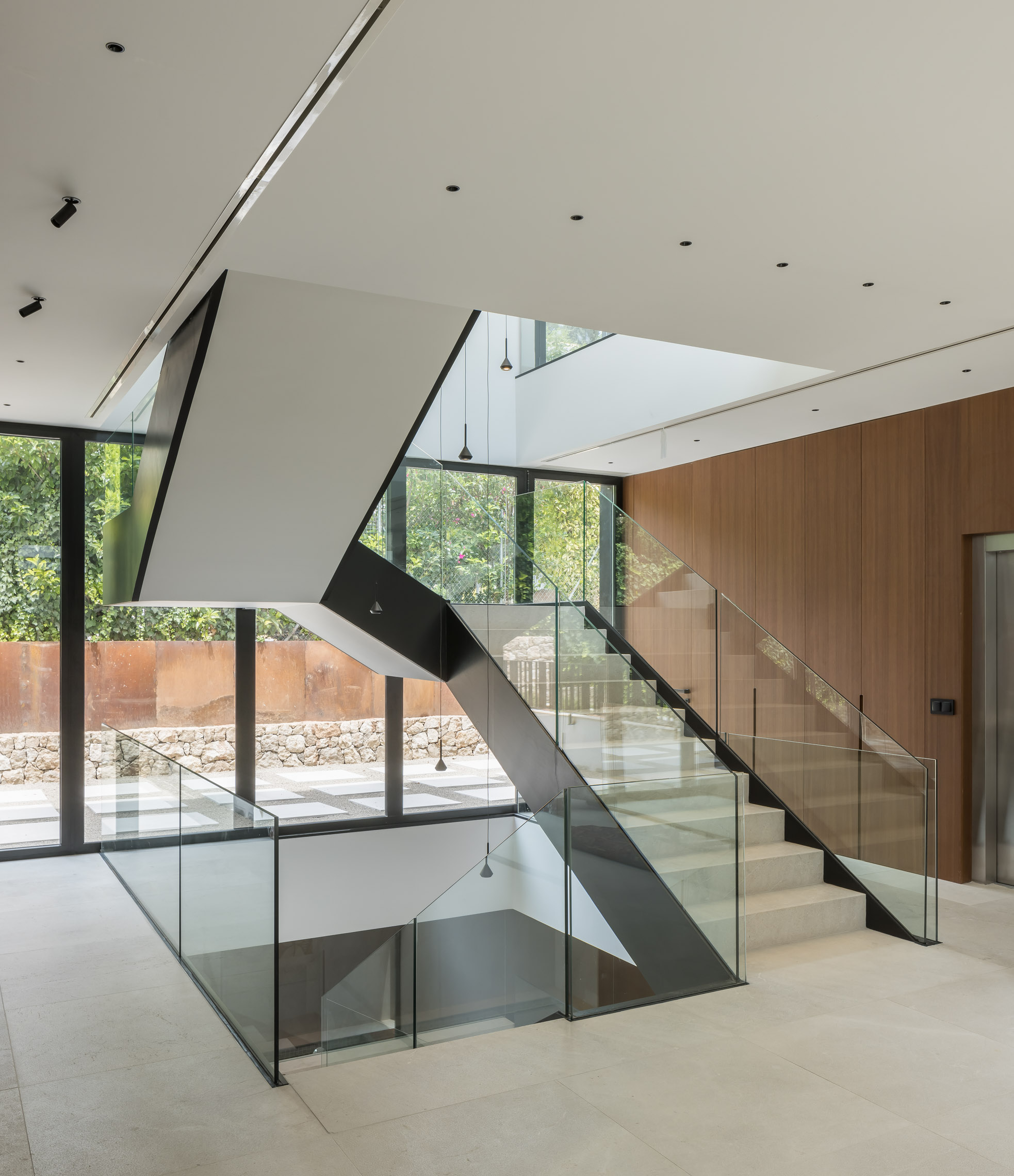 En cuanto a los materiales y acabados, tanto el interior como el exterior de la vivienda están revestidos con mármol gris abujardado. Este material no solo proporciona una estética sofisticada y moderna, sino que también asegura durabilidad y resistencia en todas las condiciones climáticas. Para la fachada se ha utilizado la piedra extraída directamente de la excavación del terreno. Esta elección no solo minimiza el impacto ambiental del proyecto, sino que también garantiza una integración perfecta con el entorno natural, otorgando a la vivienda un carácter orgánico y atemporal.