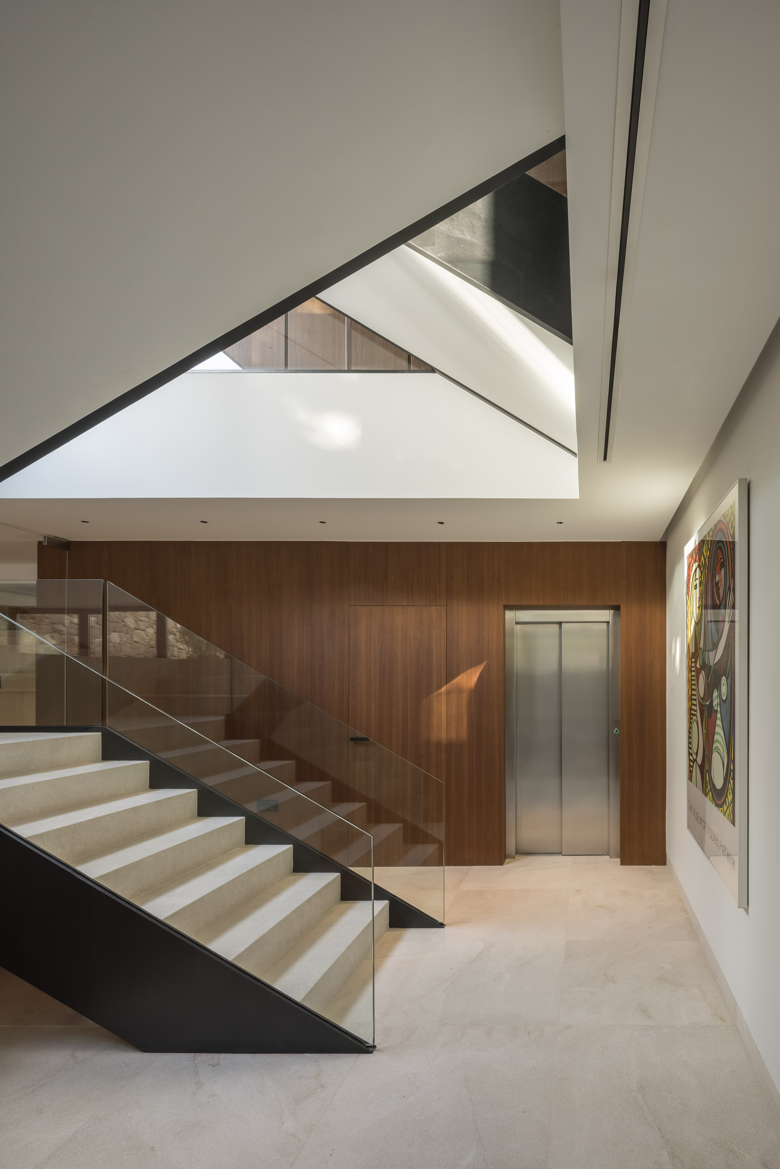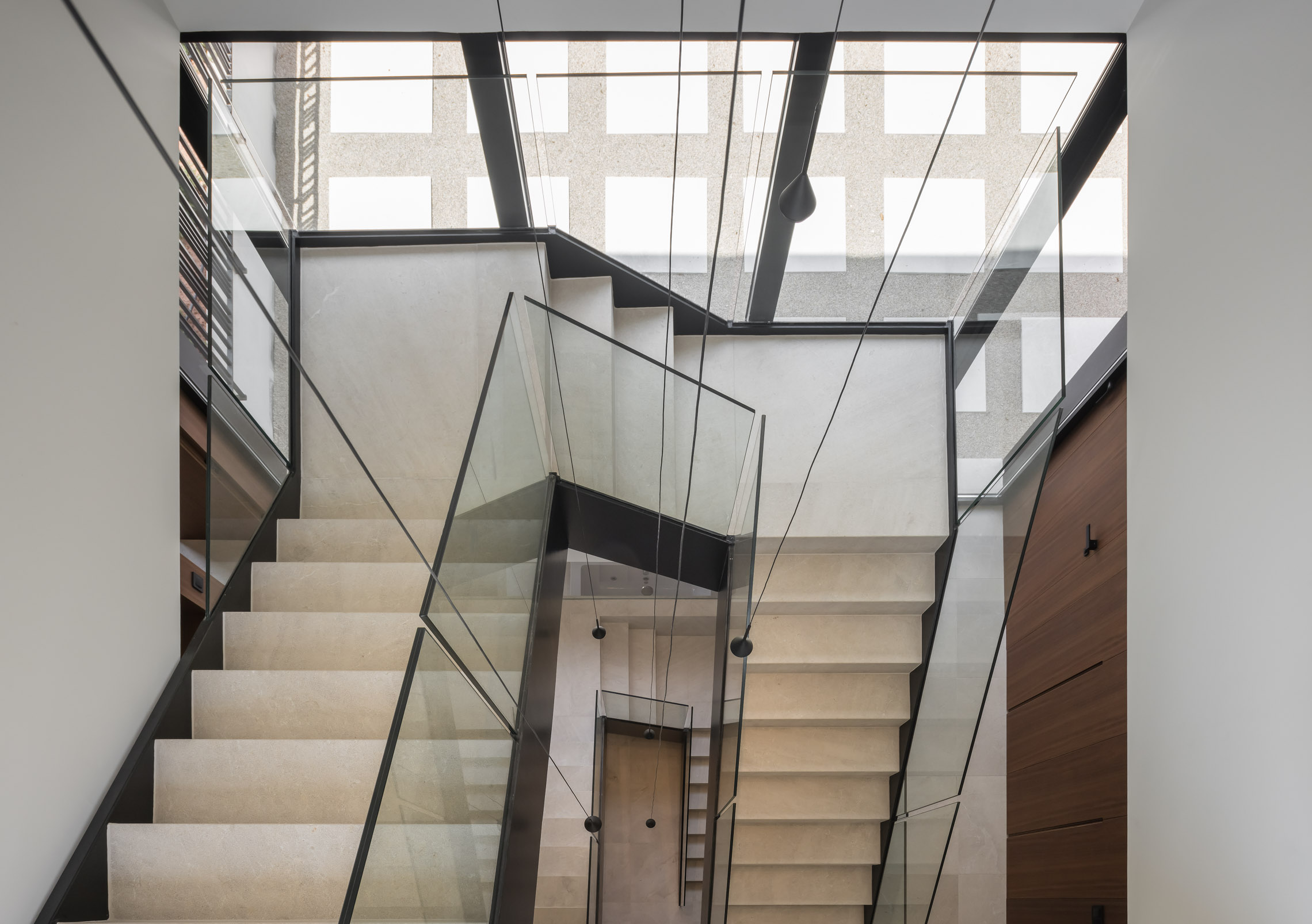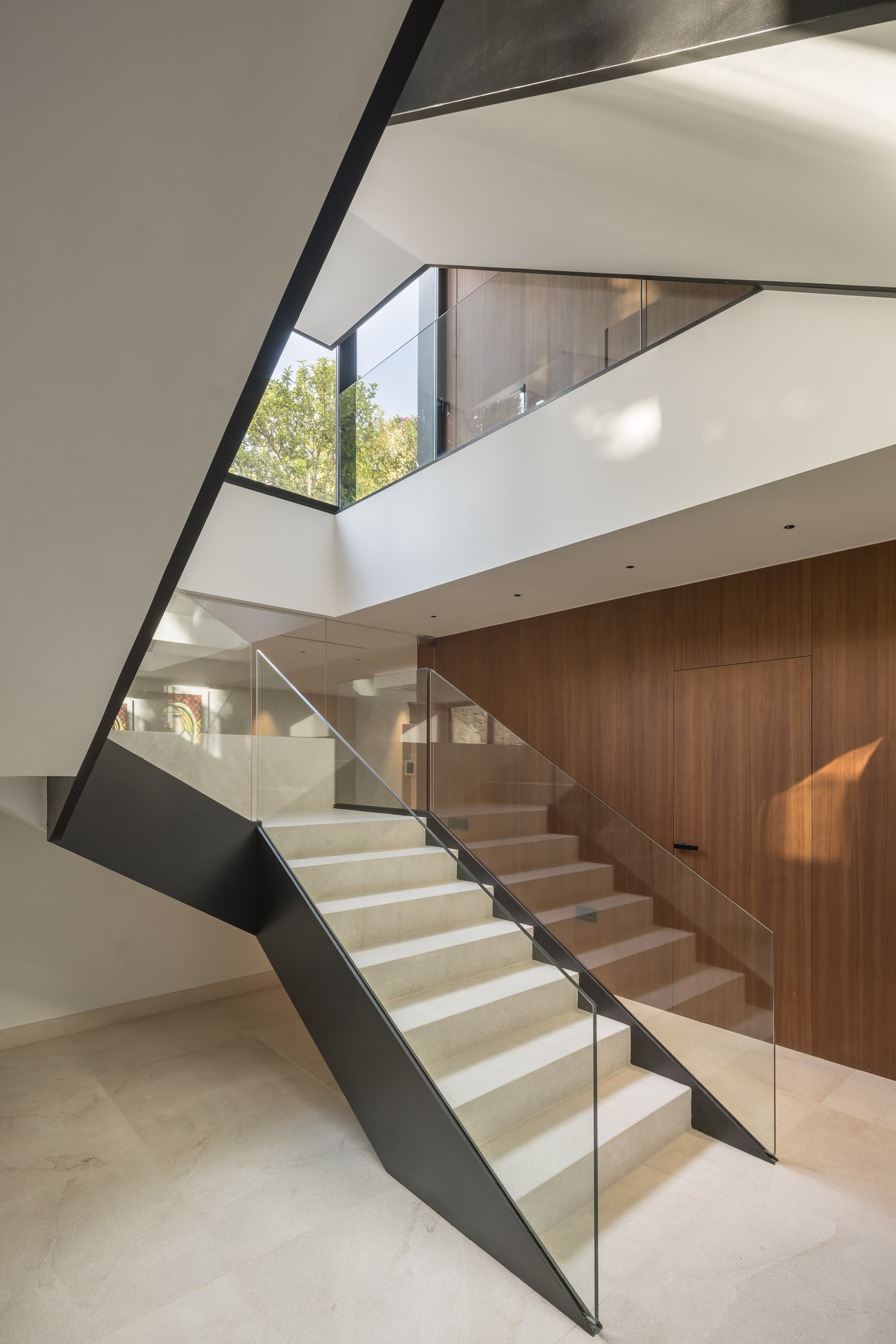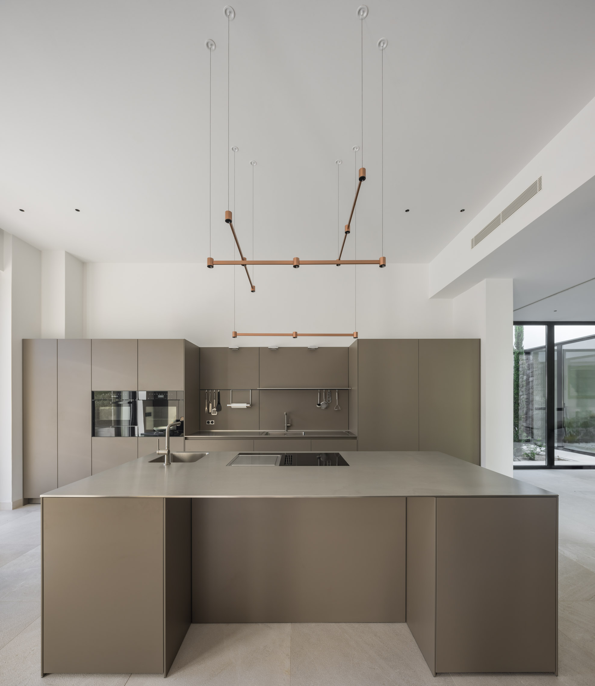 En cuanto a los materiales y acabados, tanto el interior como el exterior de la vivienda están revestidos con mármol gris abujardado. Este material no solo proporciona una estética sofisticada y moderna, sino que también asegura durabilidad y resistencia en todas las condiciones climáticas. Para la fachada se ha utilizado la piedra extraída directamente de la excavación del terreno. Esta elección no solo minimiza el impacto ambiental del proyecto, sino que también garantiza una integración perfecta con el entorno natural, otorgando a la vivienda un carácter orgánico y atemporal.