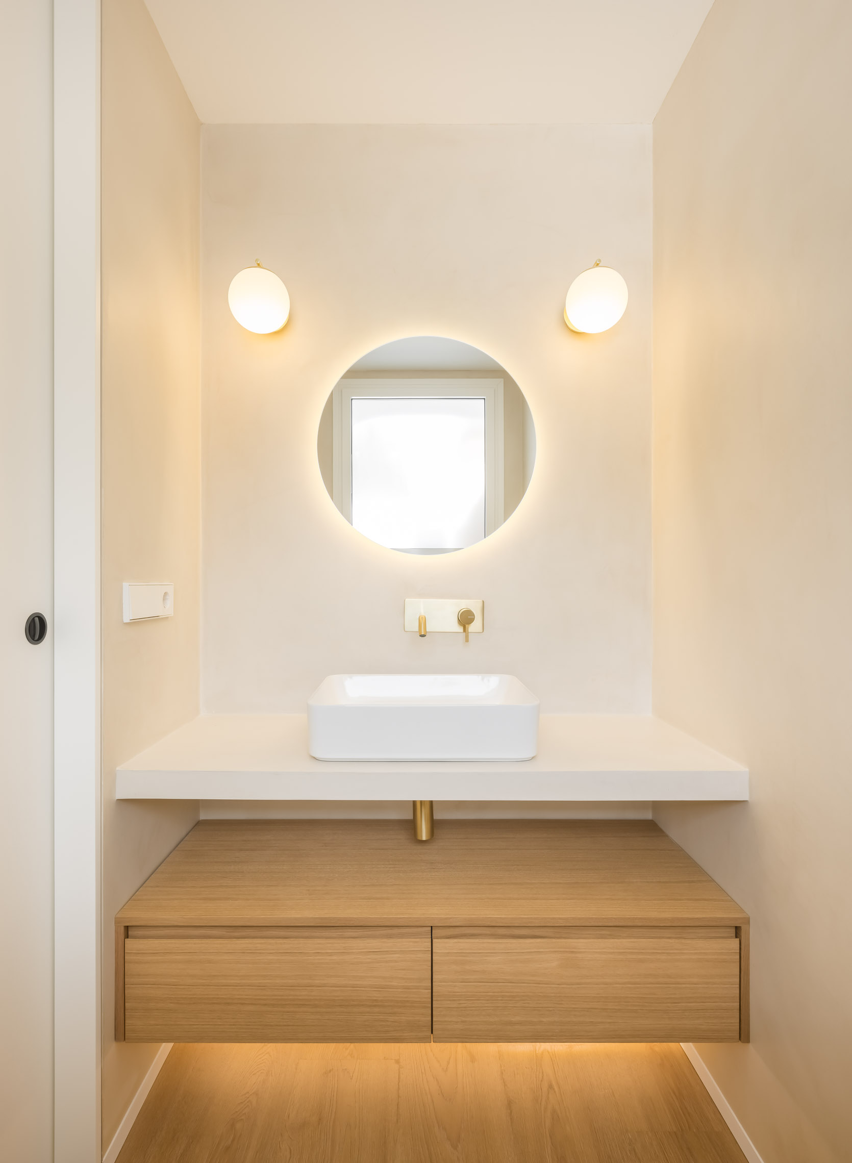 Finalmente, el otro baño busca la calidez a través del contraste de materiales y la elección de una correcta iluminación. El revestimiento blanco contrasta con los detalles en negro de espejos y grifería, mientras que la madera aporta la calidez necesaria en los hogares. En esta estancia, la iluminación se centra en las luces indirectas, tanto en espejos como en un oscuro en el falso techo, creando una atmósfera elegante.
