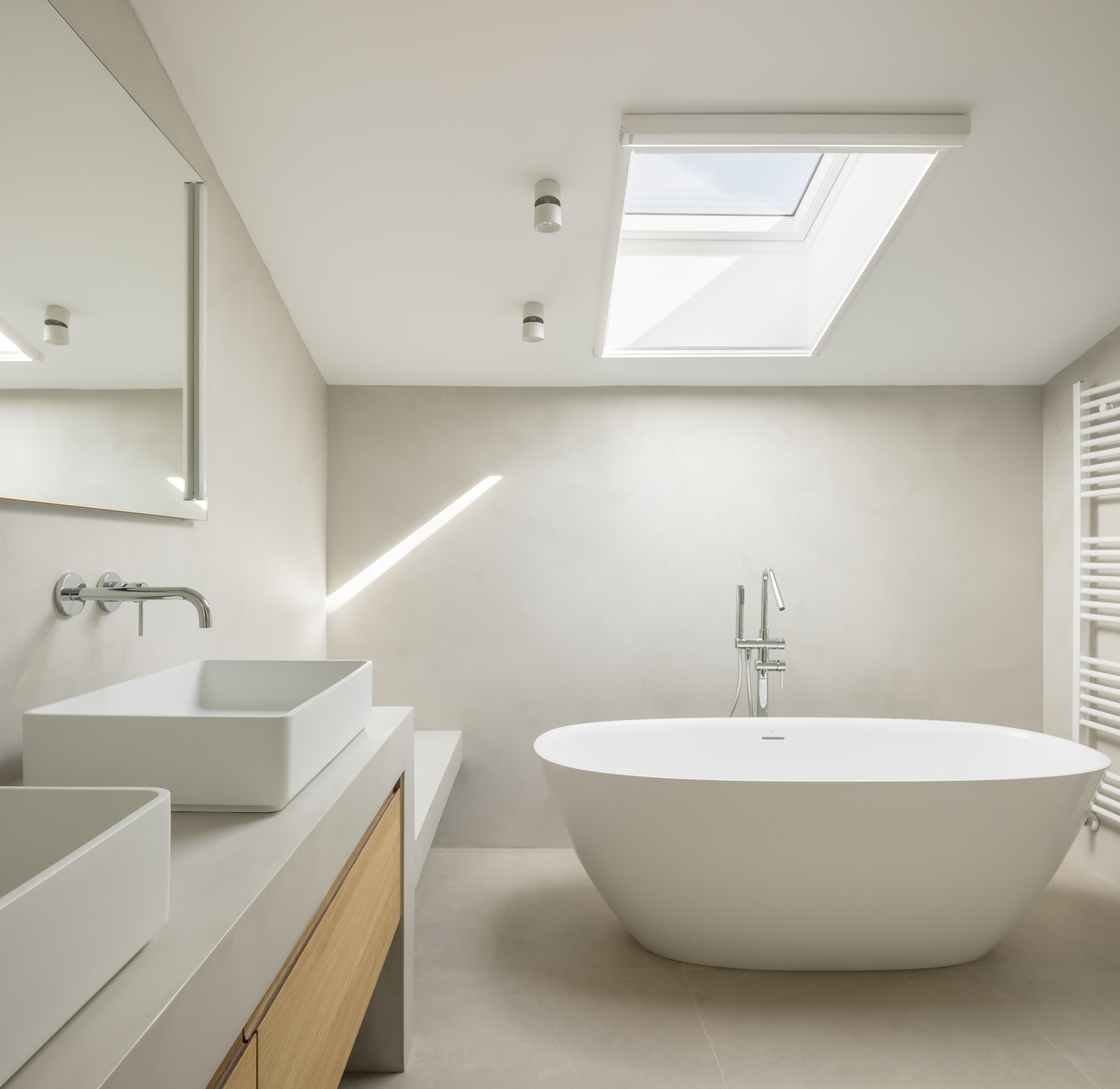 En uno de los baños de la casa proyectamos luz sobre la bañera exenta mediante un lucernario. Gracias a esta iluminación natural, aportamos confortabilidad y sofisticación, a la vez que privacidad. Además, colocamos un banco continuo de microcemento de Topciment que sirve de soporte para los lavabos, así como de asiento. Este mismo material en un tono gris, lo empleamos para las paredes.