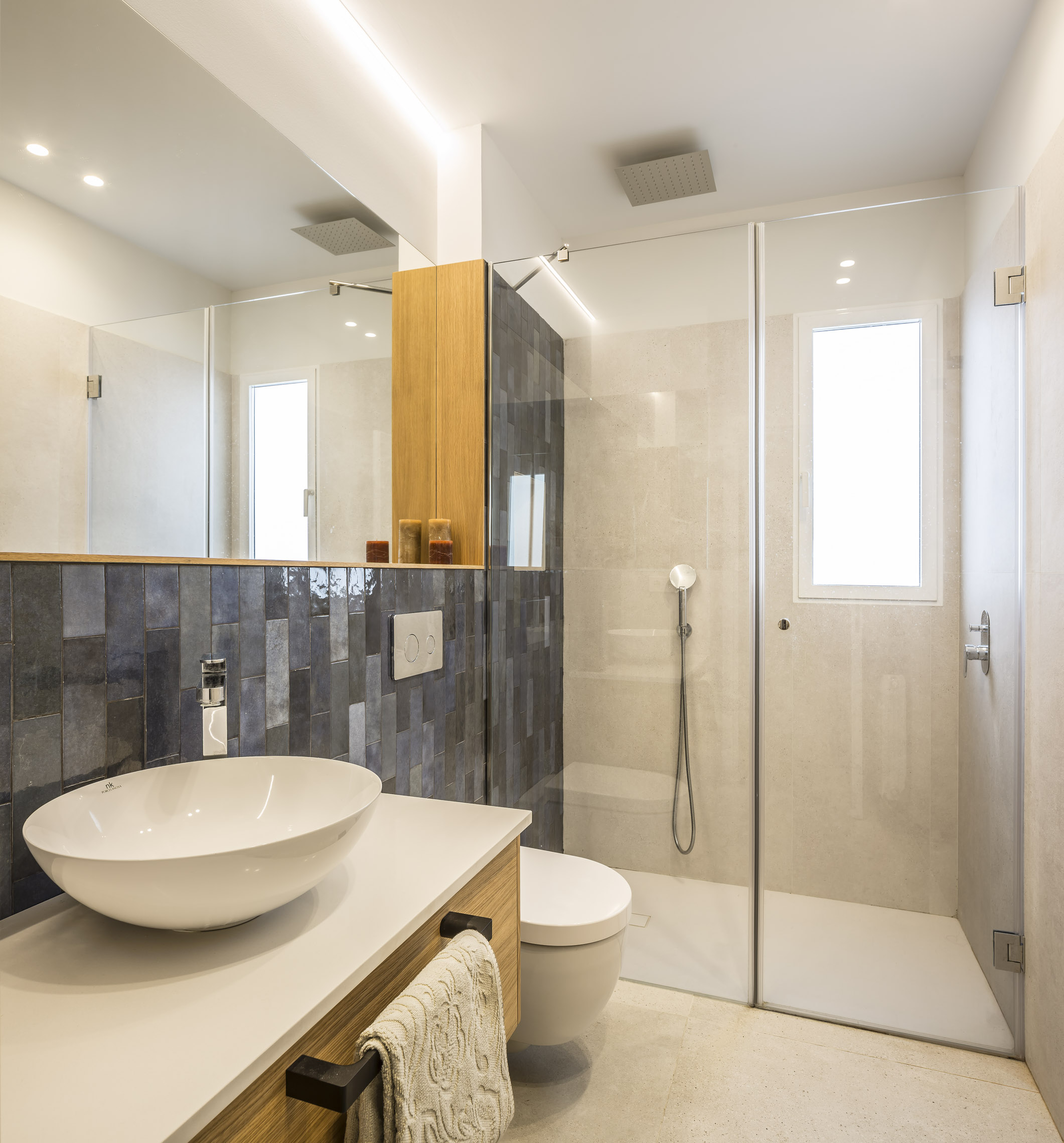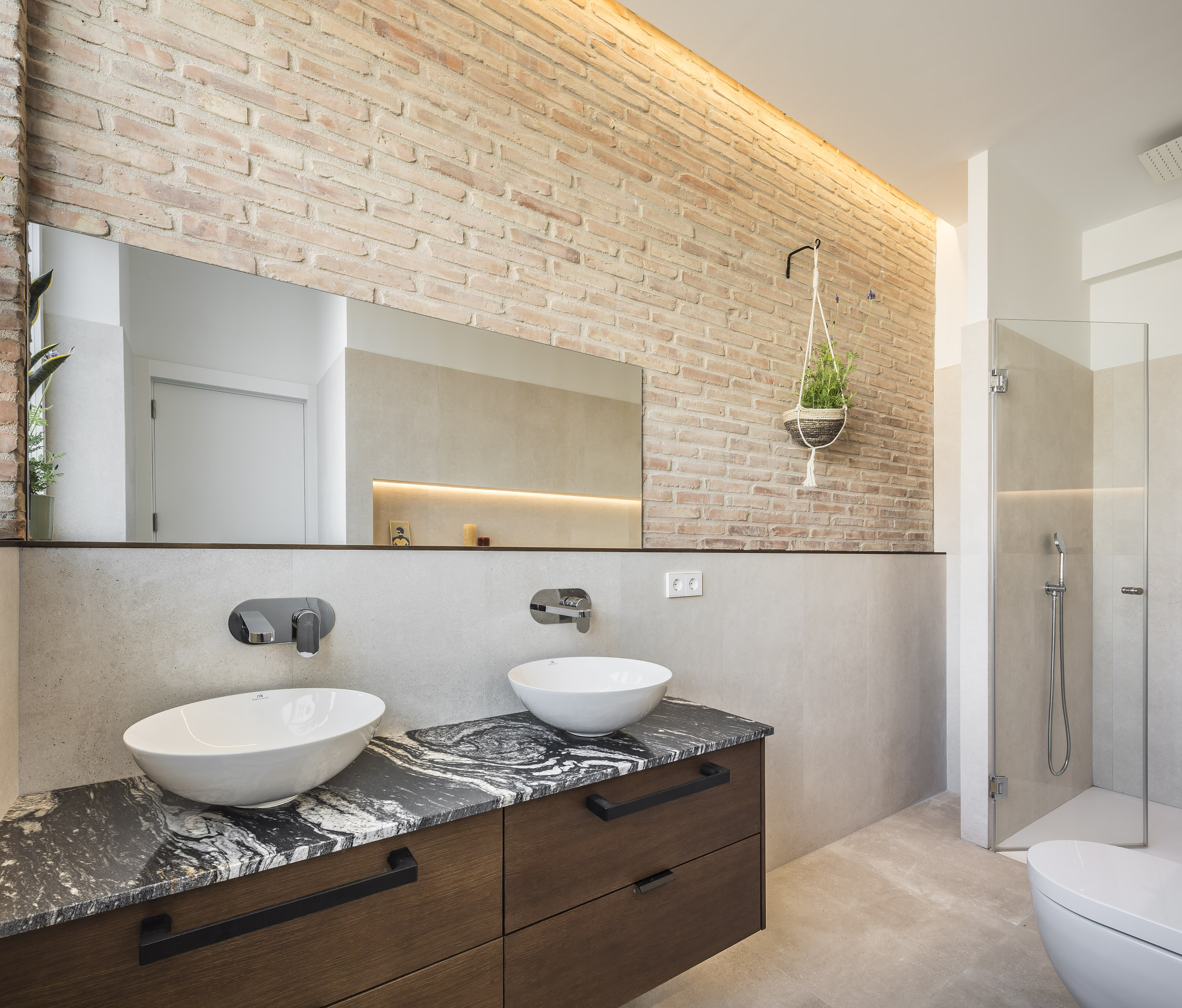 Los baños mantienen el carácter sobrio de la vivienda pero con toques especiales como el ladrillo visto.