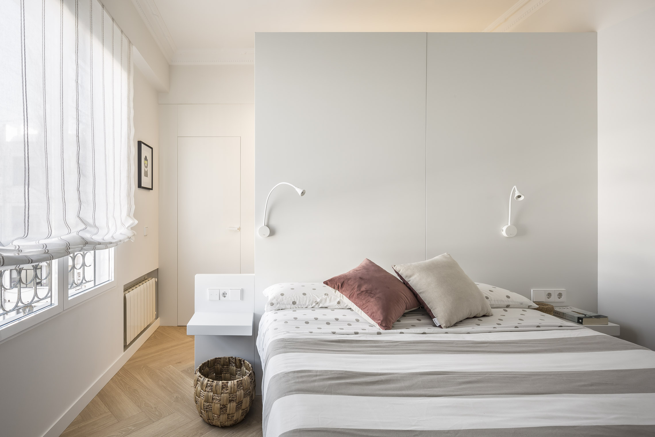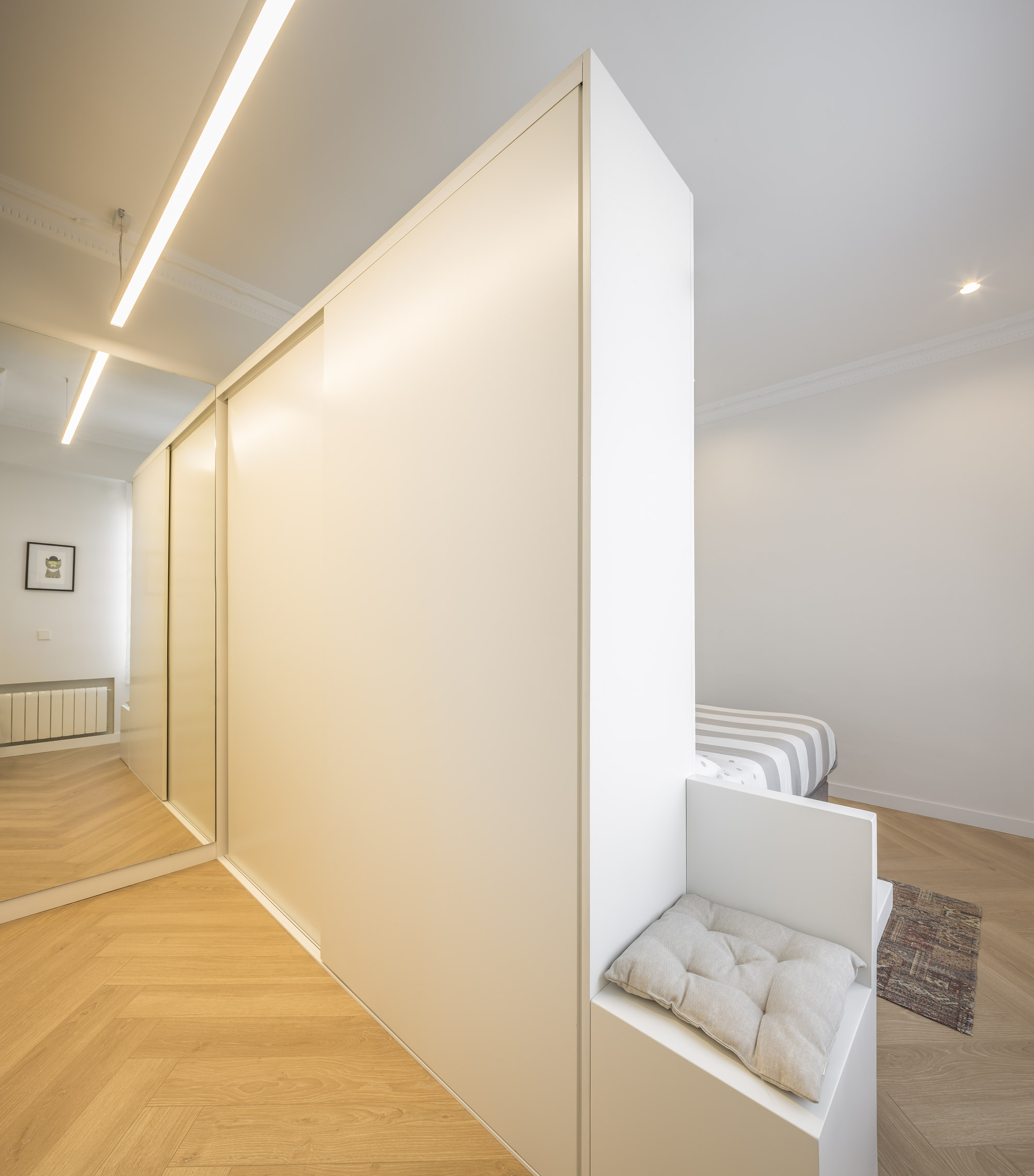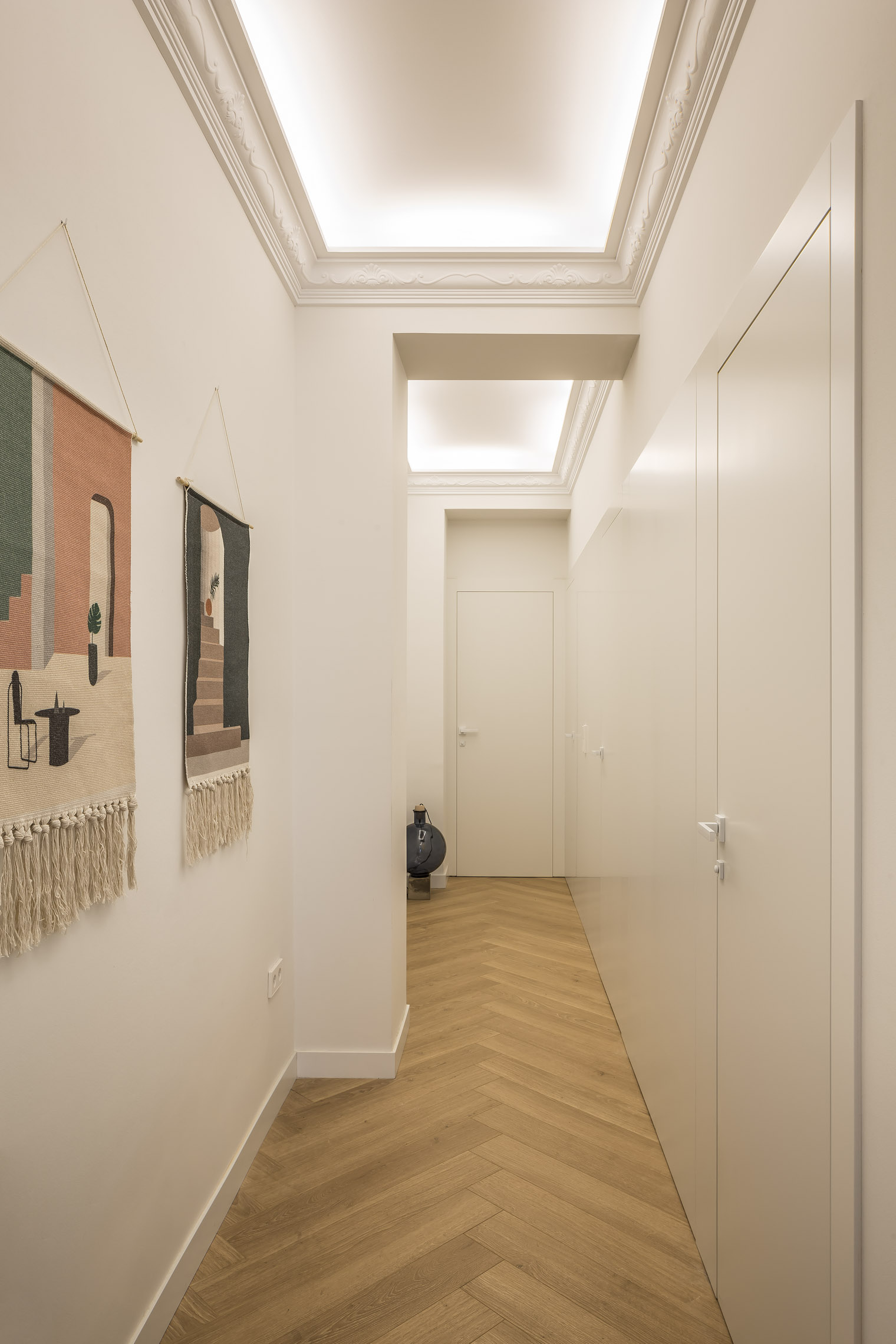 Se mantiene la gran altura de la vivienda, respetando molduras antiguas y creando otras nuevas. La carpintería es de madera lacada en blanco.
