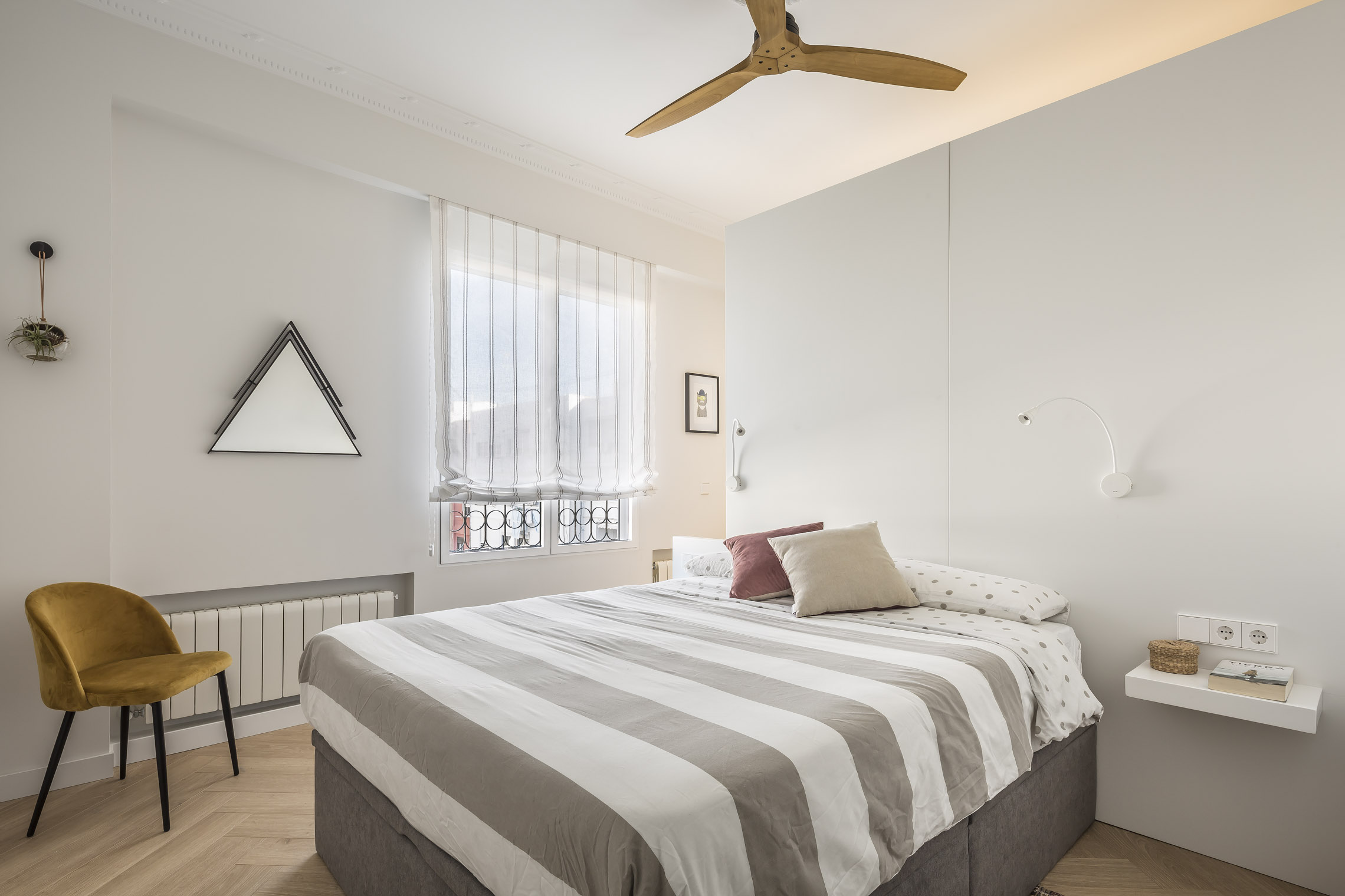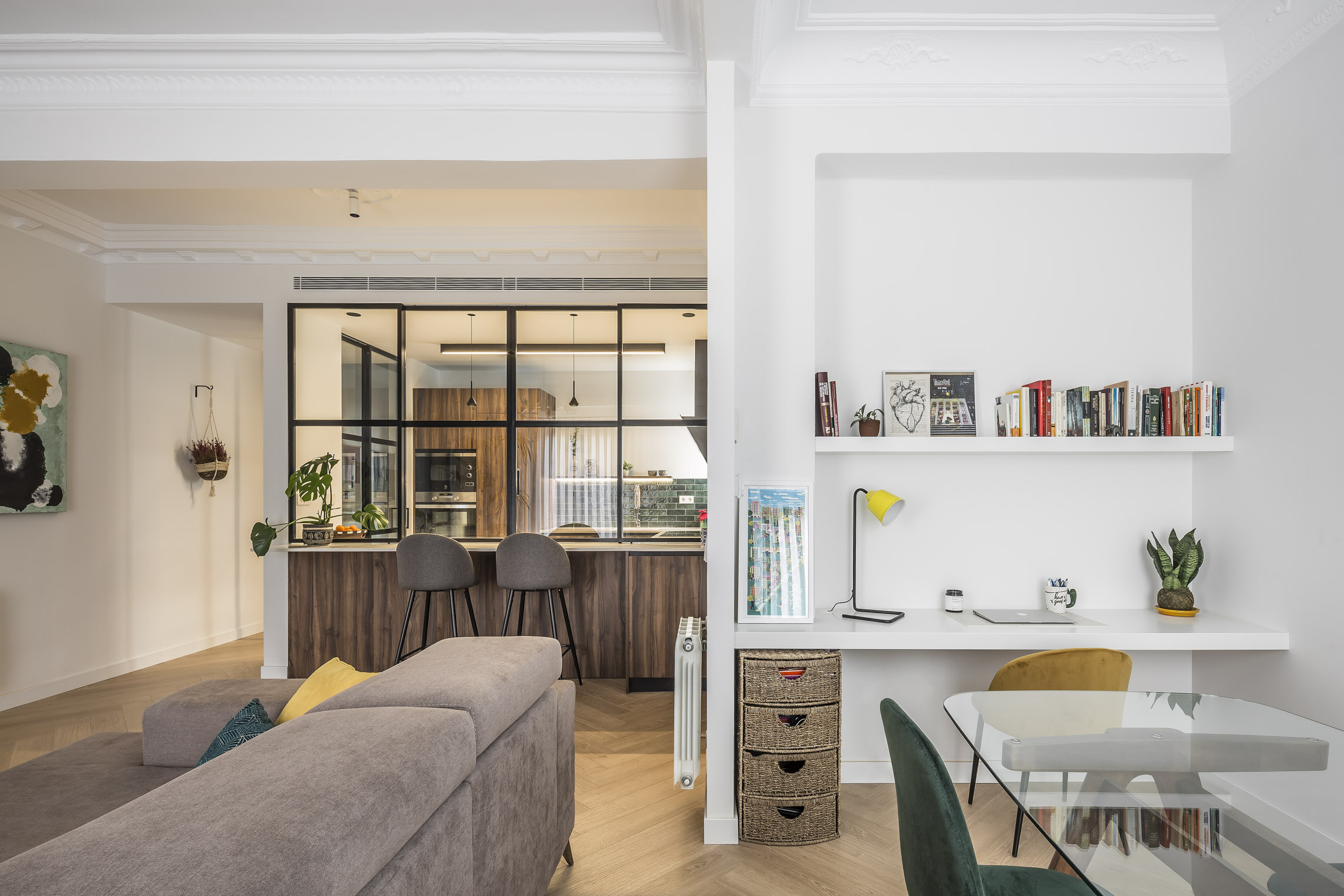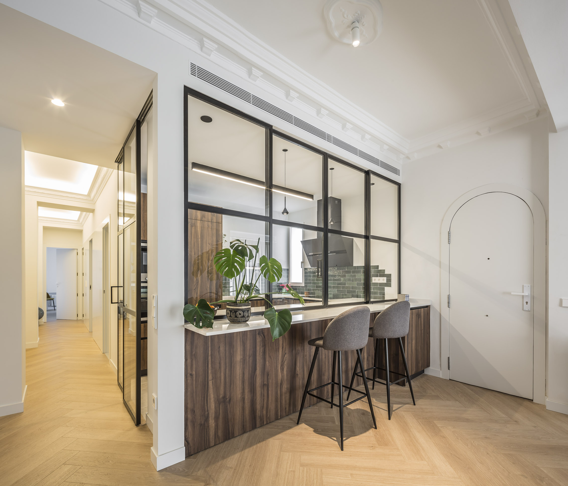 Se mantiene la gran altura de la vivienda, respetando molduras antiguas y creando otras nuevas. La carpintería es de madera lacada en blanco.