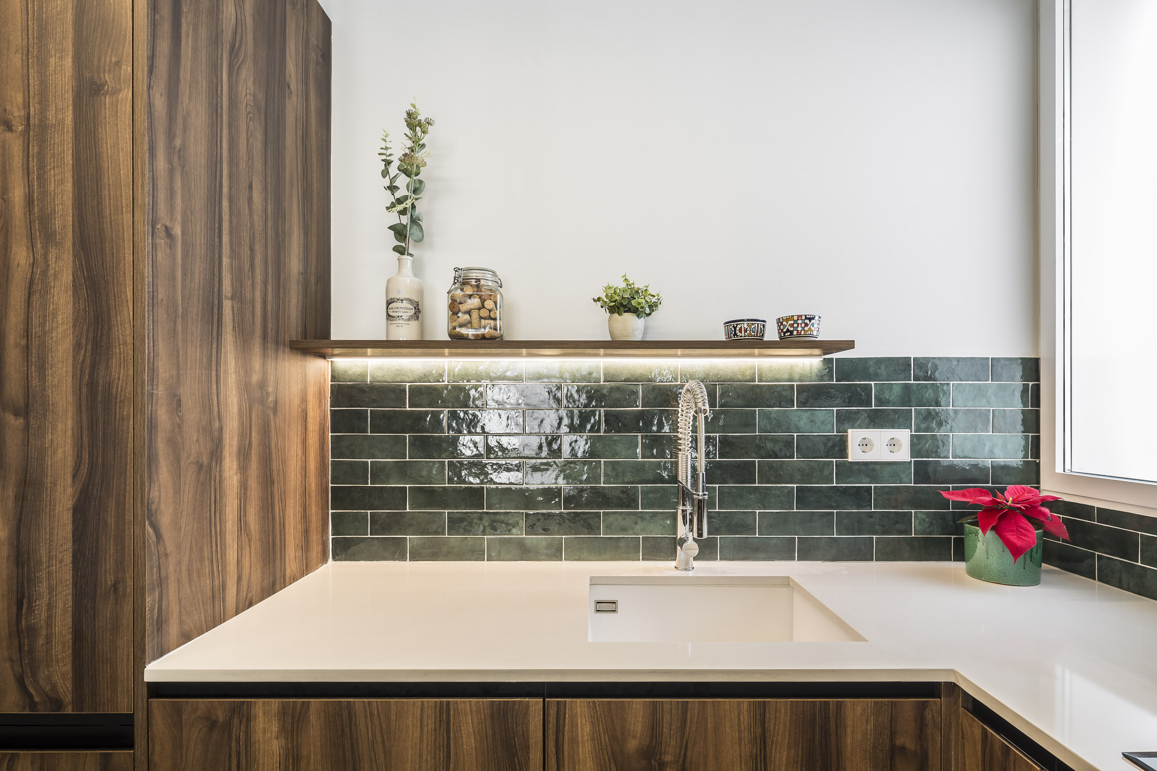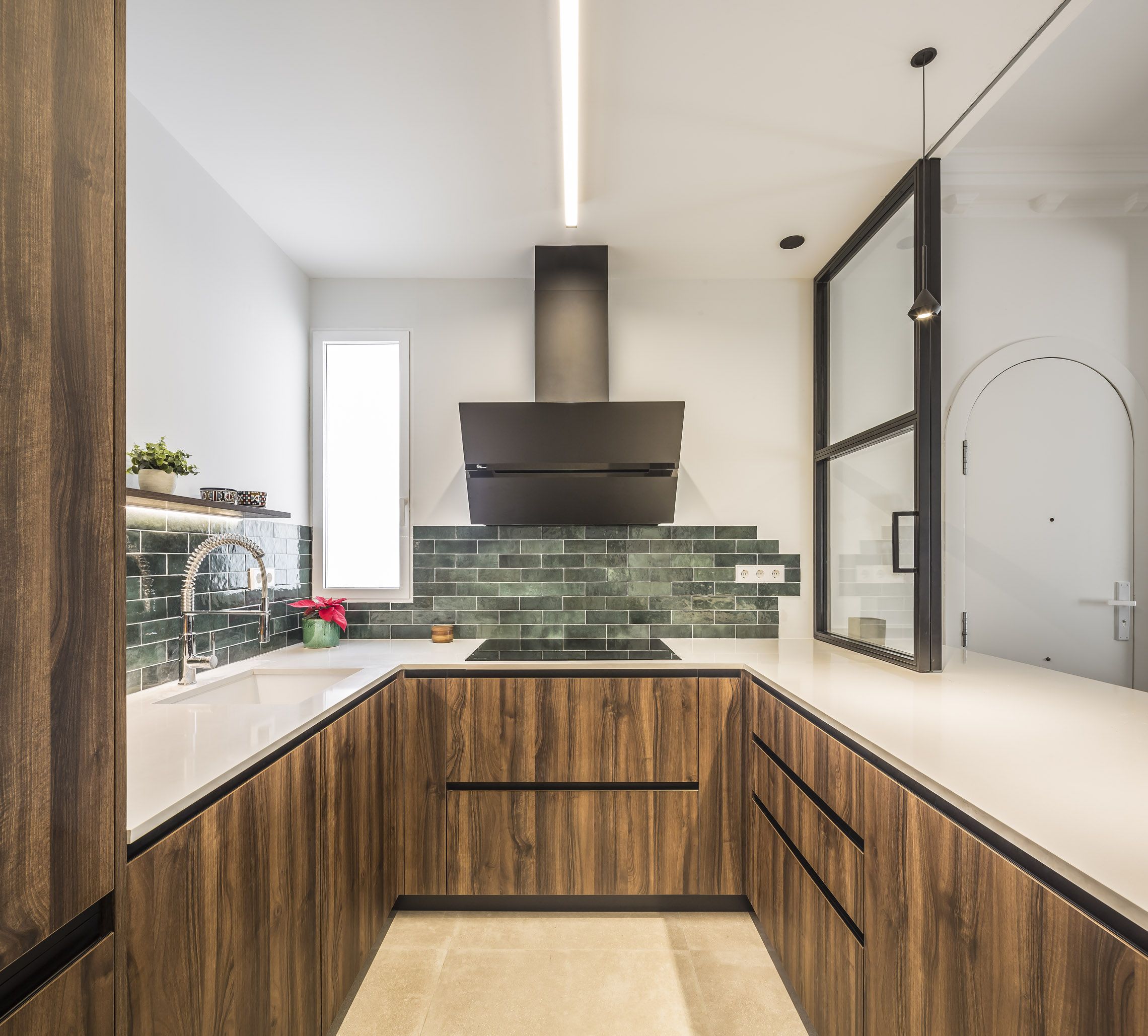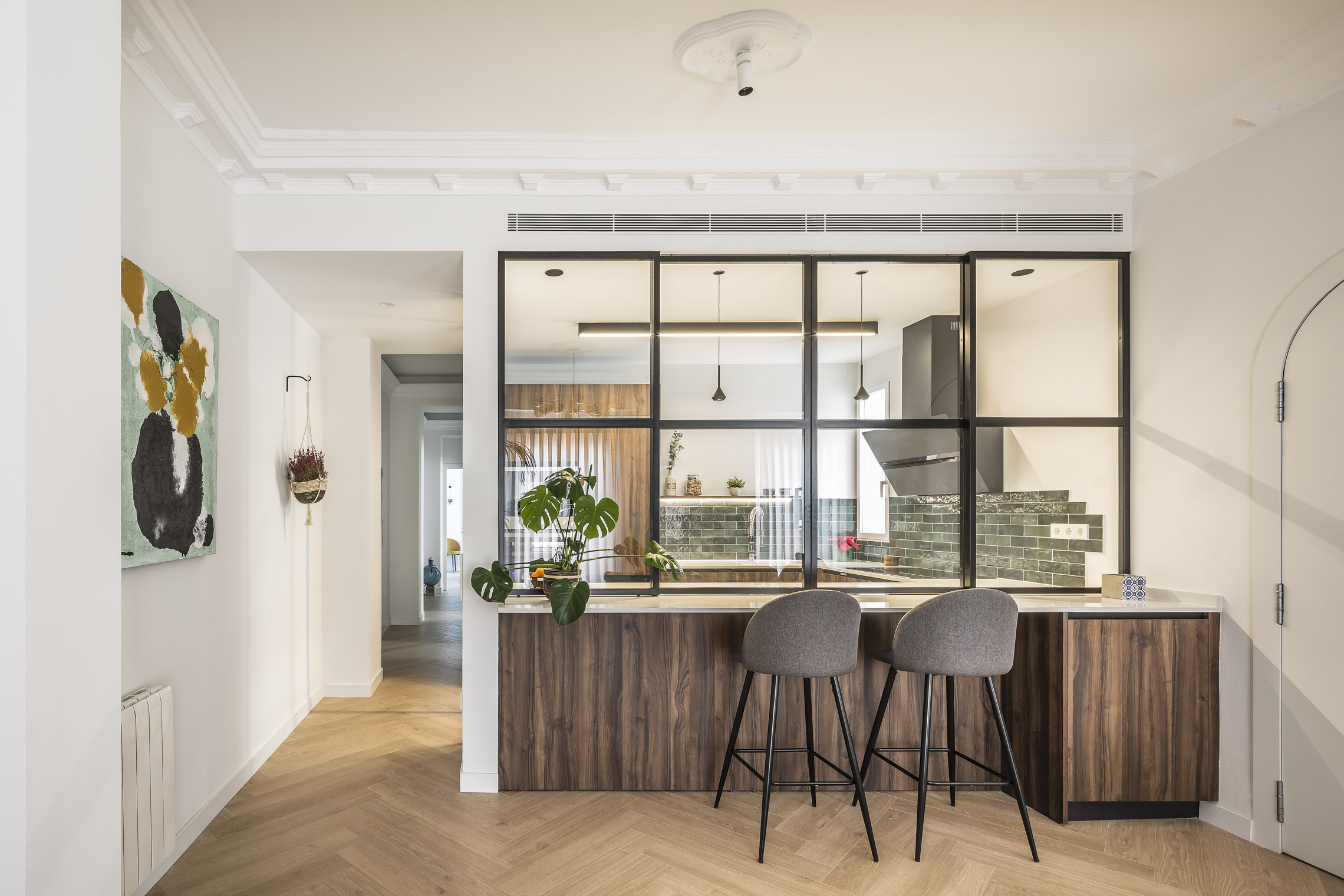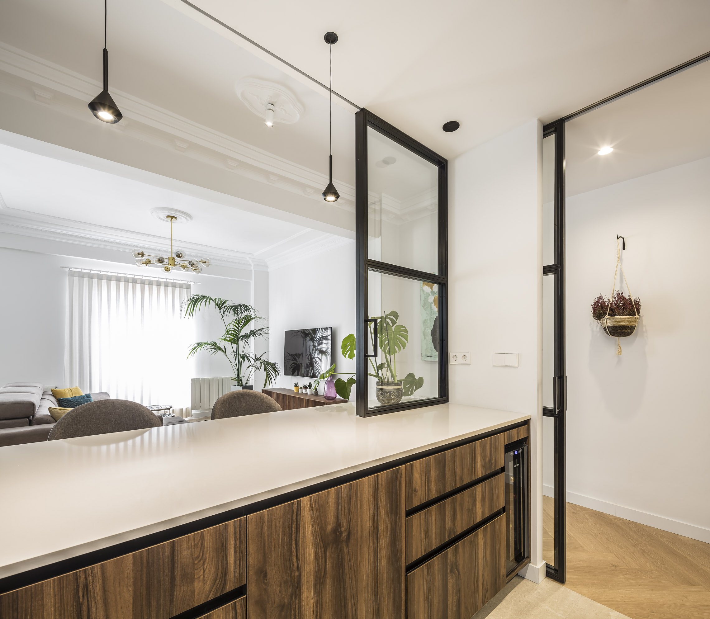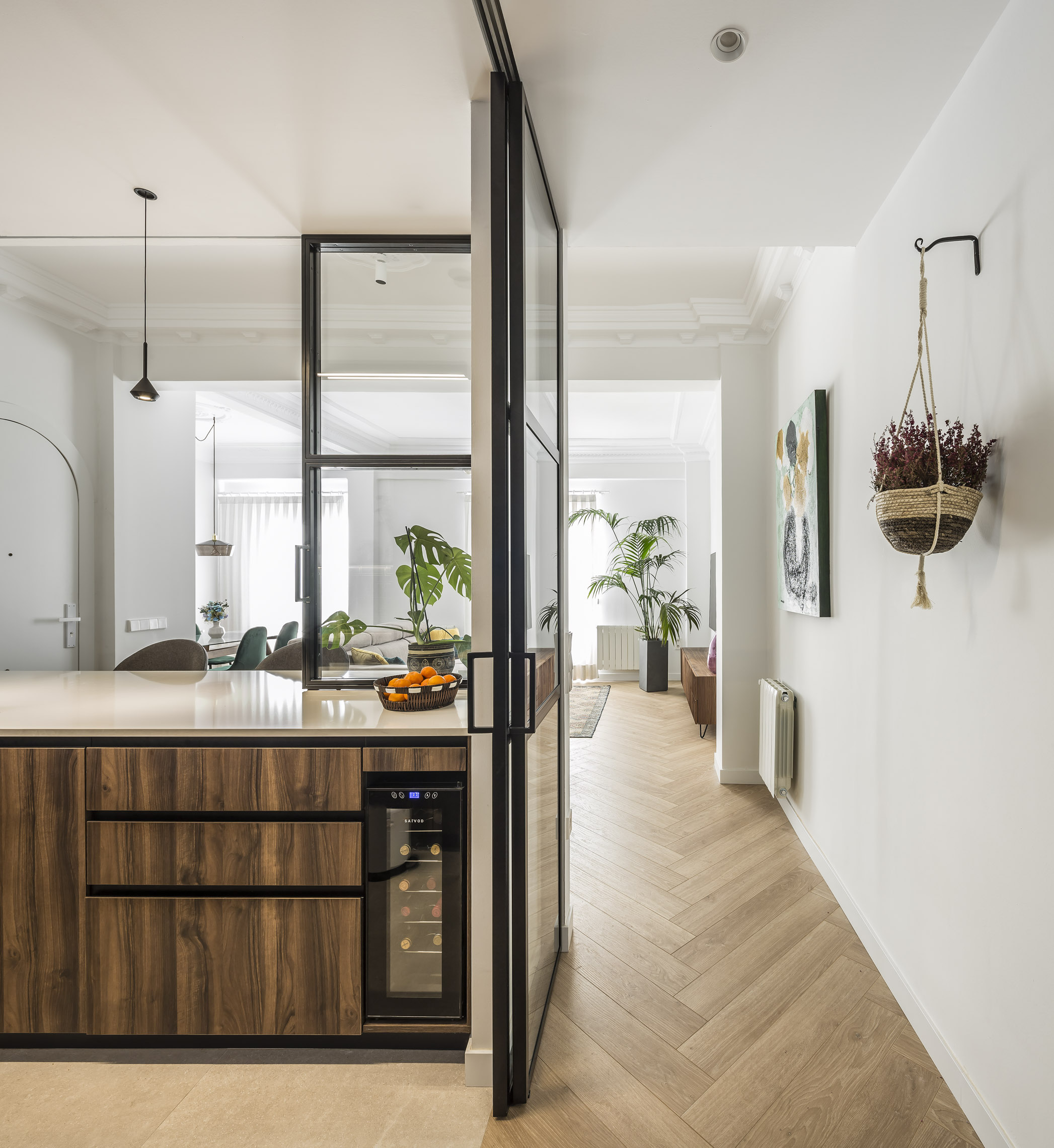 La zona de día se caracteriza por tener una cocina semiabierta con una carpintería metálica negra. El pavimento de madera hace que la vivienda tenga mucha calidez.