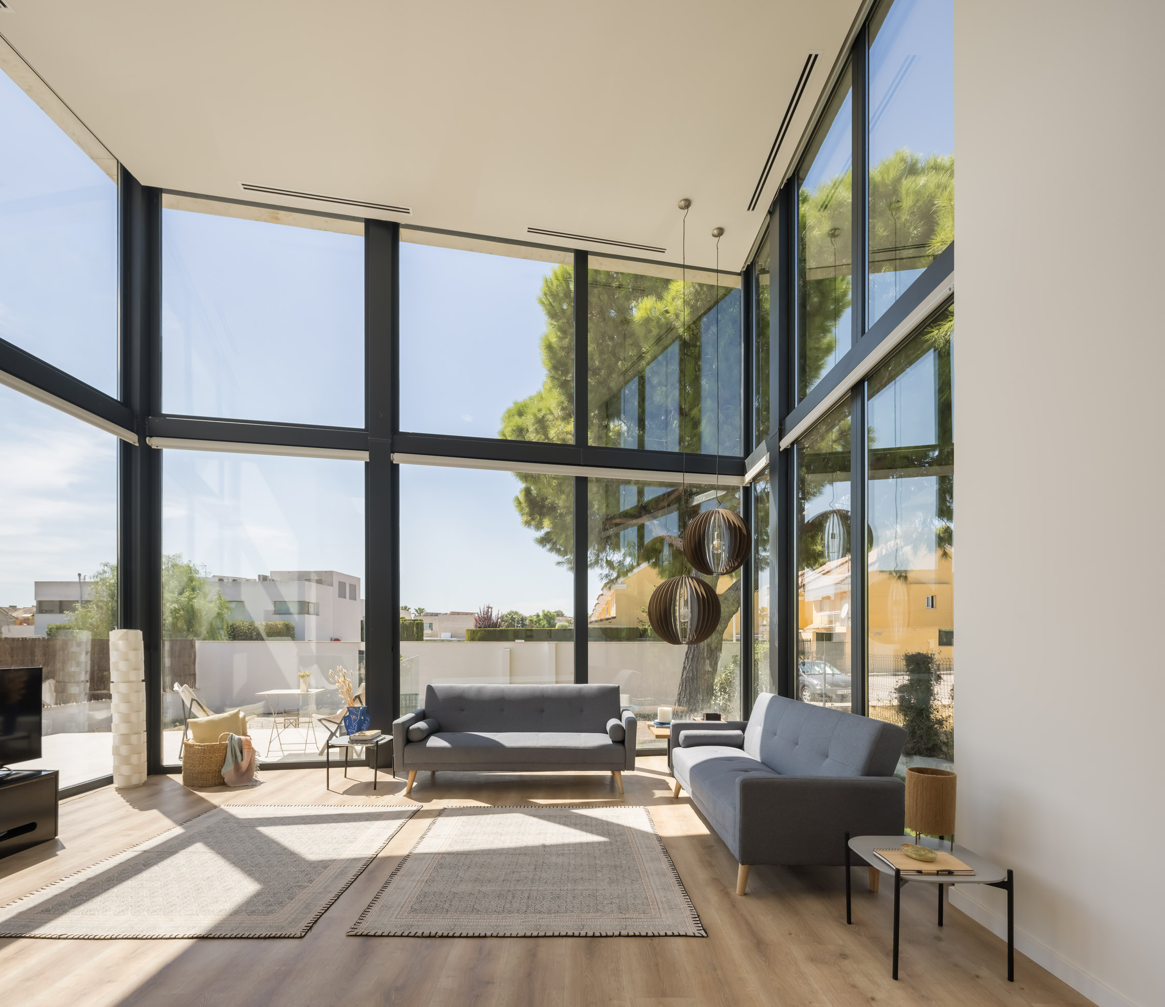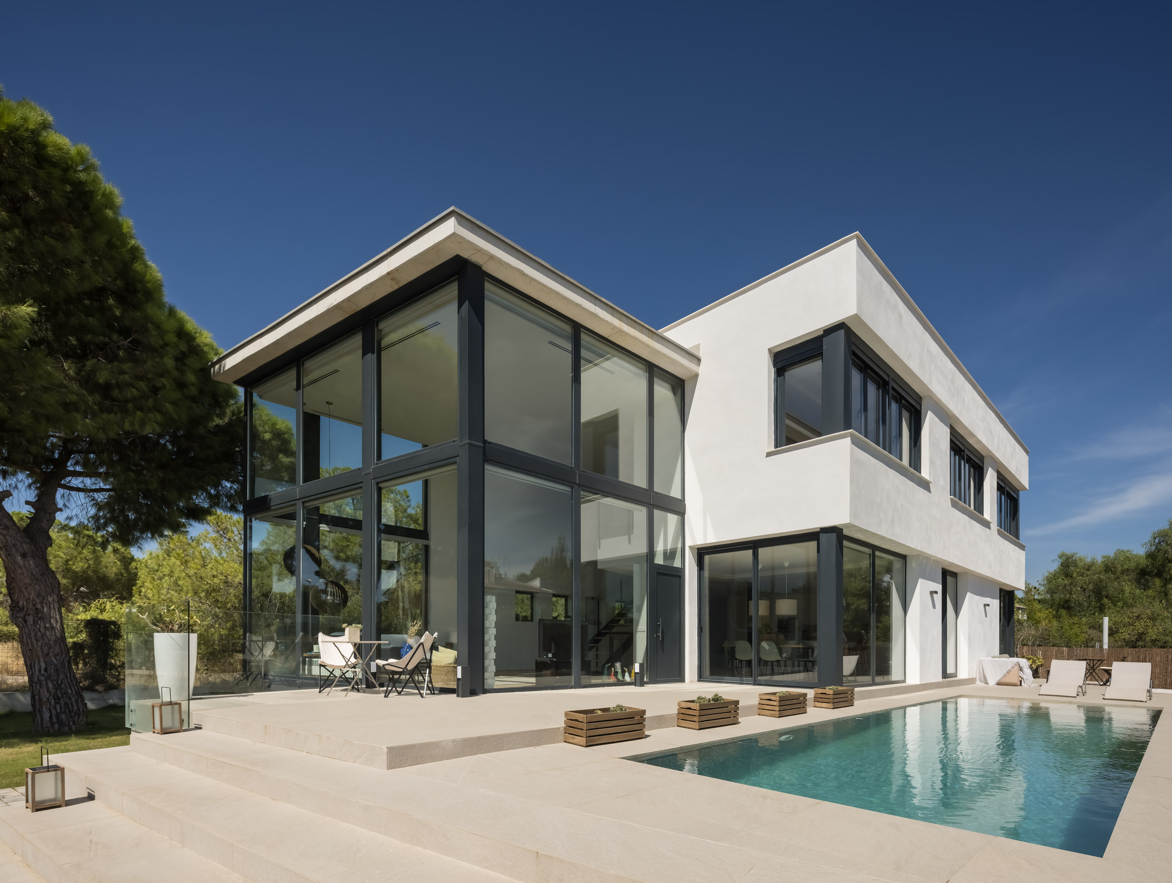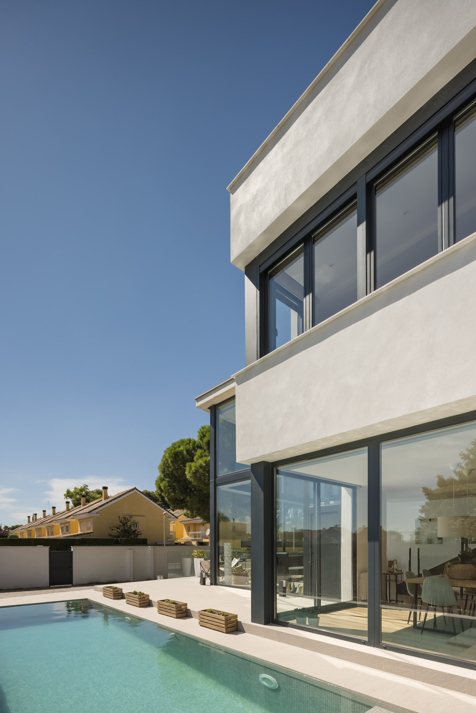 La amplitud de los ventanales son la conexión idónea a la zona exterior, donde se ubican la piscina de obra y el jardín.