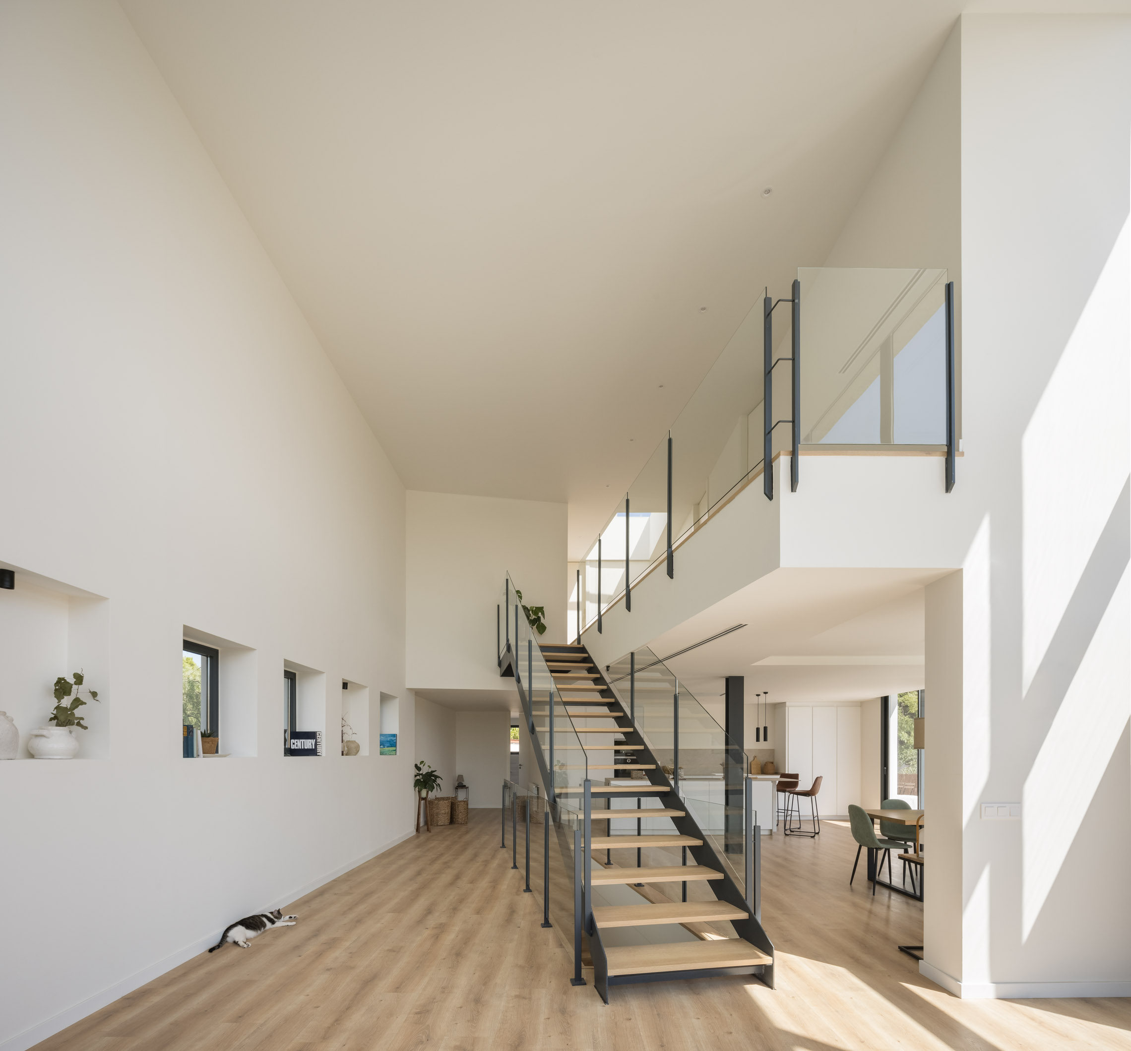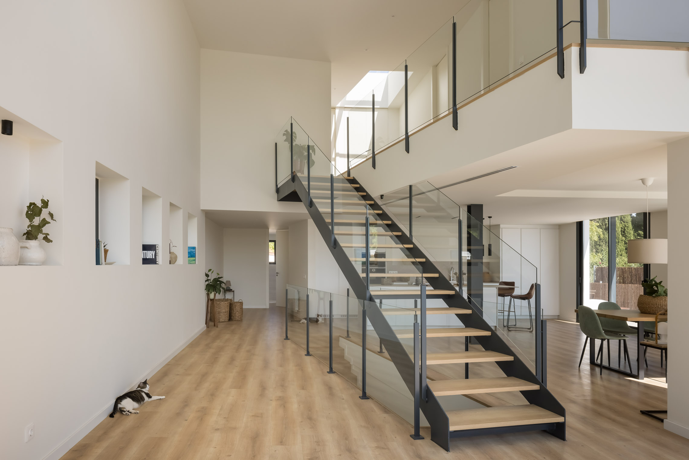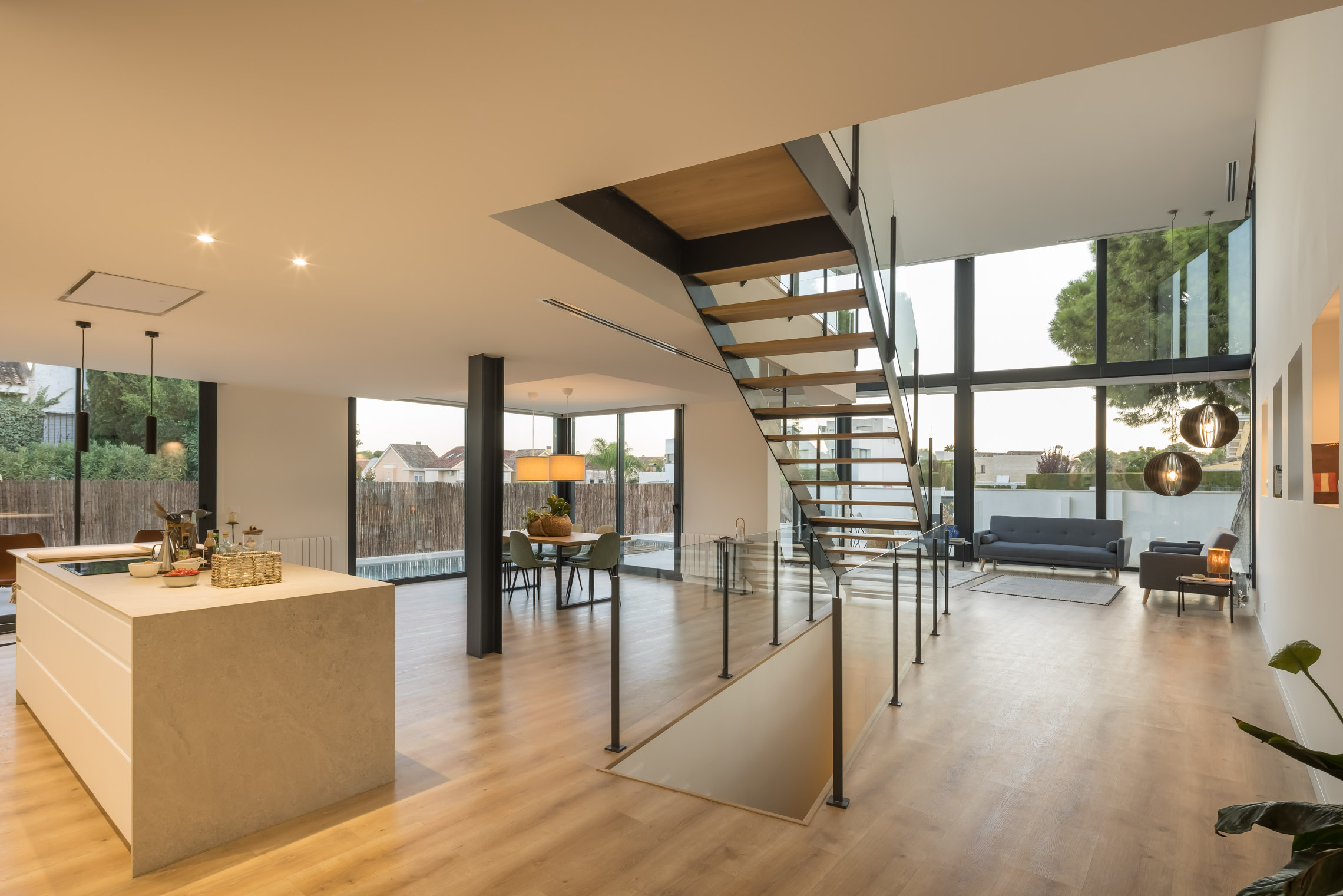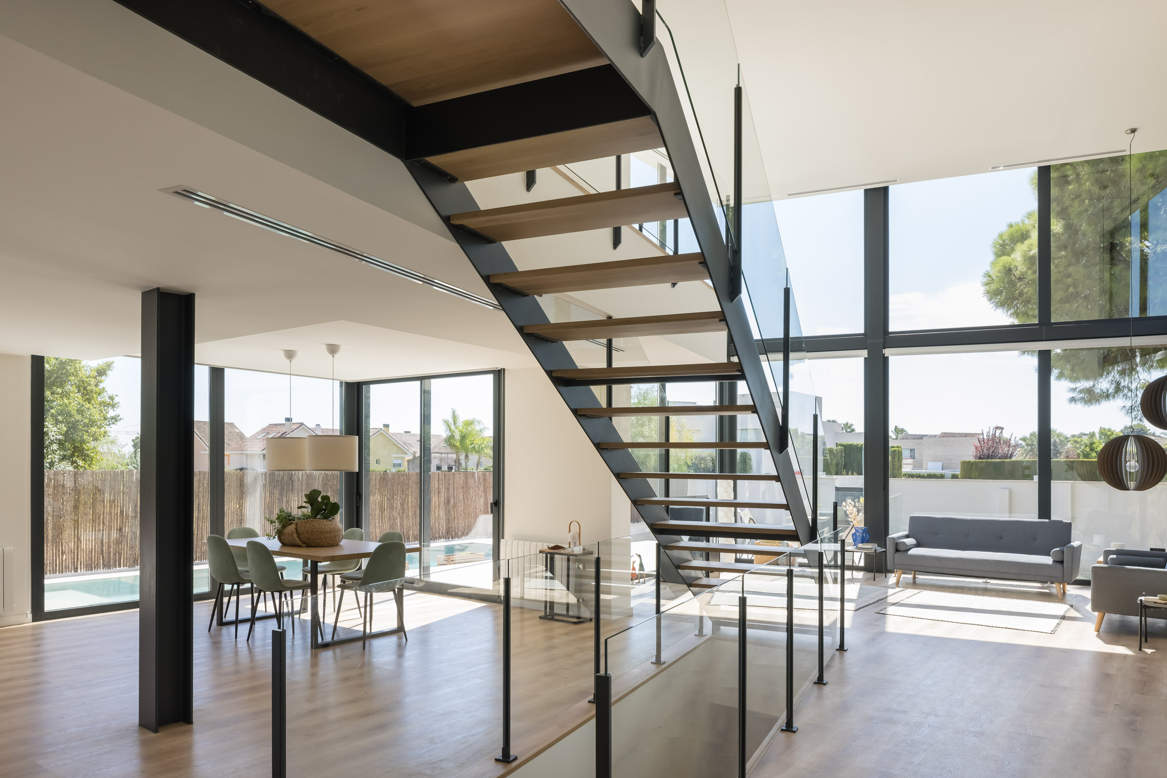 Privacidad, espacio y luz. En este proyecto hemos optado por plasmar dos cuerpos, uno más cerrado que alberga las zonas más personales y otro acristalado en doble altura que se convierte en el epicentro del salón. La escalera, indispensable para comunicar y salvar el desnivel entre los diferentes espacios, crea diversos puntos de vista y perspectivas de esta zona común del interior de la vivienda.