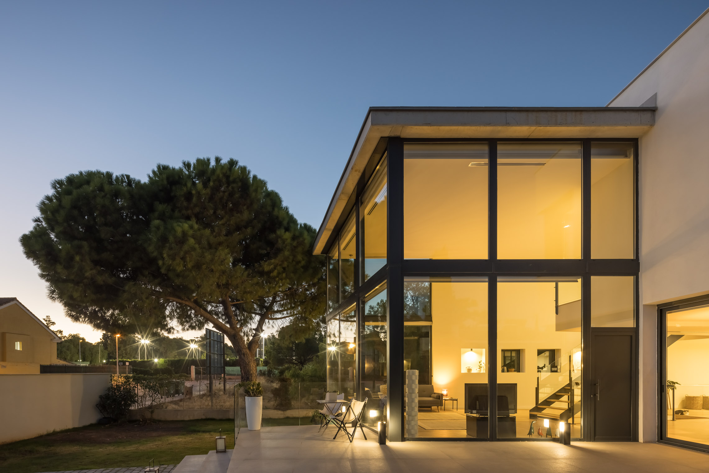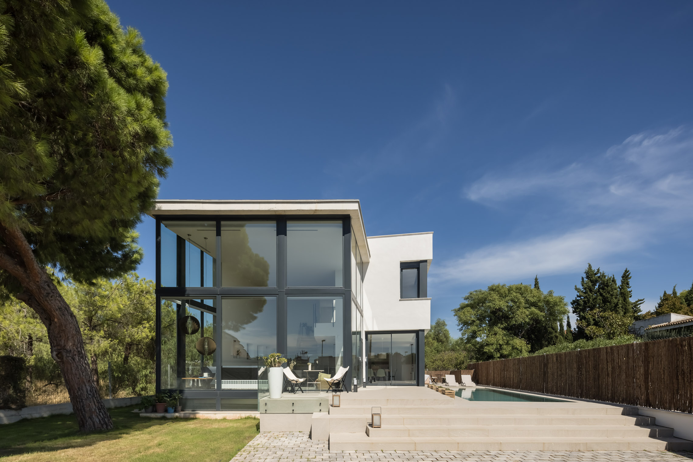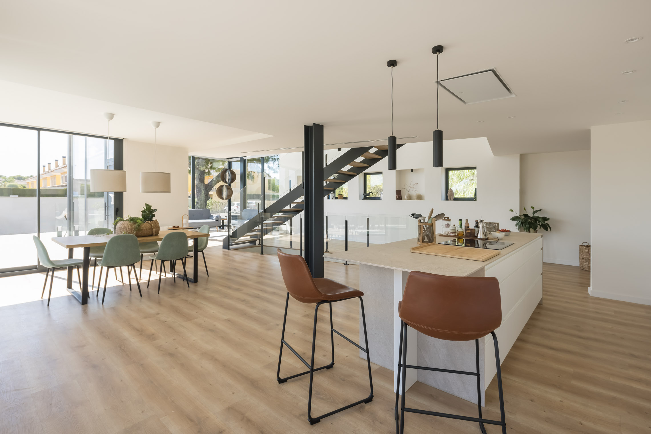 Privacidad, espacio y luz. En este proyecto hemos optado por plasmar dos cuerpos, uno más cerrado que alberga las zonas más personales y otro acristalado en doble altura que se convierte en el epicentro del salón. La escalera, indispensable para comunicar y salvar el desnivel entre los diferentes espacios, crea diversos puntos de vista y perspectivas de esta zona común del interior de la vivienda.