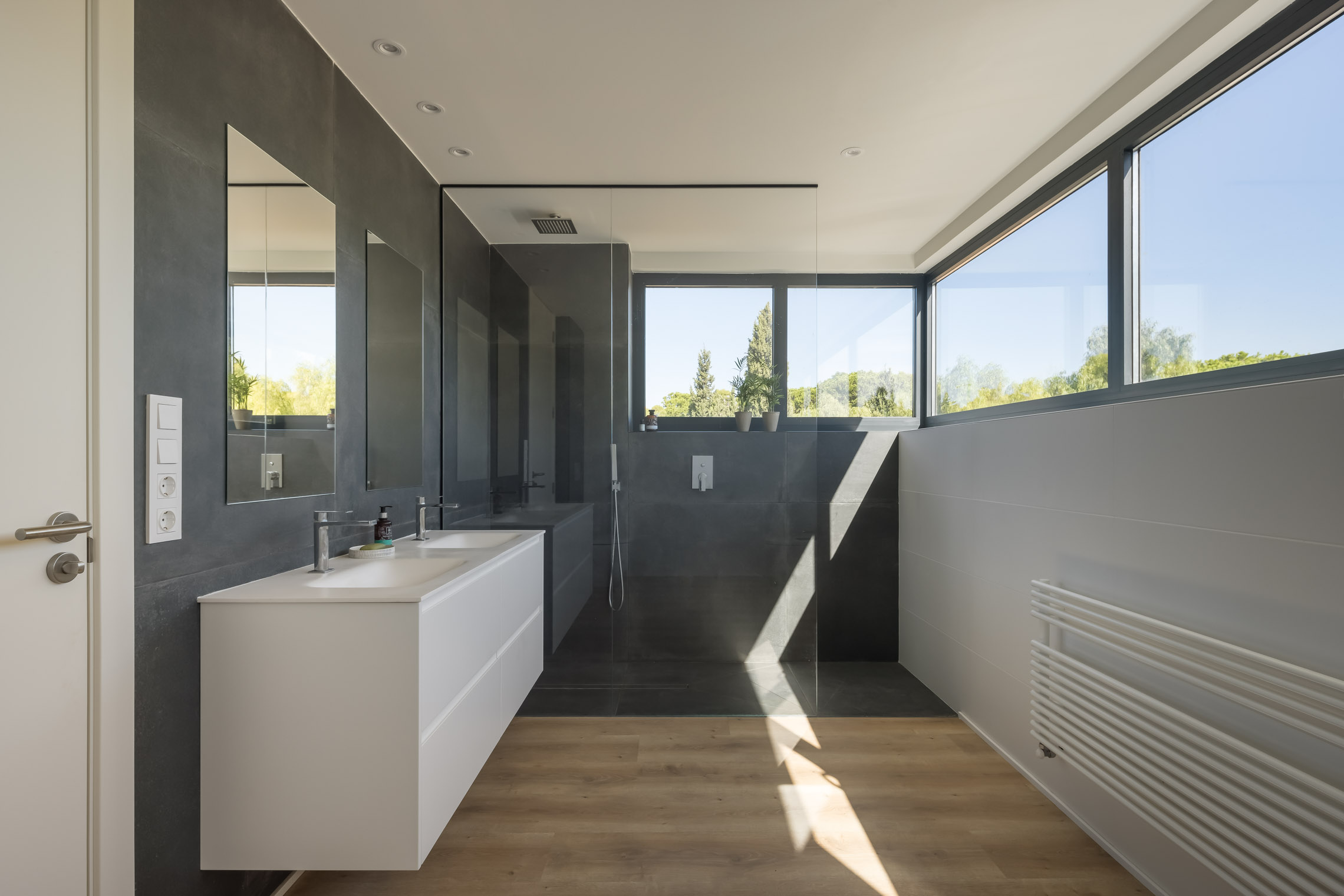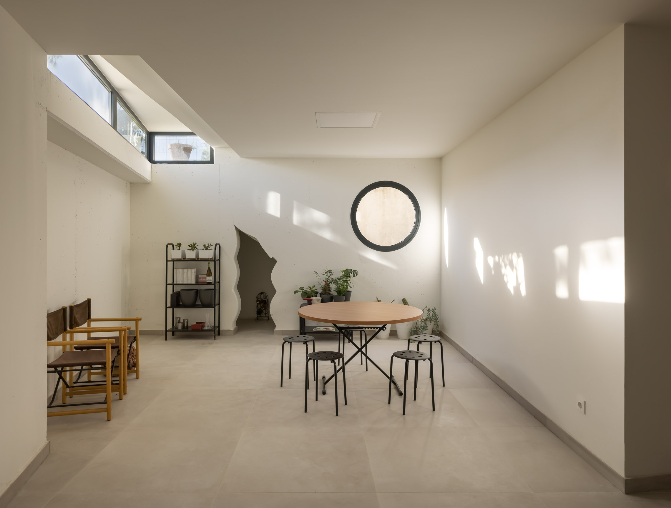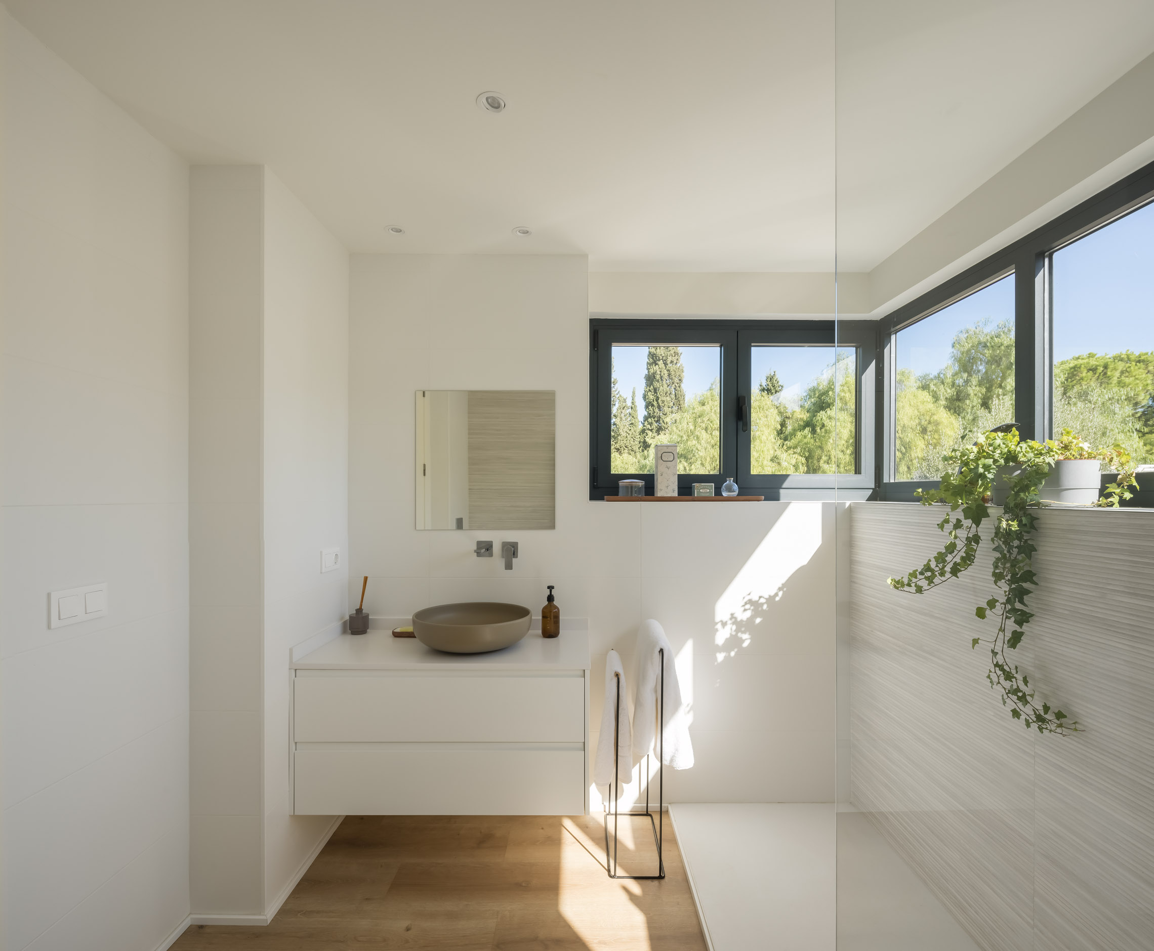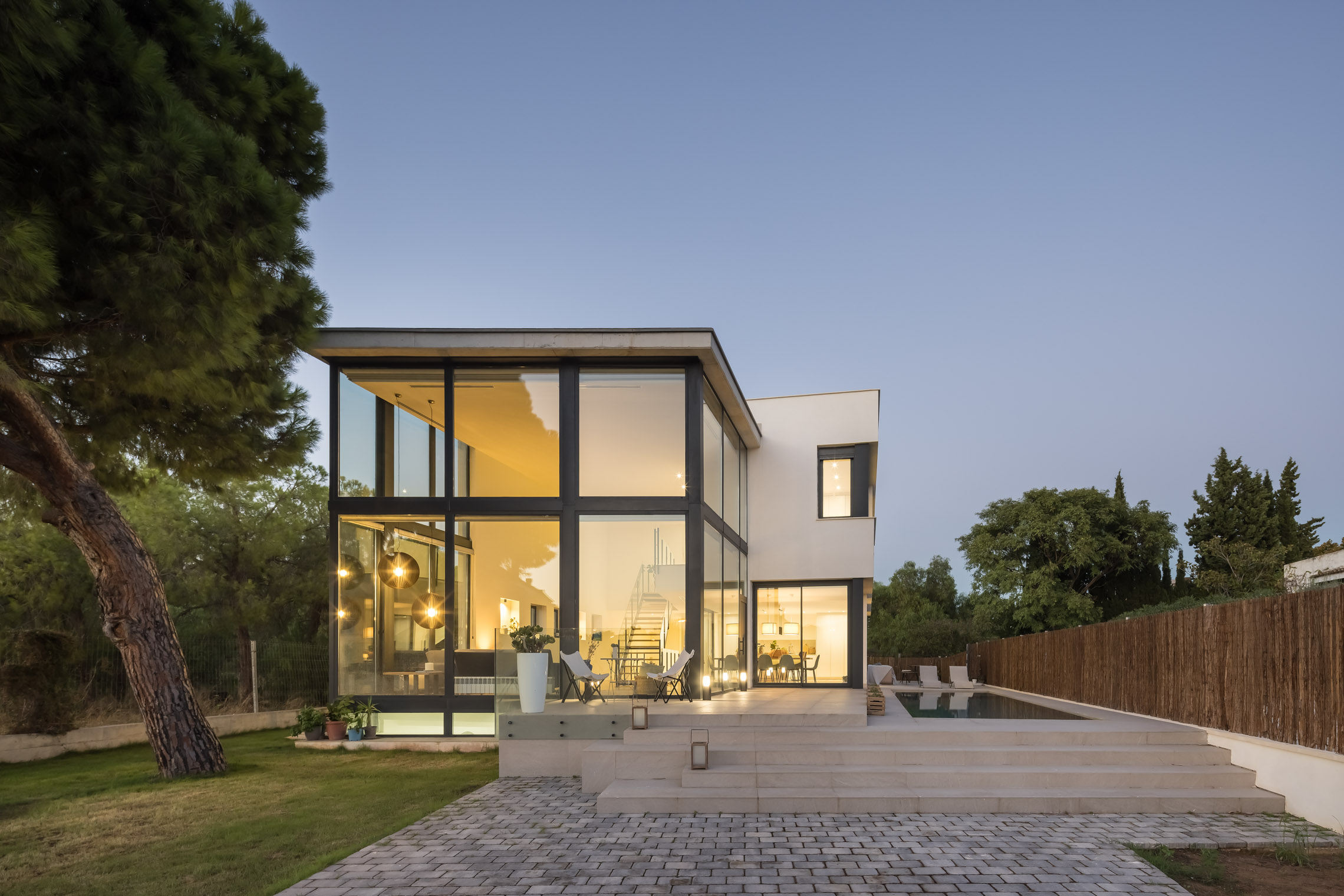 Privacidad, espacio y luz. En este proyecto hemos optado por plasmar dos cuerpos, uno más cerrado que alberga las zonas más personales y otro acristalado en doble altura que se convierte en el epicentro del salón. La escalera, indispensable para comunicar y salvar el desnivel entre los diferentes espacios, crea diversos puntos de vista y perspectivas de esta zona común del interior de la vivienda.